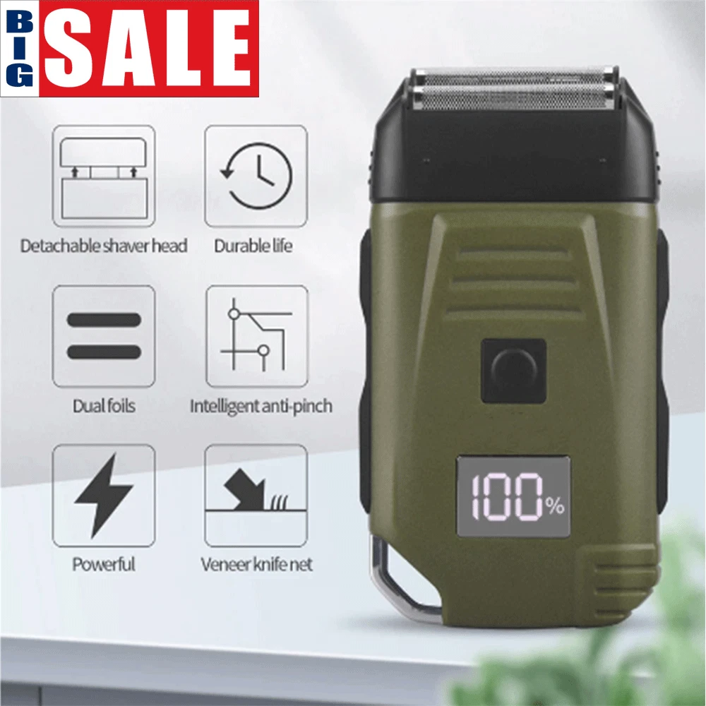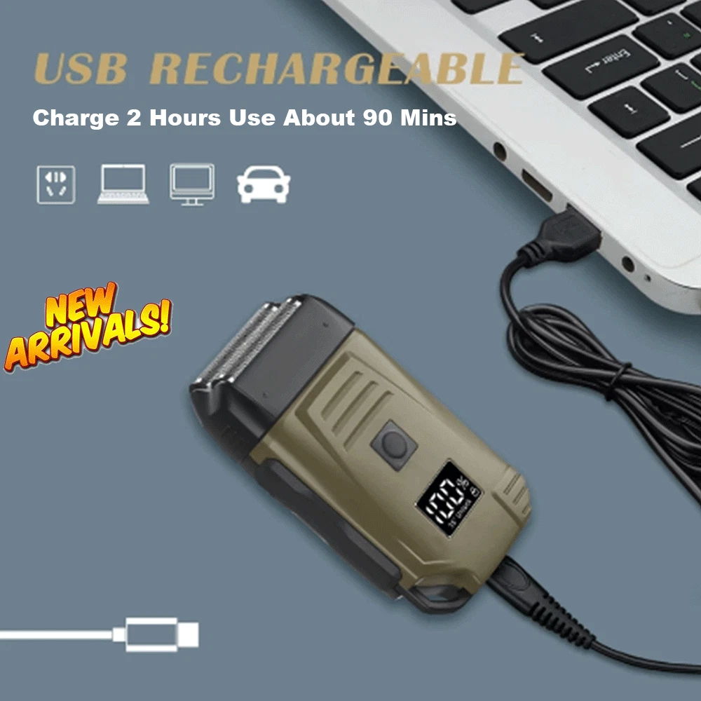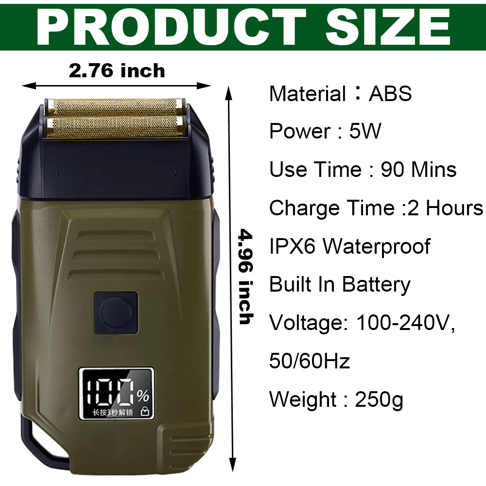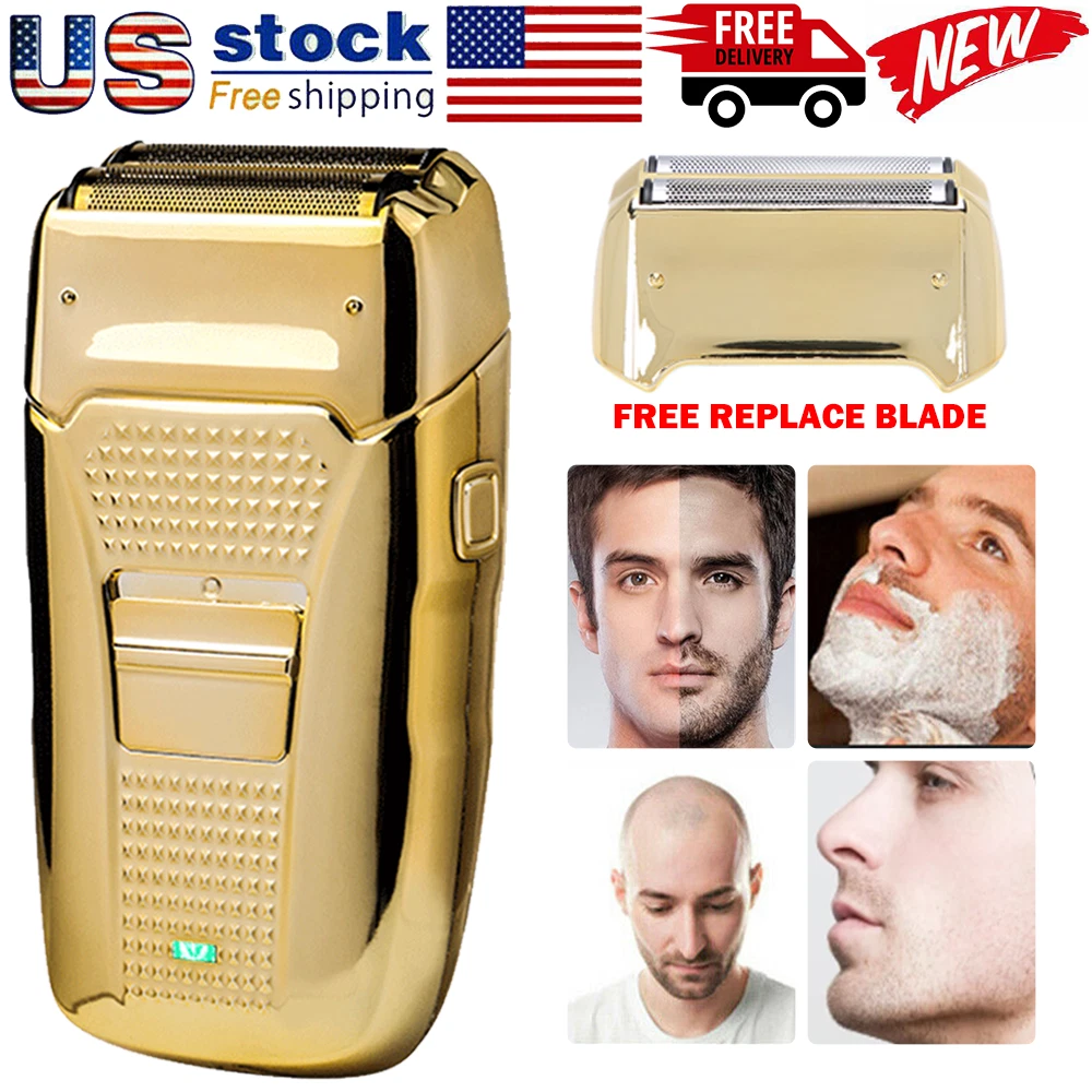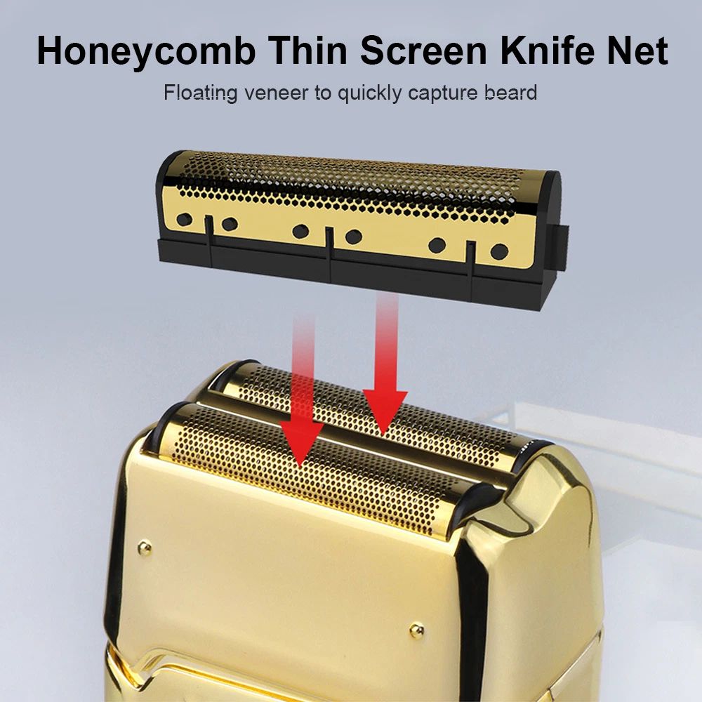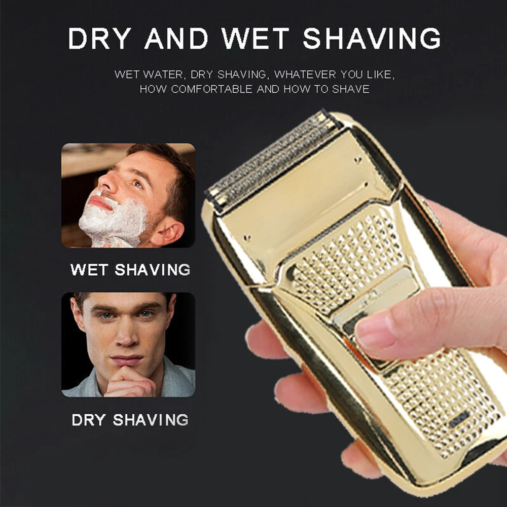 Des c ri p tion: Comfortably Fits Facial Contours: Alternate shaving design, elastic facial adjustment system, conforms comfortably to facial contours, no residue after shaving. Double Blade Design: Slim Screen Knife Net, Floating Face Adjustment to Quickly Capture Beard. Double blade design, fast cutting beards, incisive and not glued. Dual-purpose charging plug: Dual-use charging and plug, USB charging design, equipped with USB charging cable, can be connected to a variety of USB power ports, convenient charging. Multifunctional: Multifunctional, can be used to shave the bald head and shave the beard. Conforms to the ergonomic design, easy to grip and use. Easy to carry: Light and small in size, equipped with a storage bag, easy to carry when going out. Condition: 100% Brand New Item Type: Razor Material: ABS Color: Gold/Gray Power: 3w Charging Time: 5 Hours Use Time: 50 Minutes Battery: Lithium Battery 600mAh Battery Model: 14500 Razor Size: Approx. 12.5 x 6.5 x 3cm / 4.9 x 2.6 x 1.2in Weight : 270g(with box) Package List: 1 x Razor 1 x Storage Bag 1 x Transparent Cover 1 x Head Cover 2 x Half-Round Knife 1 x Cleaning Brush 1 x Manual 1 x USB Charging Cable