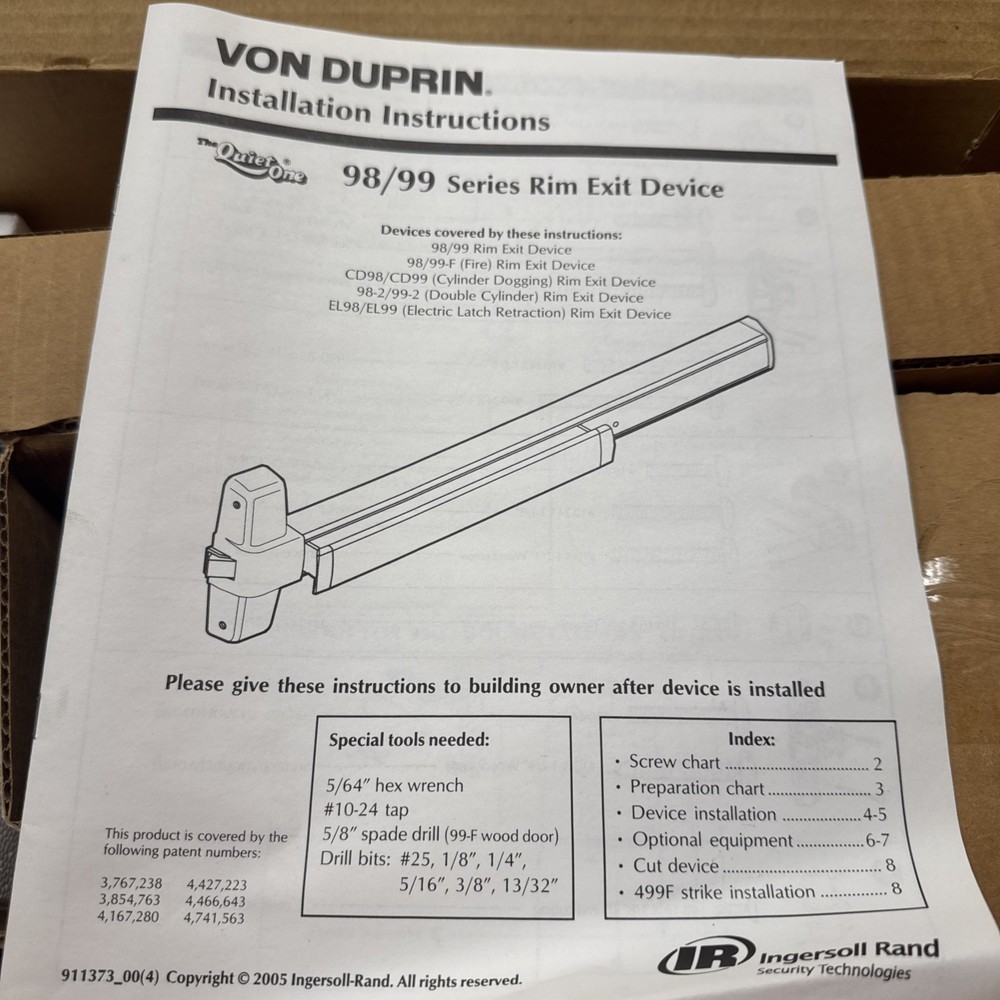 The NEW Von Duprin/Ingersoll-Rand 98/99 Series Rim Exit Device is a high-quality, commercial-grade product designed for heavy-duty use. Made in the United States, this exit device comes in a sleek silver color and includes all necessary components such as a latch, fasteners, instructions, and hardware for easy installation. With the Von Duprin brand name known for reliability and durability, this product ensures security and access control for your business or property. Plus, with free shipping included, it's a convenient and cost-effective option for your needs.