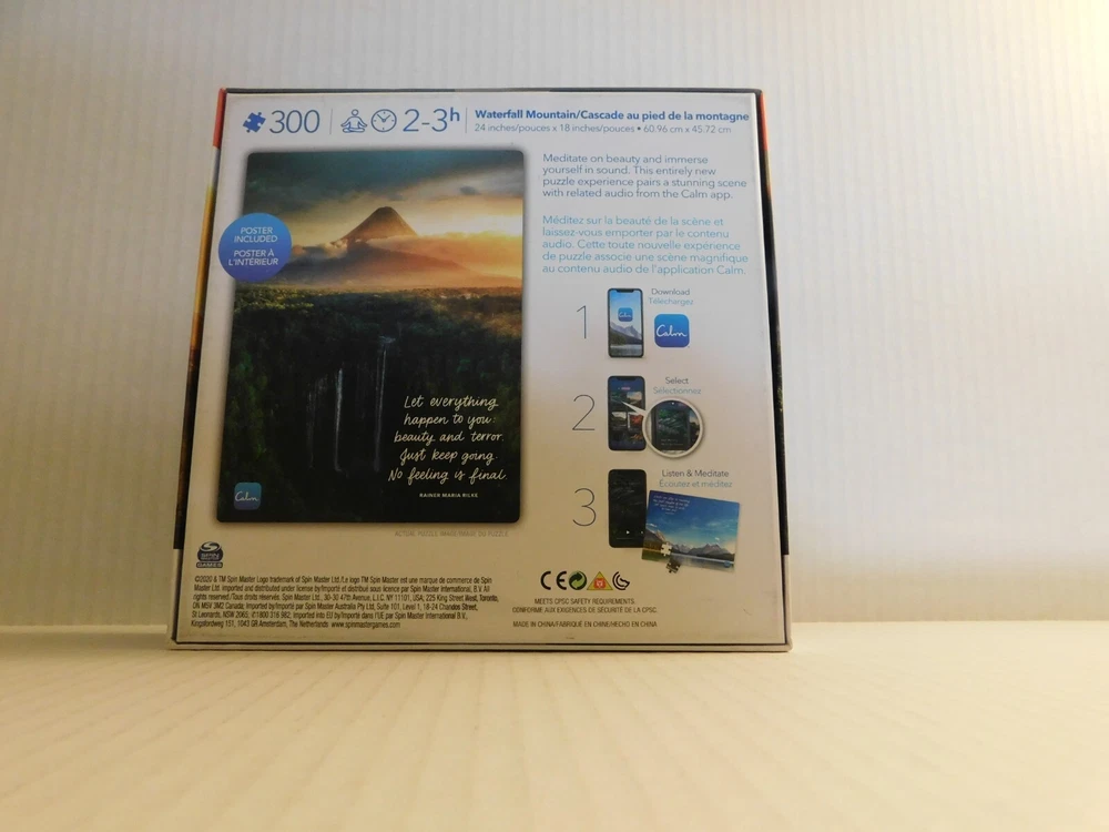 The NEW Waterfall Mountain Mindful Puzzle by Spin Master is a 300-piece jigsaw puzzle featuring a serene landscape of a waterfall and mountain. With dimensions of 24 x 18 inches, this puzzle is made of cardboard material and comes with a poster for reference. The puzzle is designed to provide a calming and mindful experience, and it includes features such as being complete and having access to the Calm App for added relaxation. Perfect for enthusiasts of landscapes and contemporary puzzles, this colorful puzzle offers an engaging and tranquil activity for individuals of all ages.