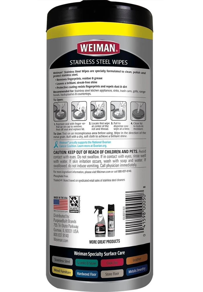 Stainless steel wipes provide a brilliant, streak-free shine to clean, shine and protect your stainless steel appliances. In addition to cleaning and polishing, its multipurpose formula also protects surfaces by leaving a shiny, protective barrier that resists fingerprints and repels dust and dirt. Premoistened wipes can be applied directly onto stainless steel surfaces for immediate cleanings. Stainless steel wipes are perfect for cleaning refrigerators, dishwashers, ovens, stoves and more. Streak-free formula cleans, shines and protects stainless steel surfaces Protective barrier helps prevent fingerprints and repels dust/dirt Wipes are premoistened for immediate use Perfect for use on refrigerators, dishwashers, ovens and more