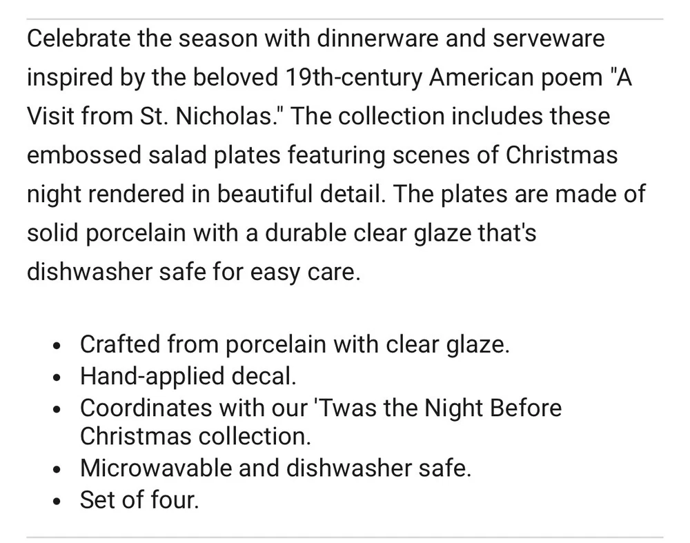 Add a touch of whimsy to your dining table with this set of four Williams-Sonoma salad plates. Featuring a charming mouse design inspired by the classic Christmas tune "Twas the Night Before," these plates are perfect for any holiday occasion or for everyday use. Made of durable porcelain, they measure 8.25 inches in diameter and are sure to delight both kids and adults alike. The multicolor design and country style make them a decorative addition to any kitchen or dining room. Whether you're hosting a dinner party or just enjoying a simple meal with your family, these plates are sure to bring a smile to everyone's face.