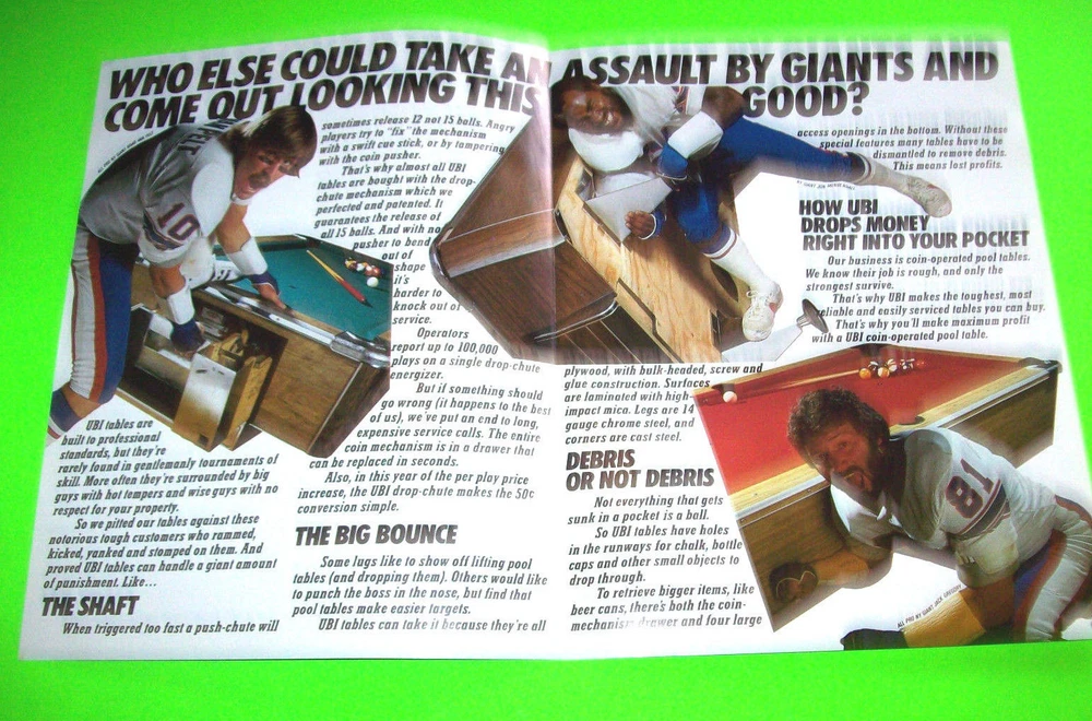 Original new old stock never circulated promotional advertising sales flyer brochure. Near mint condition with mild age only. Great vintage sales flyer with New York Giants Football stars or the 1980s era. (Jon) John Mendenhall, Jack Gregory, and Brad Van Pelt are shown. See photos. Flyers are advertising literature also called a circular, brochure, or flier. Size is 8.5" X 11" and it opens double size as shown. Double click photos to enlarge and see detailed view. Free sheet protector included with all flyers. All flyers are shipped flat with cardboard. Visit my Ebay store to see all my listings: http://stores.ebay.com/Chameleon-Collectibles-Store Paypal accepted. Payment is due within 5 days of auction close. Buyer pays shipping and handling for the first item. Additional items will be free or discounted if combined and paid at once. USA estimated delivery 2-5 business days. International estimated delivery: First Class Mail International = 14-30 business days. Priority Mail International = 10-14 business days. (please note these are estimates) Selling on Ebay since 1997. Check my feedback. International Buyers – Please Note: Usually there are no import duties on goods but please check with your postmaster to determine if you are expected to pay any additional fees. Import duties, taxes, and charges are the buyer's responsibility if applicable. Any fees required are not from Chameleon Collectibles they are from your countries customs department. Total value will be shown on customs forms less the postage paid. Items can not be marked as gift on customs forms. The estimated arrival date is 14-30 business days from the time item is shipped. Please note your item may arrive sooner or later depending on the postal service. Delays are beyond my control once item is posted. In the unlikely event you do not receive your item there is a 60 day wait period until claims can be processed. In the unlikely event your item is damaged please contact me as soon as item is received so insurance claim can be started. By purchasing this item or any item from my Ebay store you agree to these terms and to cooperate with signing insurance claim forms and returning to me. First Class Mail International parcels offer tracking to only select countries. Please contact me for current rates if you require Priority Mail Shipping service. Bundle and save by using the cart. Please review all the photos. Thank you.