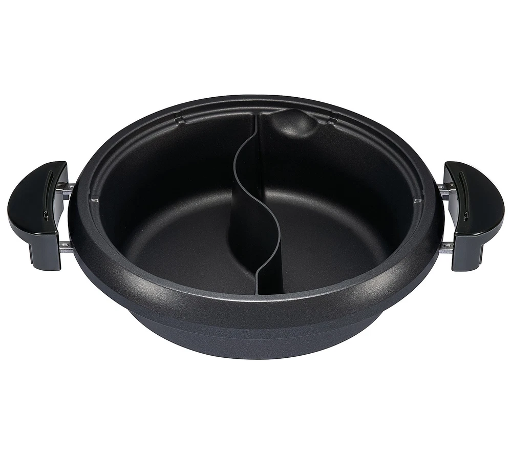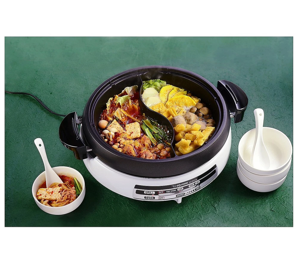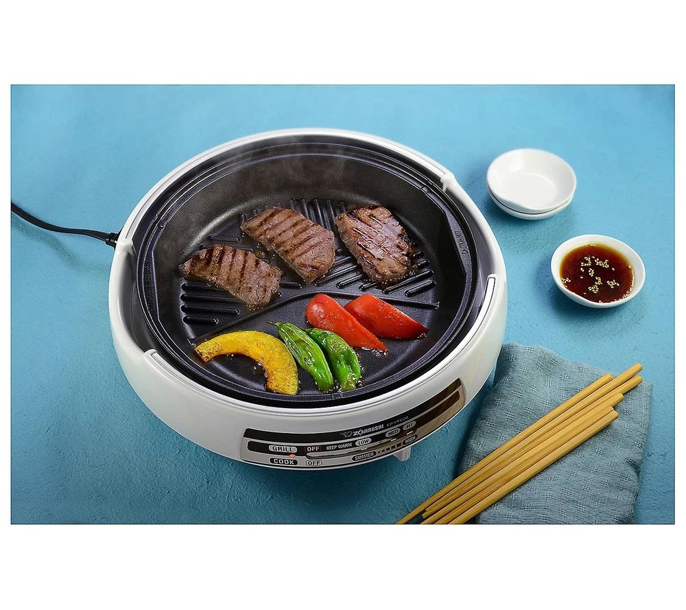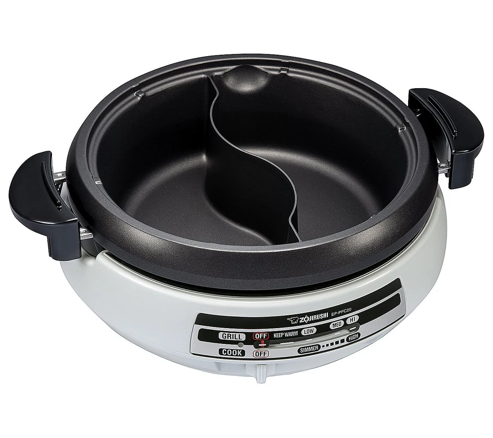 Enjoy versatile cooking with the Zojirushi Gourmet d'Expert electric skillet. Perfect for use with Yin Yang hot pot, it features a deep pan with a divider and a dual surface griddle pan for grilling meats and vegetables. Both pans boast a titanium and ceramic-enhanced nonstick coating for easy cleaning. From Zojirushi. Includes electric skillet, deep pan, griddle pan, glass lid, power cord, and instruction manual Model number: EP-PFC20HA 1,300W heating system Auto shut-off feature Titanium and ceramic-enhanced nonstick coating Hand wash only Measures 16.875"W x 13.75"D x 9"H ETL listed Imported