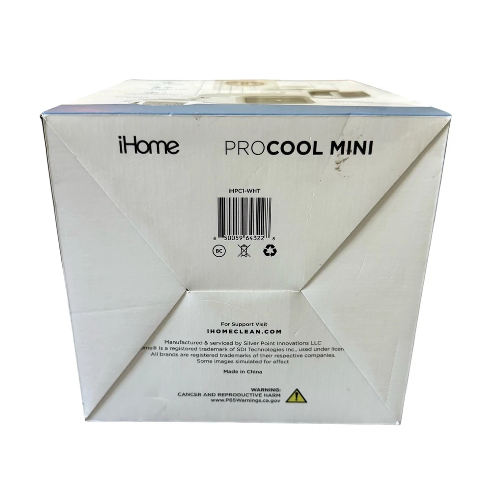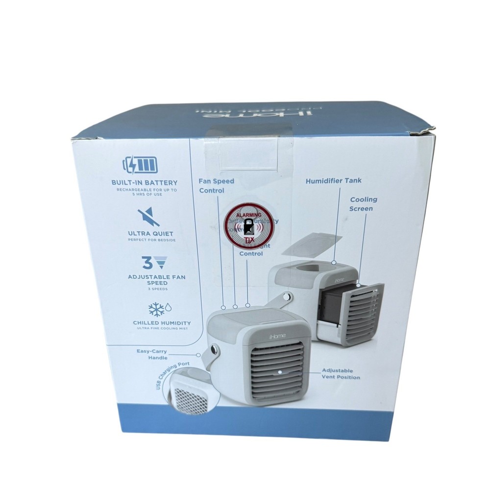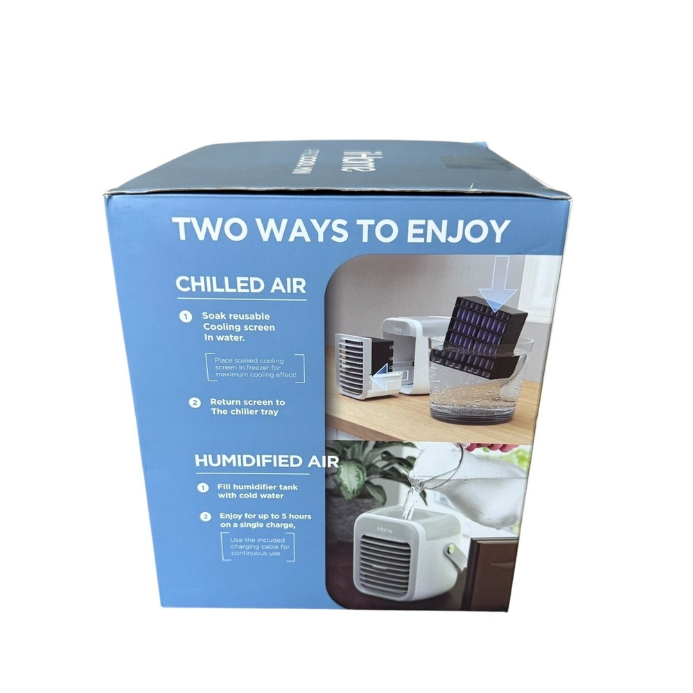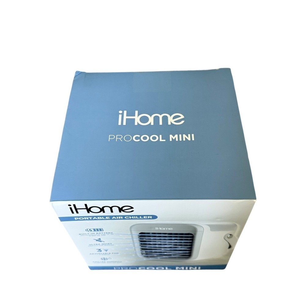 NEW iHome ProCool Mini Portable Air Chiller Personal Space Cooler New in box - open box, tested and working A compact and convenient cooling solution, the iHome ProCool Mini portable air chiller offers personalized climate control wherever you need it. Featuring a built-in battery that provides rechargeable, cordless operation for up to 5 hours of use, this device is also ultra-quiet, making it perfect for bedside tables or office desks. With an adjustable fan offering three speeds and chilled humidity capabilities, this air chiller provides a fine cooling mist. Designed for ease of use, the iHome ProCool Mini can be enjoyed in two ways: chilled air via a reusable cooling screen that can be soaked in water or placed in the freezer, or humidified air by filling the humidifier tank with cold water. Ideal for use in bedrooms, offices, or even outdoor settings like camping or poolside lounging, this portable air chiller brings cool air anywhere you need it. Cooling Method: Air Type: Portable Air Conditioner Features: Portable, Humidifier, Mini, USB Port, Adjustable Fan Speed Number of Cool Speeds: 3 Mounting Location: Desk/Tabletop Area Covered: 20-40 sq ft Personal Air Cooler, Space Cooler, Mini Air Conditioner, Rechargeable Air Chiller, Cordless Air Cooler, Humidifier, Desk Fan, Bedside Fan, Office Fan, Camping Fan, Portable AC