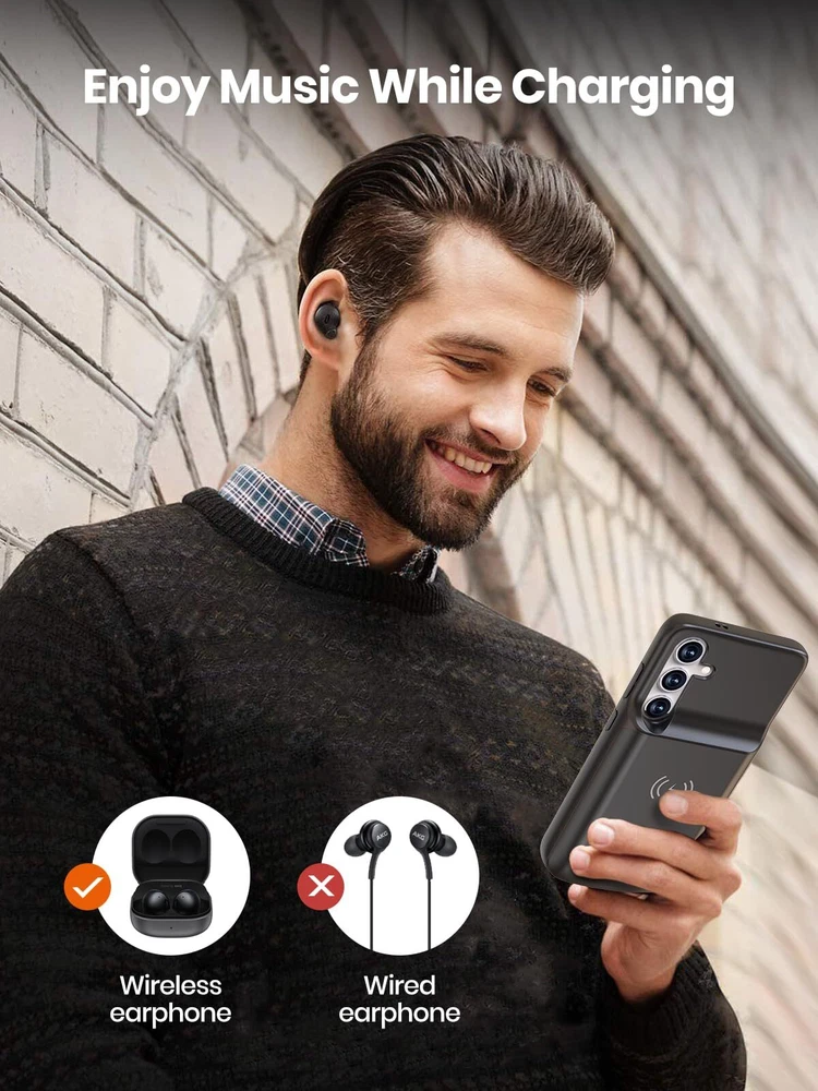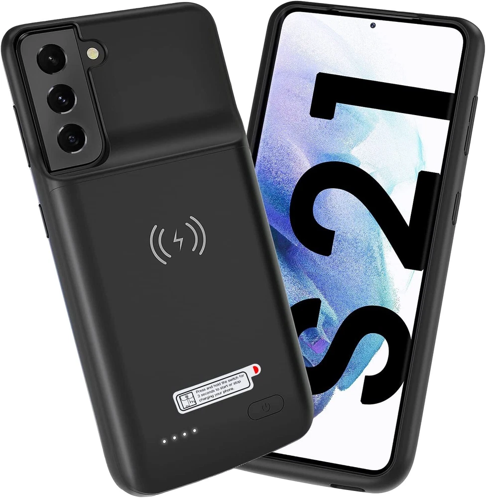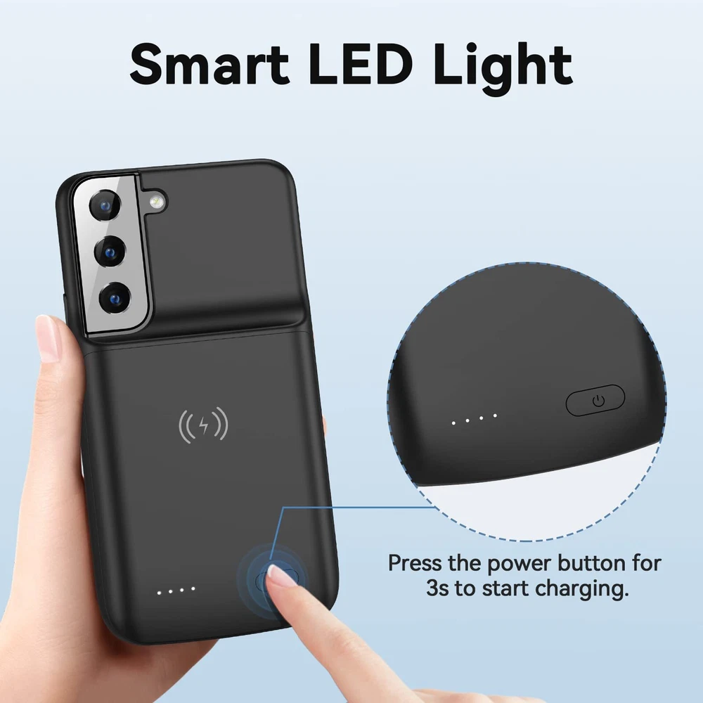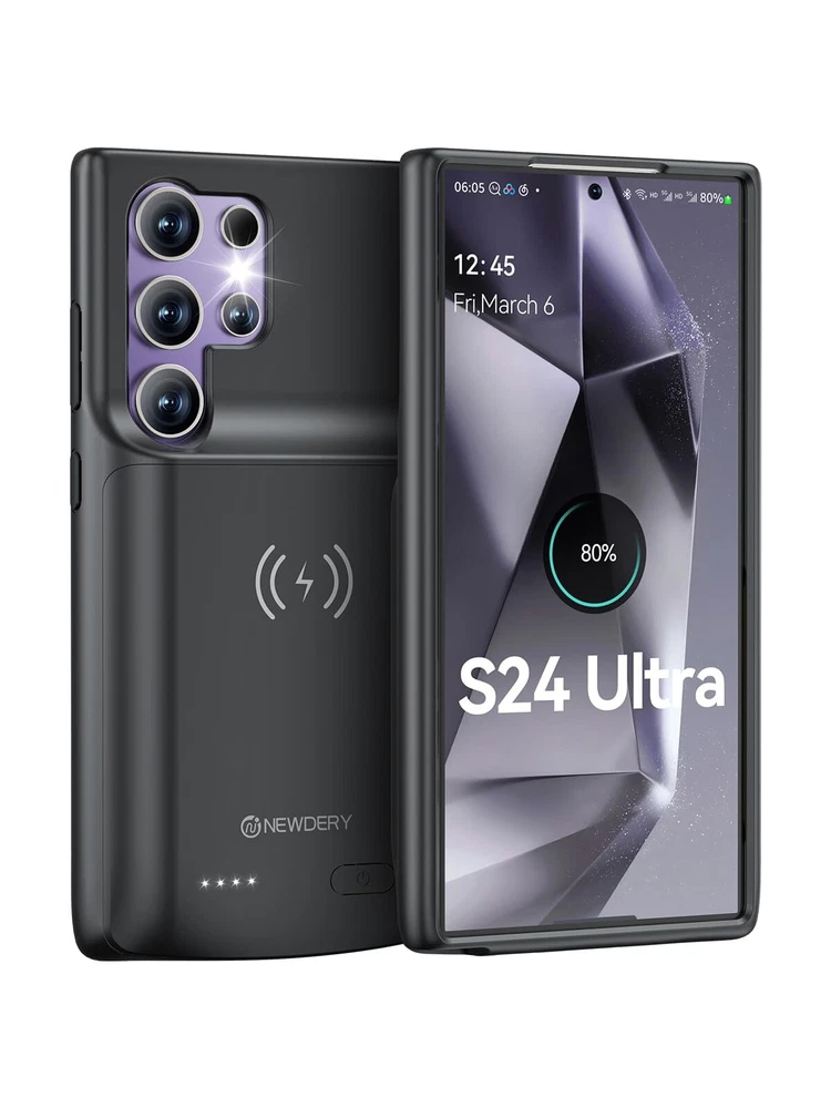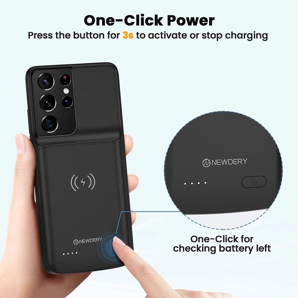 ================================ 【Qi Wireless Charging & Bluetooth headphones Supported】Newdery galaxy S21 S22 S23 S24 battery case allows you to charge the case and your phone simultaneously via Qi wireless charging pad (not included).ONLY support Bluetooth wireless headphones. 【EXTENDED 100% BATTERY LIFE】Samsung S21 S22 S23 S24 slim backup case battery with built-in 4700 or 4800 mAh rechargeable Li-polymer battery pack, doubles your battery life. The galaxy S21 S22 S23 S24 extended case is great for go shopping and travel. 【LED Indicator Light】All-in-One charging case makes convenience. If you charge your phone via Phone battery case at the first time, please hold the power button for 3s to start charging. Besides, it's convenience to track how much power left through ONE-clicking power button. 【360° PROTECT YOUR PHONE】Newdery Battery charger case is not only a portable power bank, but also a protective case for cellphone from scratches. Raised bezels help you to protect the screen to some extent. Please still add a protectors to your phone to prevent it from facing drops. Product Specifications: Capacity: 4700mAh or 4800mAh Input: USB-C DC 5V/1.8A (MAX) Wireless DC 5V/1A (MAX) Output: USB-C DC5V/1.5A (MAX) Battery case fully charges the phone: 2h To fully charge the battery case: 3.3h To fully charge the battery case via wireless charging pad: 4h To fully charge the battery case and the phone: 5.3h Dimensions:6.18*3.07*0.71 inch DOES NOT compatible with type-c headphones. DOES NOT support Data Sync/Samsung Pay/Android Auto/CarPlay. DOES NOT support magnetic/High Voltage, Quick Charge adapters. Charging via cable/Wireless station: You can charge the phone external battery case with phone via the original charging cable at the same time. And Newdery phone charging case can be charged via the Qi wireless pad without take off the case. What do you get Samsung Battery Case x 1 User Manual x 1 Card x 1 Easy to Use Slide your phone in slowly, make sure the connector of the Phone charger case with phone properly. Press the button for 3s to begin/stop charging your phone If you need to take it off, bend the top soft rubber of the case, then push your phone up slowly.