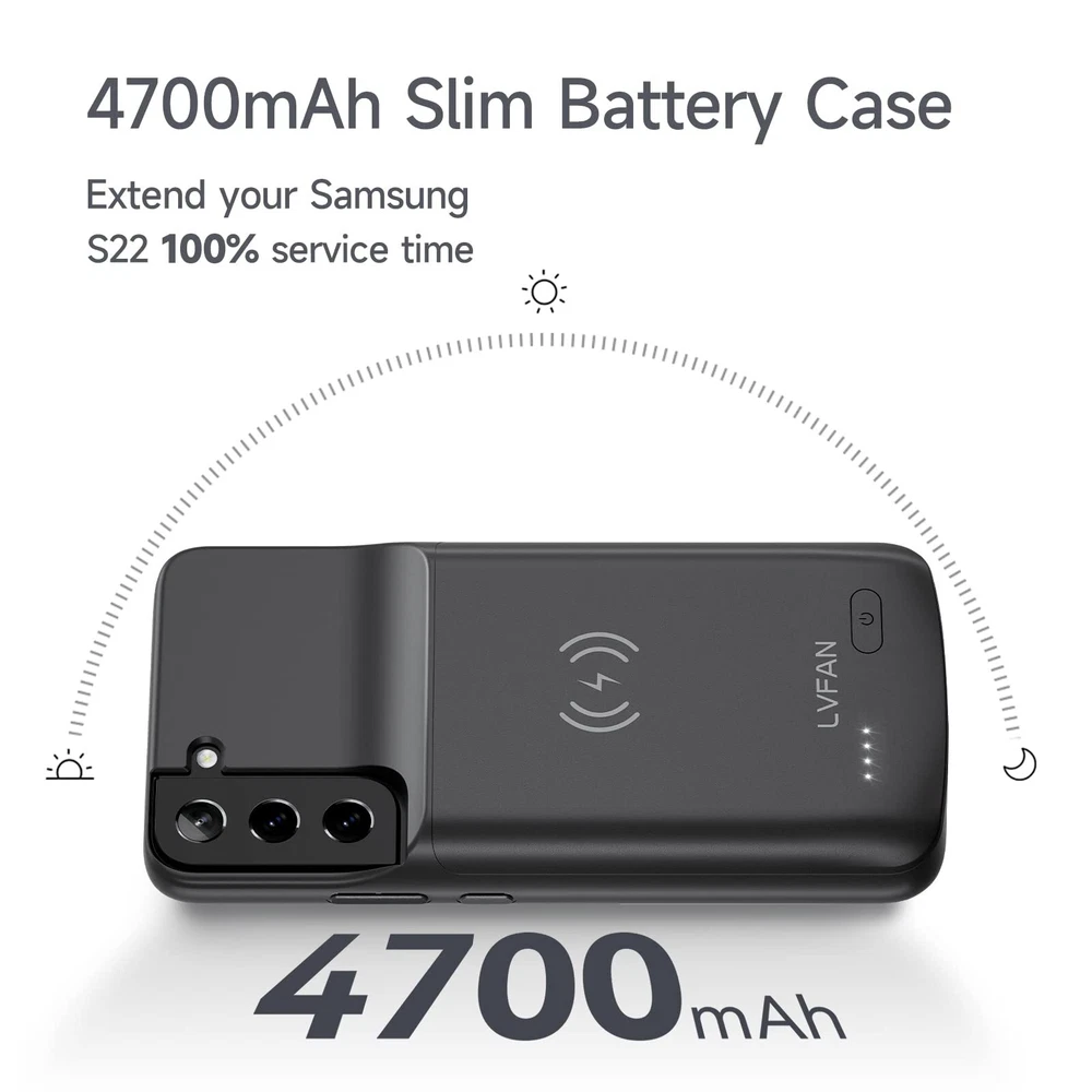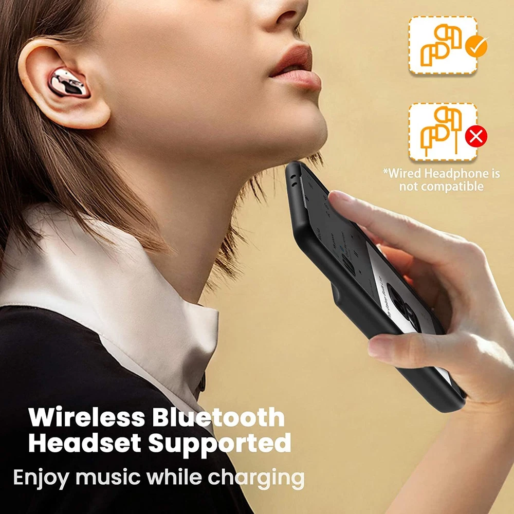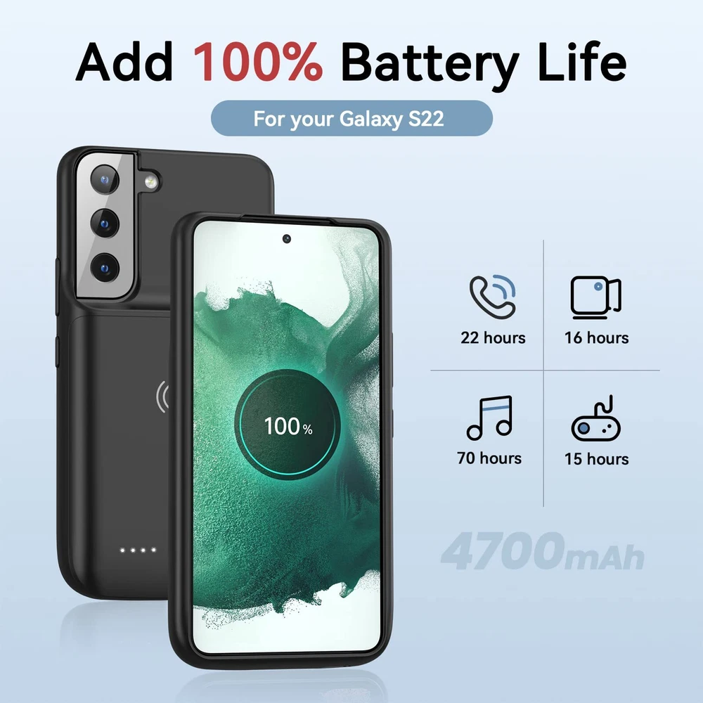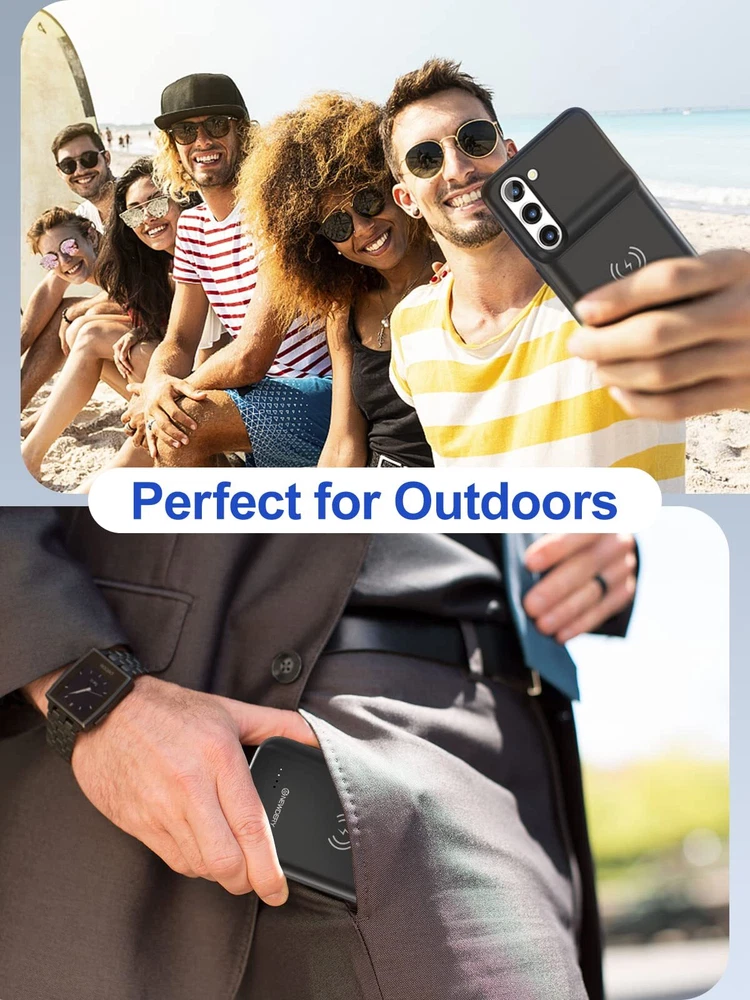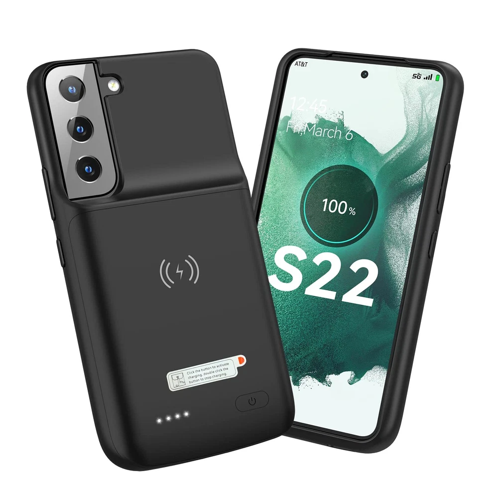 ================================ 【Qi Wireless Charging & Bluetooth headphones Supported】Newdery galaxy S21 S22 S23 S24 battery case allows you to charge the case and your phone simultaneously via Qi wireless charging pad (not included).ONLY support Bluetooth wireless headphones. 【EXTENDED 100% BATTERY LIFE】Samsung S21 S22 S23 S24 slim backup case battery with built-in 4700 or 4800 mAh rechargeable Li-polymer battery pack, doubles your battery life. The galaxy S21 S22 S23 S24 extended case is great for go shopping and travel. 【LED Indicator Light】All-in-One charging case makes convenience. If you charge your phone via Phone battery case at the first time, please hold the power button for 3s to start charging. Besides, it's convenience to track how much power left through ONE-clicking power button. 【360° PROTECT YOUR PHONE】Newdery Battery charger case is not only a portable power bank, but also a protective case for cellphone from scratches. Raised bezels help you to protect the screen to some extent. Please still add a protectors to your phone to prevent it from facing drops. Product Specifications: Capacity: 4700mAh or 4800mAh Input: USB-C DC 5V/1.8A (MAX) Wireless DC 5V/1A (MAX) Output: USB-C DC5V/1.5A (MAX) Battery case fully charges the phone: 2h To fully charge the battery case: 3.3h To fully charge the battery case via wireless charging pad: 4h To fully charge the battery case and the phone: 5.3h Dimensions:6.18*3.07*0.71 inch DOES NOT compatible with type-c headphones. DOES NOT support Data Sync/Samsung Pay/Android Auto/CarPlay. DOES NOT support magnetic/High Voltage, Quick Charge adapters. Charging via cable/Wireless station: You can charge the phone external battery case with phone via the original charging cable at the same time. And Newdery phone charging case can be charged via the Qi wireless pad without take off the case. What do you get Samsung Battery Case x 1 User Manual x 1 Card x 1 Easy to Use Slide your phone in slowly, make sure the connector of the Phone charger case with phone properly. Press the button for 3s to begin/stop charging your phone If you need to take it off, bend the top soft rubber of the case, then push your phone up slowly.
