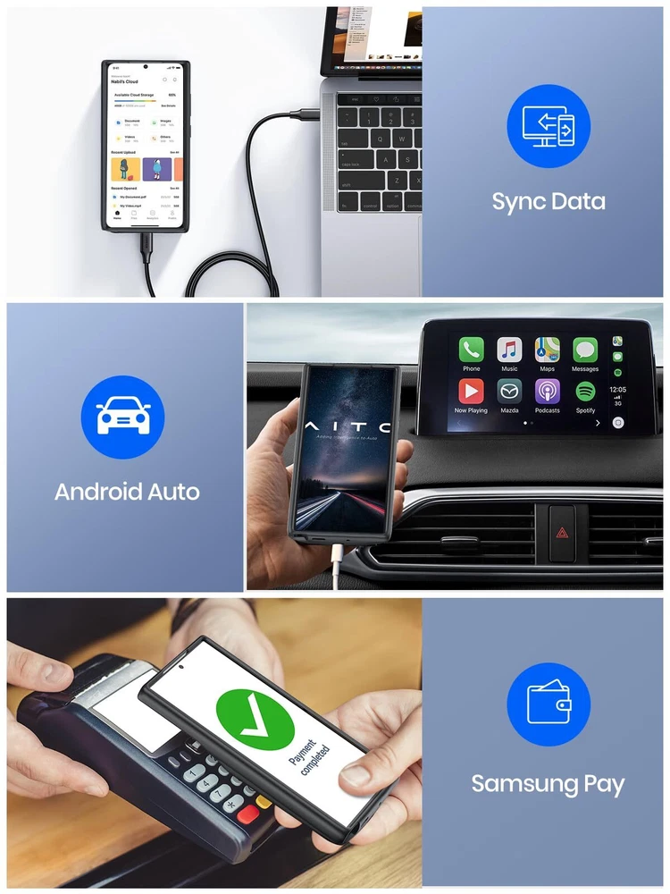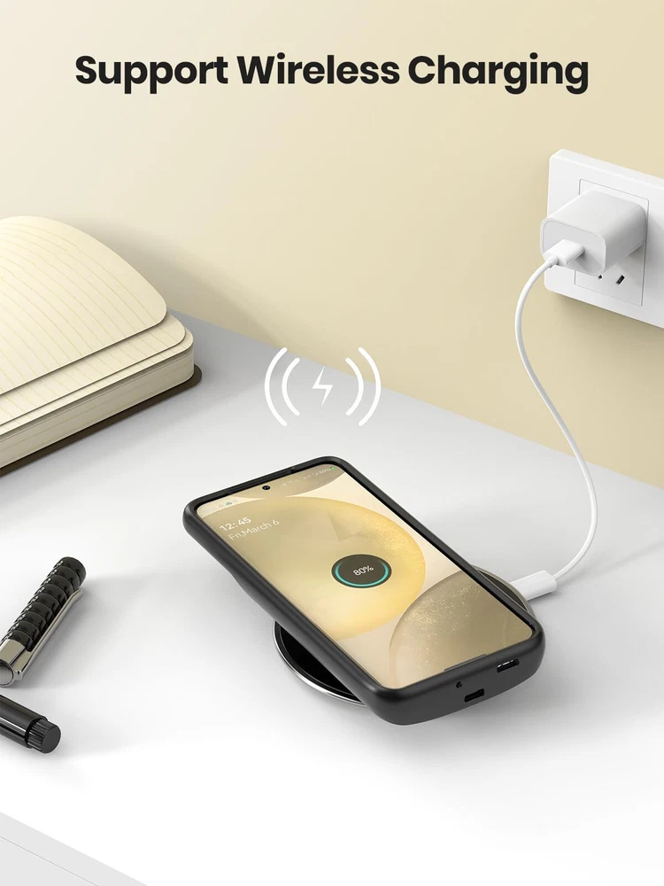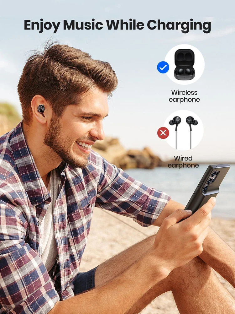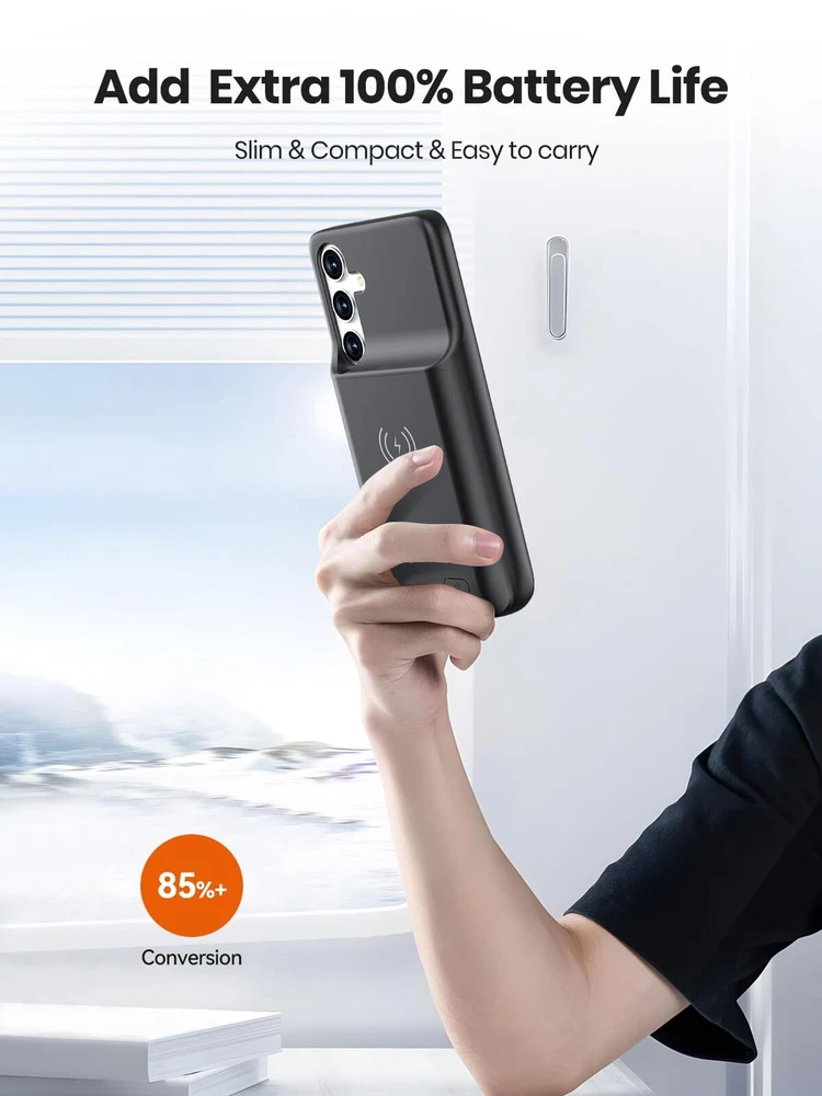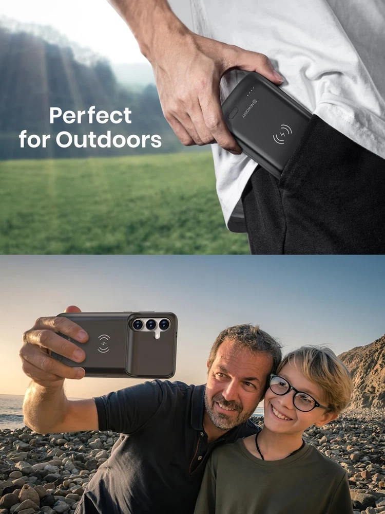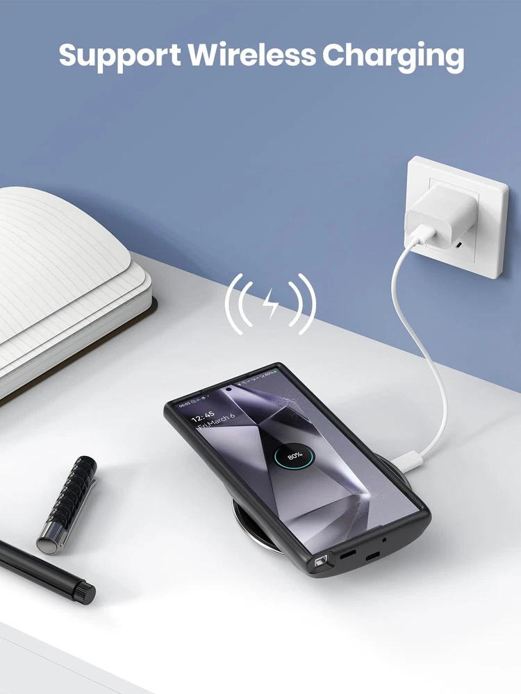 ================================ 【Qi Wireless Charging & Bluetooth headphones Supported】Newdery galaxy S21 S22 S23 S24 battery case allows you to charge the case and your phone simultaneously via Qi wireless charging pad (not included).ONLY support Bluetooth wireless headphones. 【EXTENDED 100% BATTERY LIFE】Samsung S21 S22 S23 S24 slim backup case battery with built-in 4700 or 4800 mAh rechargeable Li-polymer battery pack, doubles your battery life. The galaxy S21 S22 S23 S24 extended case is great for go shopping and travel. 【LED Indicator Light】All-in-One charging case makes convenience. If you charge your phone via Phone battery case at the first time, please hold the power button for 3s to start charging. Besides, it's convenience to track how much power left through ONE-clicking power button. 【360° PROTECT YOUR PHONE】Newdery Battery charger case is not only a portable power bank, but also a protective case for cellphone from scratches. Raised bezels help you to protect the screen to some extent. Please still add a protectors to your phone to prevent it from facing drops. Product Specifications: Capacity: 4700mAh or 4800mAh Input: USB-C DC 5V/1.8A (MAX) Wireless DC 5V/1A (MAX) Output: USB-C DC5V/1.5A (MAX) Battery case fully charges the phone: 2h To fully charge the battery case: 3.3h To fully charge the battery case via wireless charging pad: 4h To fully charge the battery case and the phone: 5.3h Dimensions:6.18*3.07*0.71 inch DOES NOT compatible with type-c headphones. DOES NOT support Data Sync/Samsung Pay/Android Auto/CarPlay. DOES NOT support magnetic/High Voltage, Quick Charge adapters. Charging via cable/Wireless station: You can charge the phone external battery case with phone via the original charging cable at the same time. And Newdery phone charging case can be charged via the Qi wireless pad without take off the case. What do you get Samsung Battery Case x 1 User Manual x 1 Card x 1 Easy to Use Slide your phone in slowly, make sure the connector of the Phone charger case with phone properly. Press the button for 3s to begin/stop charging your phone If you need to take it off, bend the top soft rubber of the case, then push your phone up slowly.