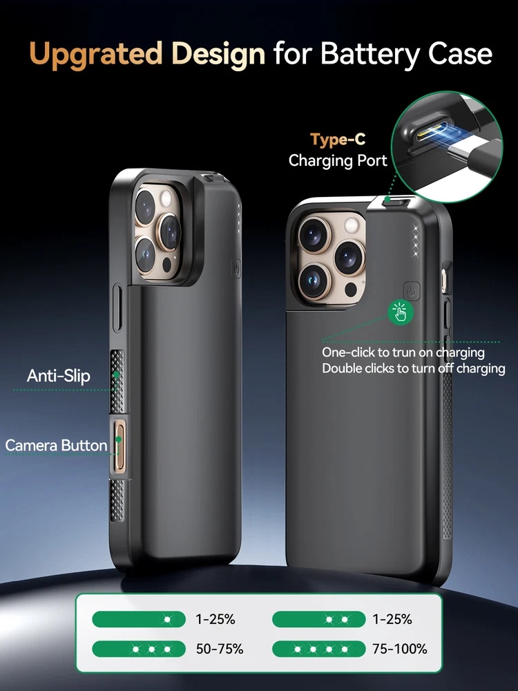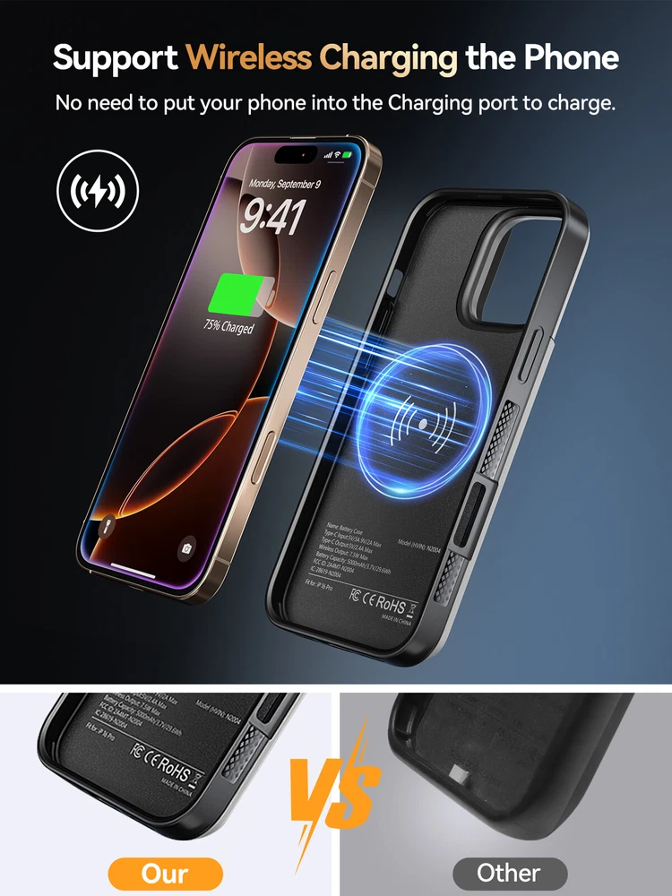 [Compatibity] NEWDERY 5000mAh battery case ONLY fit for iPhone 16 Pro. NOTE: NOT for iPhone 16/16 Pro Max/16 Plus and not for iPhone 14/15 series. [CarPlay & Sync-Data & Wired Headphones Supported] Upgraded design for iphone 16 pro battery case makes you use the CarPlay function more stable, don’t will be disconnected anymore. It is also support the sync-data, wired headphones and for Apple Pay function. Pefect for working, business trip and travel. [Upgraded Design] NEWDERY newest design for iPhone 16 pro charging case makes you more easy to use. Just push your phone into the case then click the power button, it will wireless charge your phone likes the wireless power bank. And the portable battery is built in the Type-C charging port, you can charge the case or share the power to charge other devices via this port. NOTE: Doesn’t support the Qi or magnetic wireless charging. [ 360°Protection & LED Indicator] 360°protecting your phone for a whole day. The hard shell back design offers complete protection for your phone from scratches, daily wear and tear, 6.8mm camera & 1.25mm screen raised bezel edge and tempered screen protector helps you to protect the screen. It combines a power bank and a protective case. Press the power button to check the battery level, the LED indicator light will shows you the battery level (25%-50%-75%-100%). One click or double clicks the power button to turn on or turn off charging. [What You Get] Package including: 1x Battery case for iPhone 16 Pro, 1 x Tempered Screen Protector, 1 x USB C-C charging cable and 1 x User manual. It has a 12-month support ensures, you will be offered full assistance from our NEWDERY Customer Support Team. NEWDERY Portable Upgraded Design Rechargeable Extended 5000mAh Battery Case for iPhone 16 Pro 6.3inch Product Specifications: 1. Input: 5V/2.4A 2. Output: 5V/2.4 3. Case wirelss charging the phone: 5W/7.5W 4. Dimensions: 5.97*2.99*0.78 inches; Weight: oz 5. Compatibility: ONLY fit for iPhone 16 Pro, 6.3". *NOTE*: Doesn't fit for iPhone 16 Pro Max/16 Plus/16. 6. Compatiable with Apple Pay, CarPlay, Wired Headphone and Sync-data function. *NOTE*: DOESN'T support Qi wireless or magnetic charging.