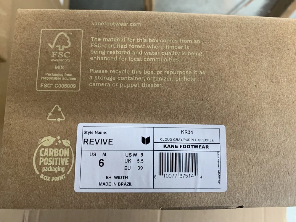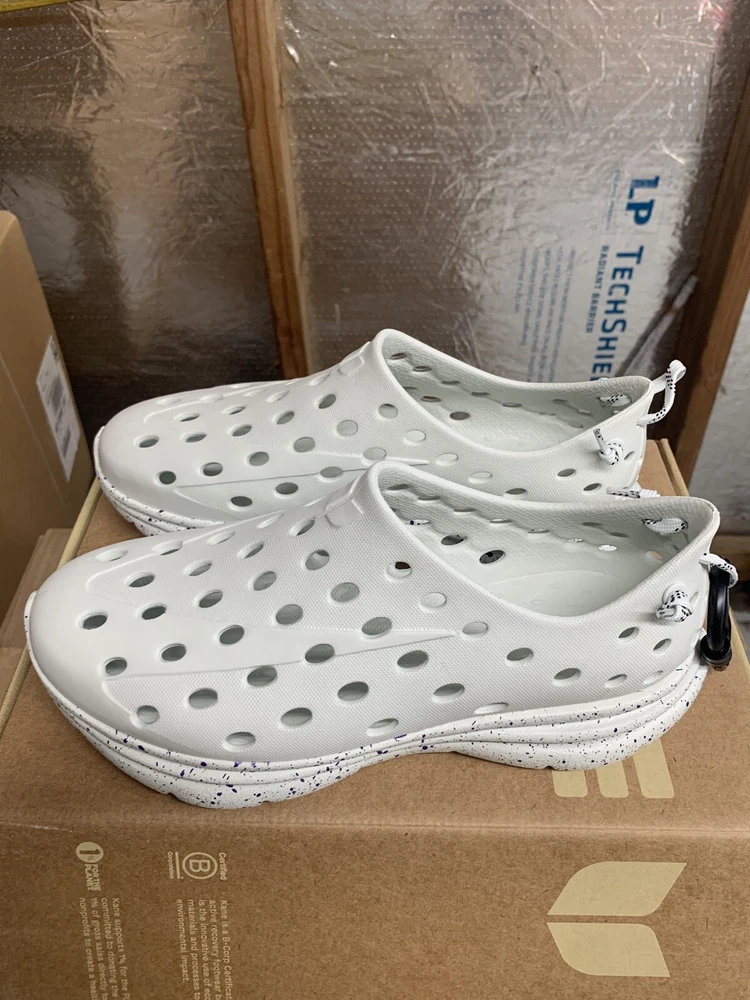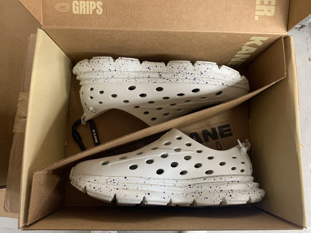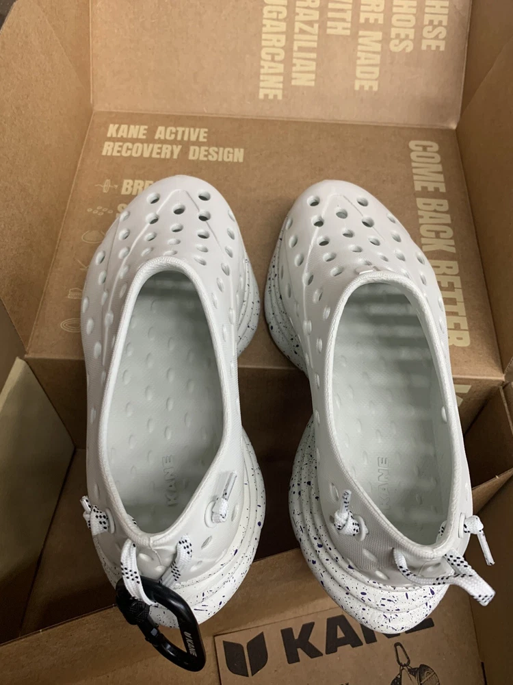 Brand new with box Men's size 6, Women's size 8 All sales are final, no returns Fast shipping! KANE Revive shoes are made of bio-based closed-cell RestoreFoam™. The shoes don’t absorb moisture, so they’re just as functional in water as they are on land, and they’re quick-drying. The KANE Revive shoes can easily be wiped or washed off with soap and water. Please avoid exposure to extreme heat or sun for this can cause the shoes to shrink or warp. Dishwashers, washing machines, or hot cars can also cause the shoes to shrink or warp. The KANE Revive sizing follows the standard sizing for a running shoe. Therefore, the size guide should be utilized according to your typical running shoe size. IN BETWEEN SIZES? We recommend sizing down (ex. if you typically wear size 10.5 - select size 10). For a wider foot, go one half size up (ex. if you typically wear size 10.5 - select size 11).