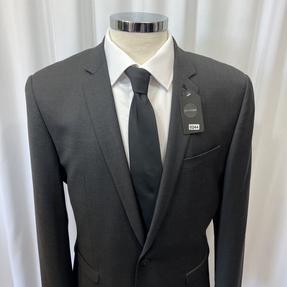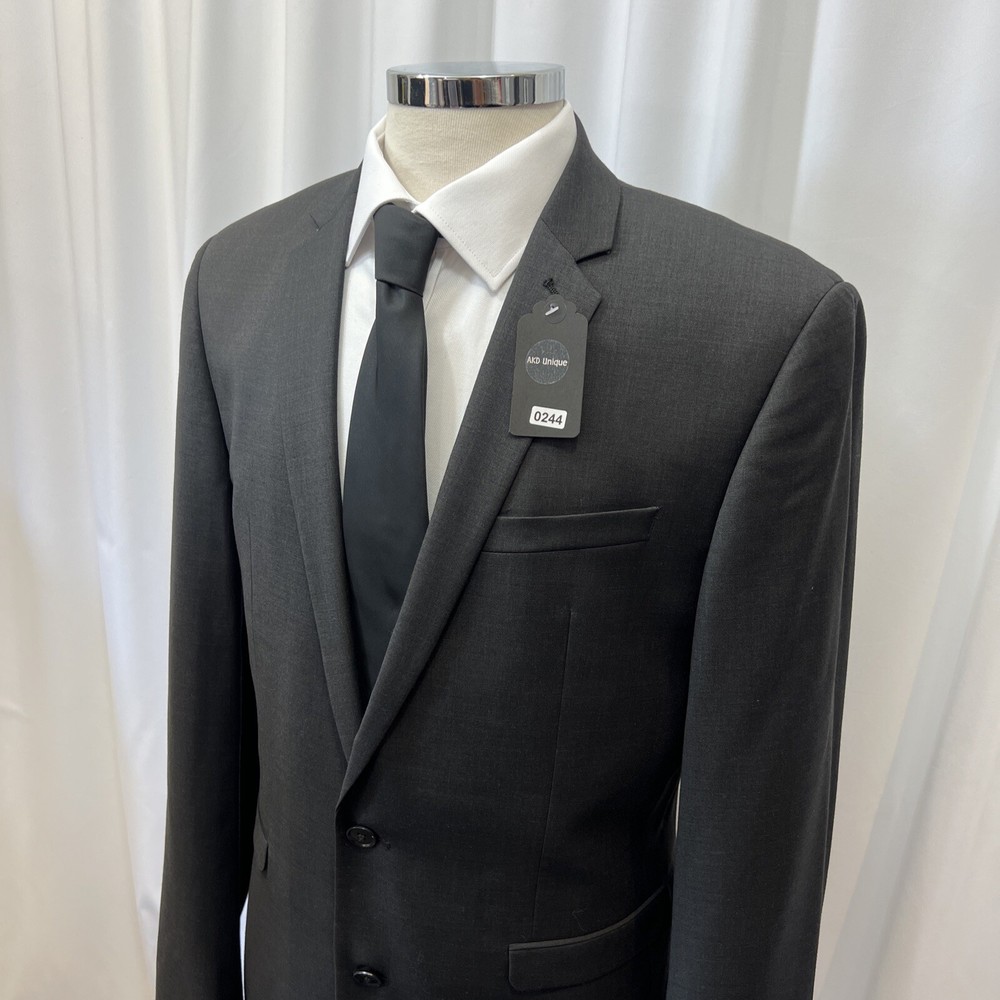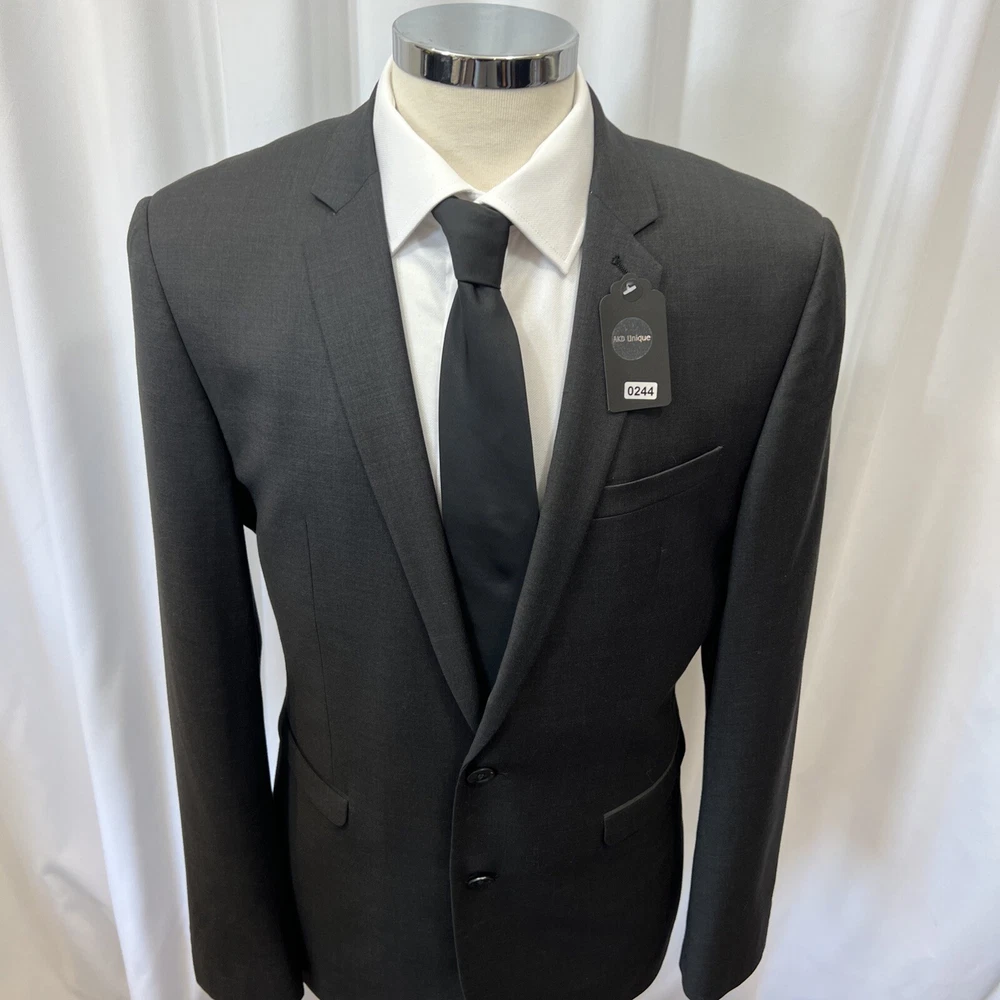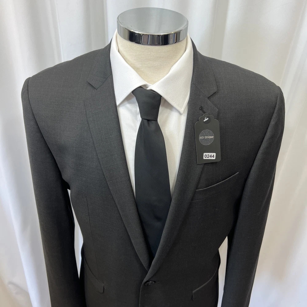 NEXT TAILORING Dark Grey Wool Blend Slim Fit 2 Piece Suit Jacket Chest: 40L" Inside pockets: 4 Front pockets: 2 Breast pocket: 1 Buttons to each cuff: 4 Buttons to front: 2 Back vents: 2 Shoulder to cuff: 27" Armpit to cuff: 18.5" Armpit to armpit when laid flat: 21" Shoulder to shoulder: 18" Collar to hem: 30" Trousers Waist: 34" Zip Front pockets: 3 Back pocket: 2 1 button & 2 hook fastening Inside leg: 33" (can drop 1.25") Width of hem at bottom of trousers: 8" AKD0008-244 Please note: Colours may slightly vary due to lighting conditions Each item undergoes meticulous hand-measured scrutiny; sizes may not align precisely with the label Review measurements and review the item description/photos before placing your bid Unfortunately, we cannot provide additional photos once items are listed The shirt and tie are not included unless explicitly stated in the listing Questions and concerns: Reach out to us through the ebay messaging system - we aim to respond within a maximum of 12 hours Ironing guidelines: Garments may arrive with minor creases Refer to the care label and use continuous steam when ironing We recommend dry cleaning for best results and peace of mind Your feedback matters: Please leave us a 5-star rating if satisfied For issues or concerns, please contact us before leaving feedback Returns: We offer a generous 30-day return period, via the ebay returns centre Please return items in their original packaging with all tags attached Buyers cover return shipping costs unless items are faulty or inaccurately listed