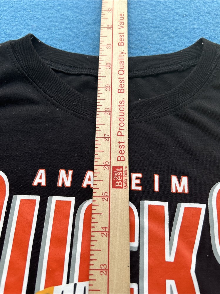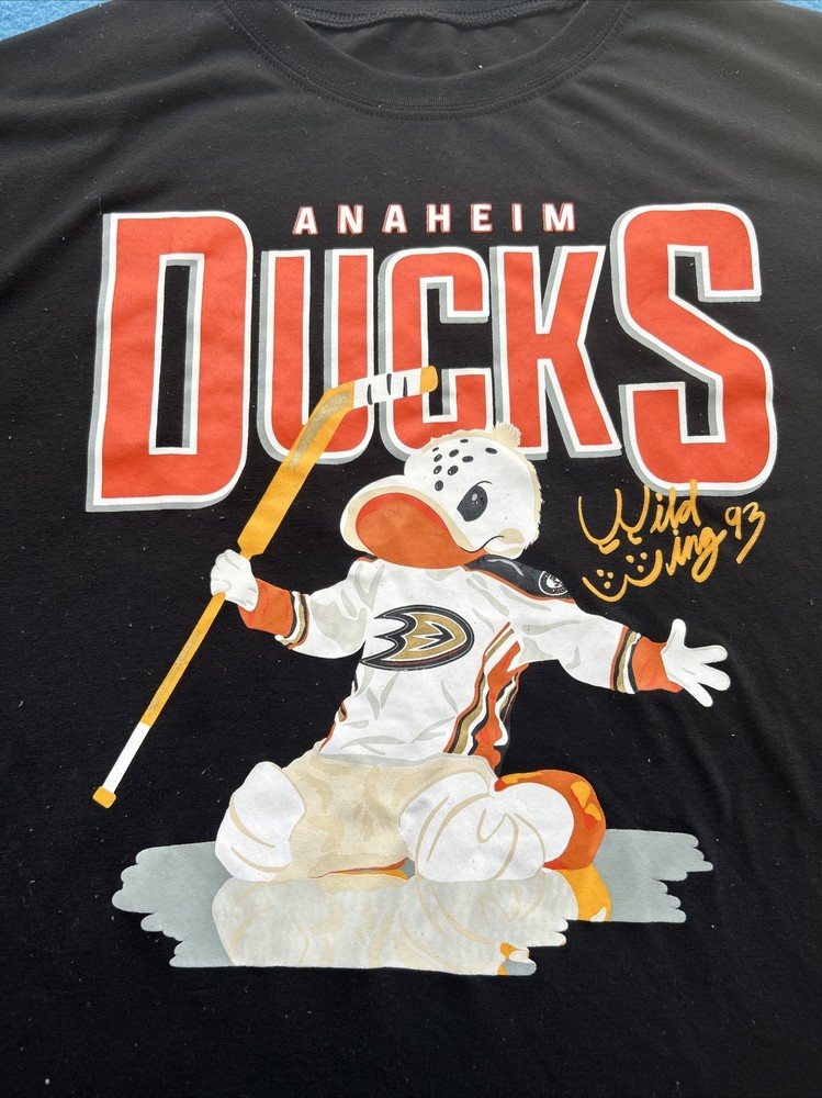 Show your love for the Anaheim Ducks with this NHL Wild Wing 93 T-Shirt in size XL. The black cotton blend material is perfect for any hockey fan, featuring a solid pattern and short sleeves. The crew neck and regular fit make it comfortable for all-day wear, while the graphic print of Wild Wing adds a touch of style. This T-shirt is perfect for any occasion, whether you're cheering on the Ducks at the game or just showing off your team spirit. No tag, see pictures for actual measurements. 00s2a9s9x