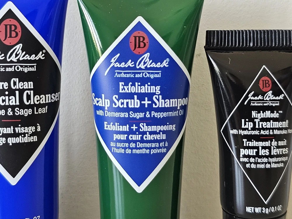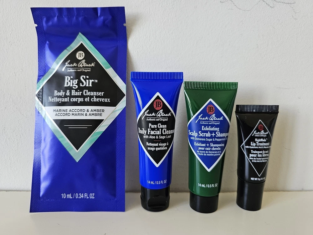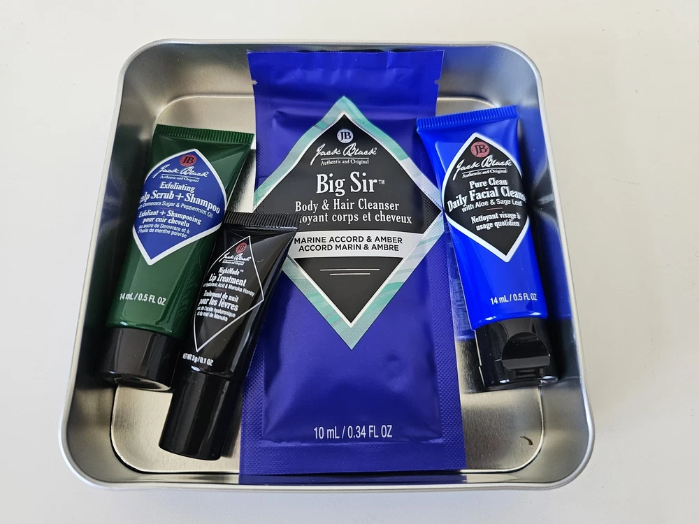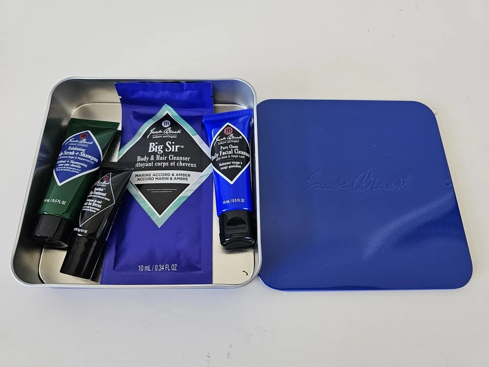 NIB JACK BLACK Facial Cleanser, Scrub Shampoo, Lip Balm Men's Cosmetic Care Set Brand: Jack Black Condition: New In Box Description: Jack Black Blue Metal Tin Box with 4 Items: Big Sir – Body & Hair Cleanser – 10ml/0.34 FL OZ Pure Clean – Daily Facial Cleanser – 14ml/0.5 FL OZ Exfoliating – Scalp Scrub + Shampoo – 14ml/0.5 FL OZ NightMode – Lip Treatment – 3g/0.1 OZ Authenticity Guarantee All our items are 100% authentic, guaranteed! Payment We accept all forms of payment through eBay Managed Payments. Please make payment promptly after purchasing or once the auction has ended. Shipping We provide Free Shipping to the USA. Items are shipped via USPS/Canada Post and are tracked. For Canadian shipments, we provide discounted shipping. We ship via Canada Post and are tracked. For International shipments, we provide discounted shipping, please refer to the shipping cost on the listing once you have chosen your country. Returns We allow up to 30 days for returns. Item must be in the original condition that was shipped to you including any tags attached. All returns must be shipped via postal service, not UPS, FedEx or any other courier service. Please note that we detail the color as accurately as possible in our description and we take many pictures to show the item at different angles. However, the actual colors may vary in person due to different monitors and their settings. Taxes & Duties As a registered business we are required to collect taxes. All Canadian shipments are subject to the tax of their province. Taxes are based on the item and shipping. International Buyer's are responsible for their country's taxes and duties. Powered by Infinato.
