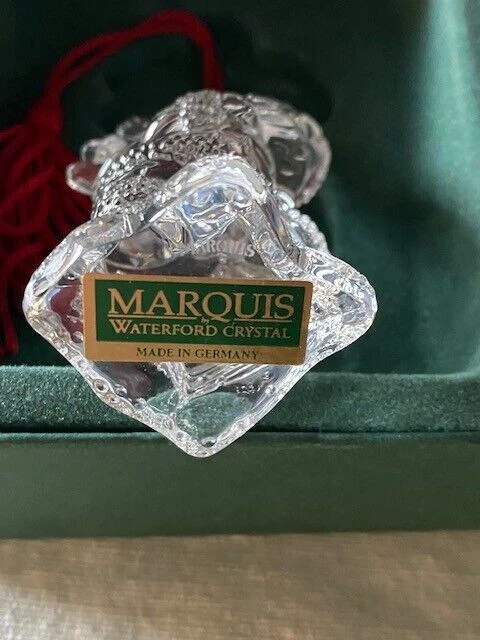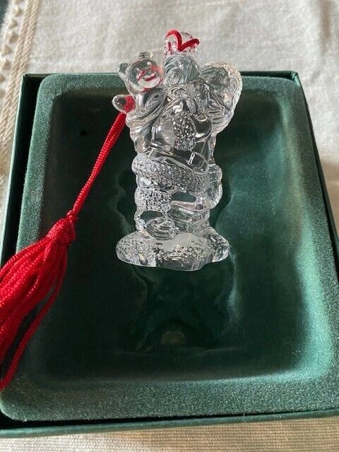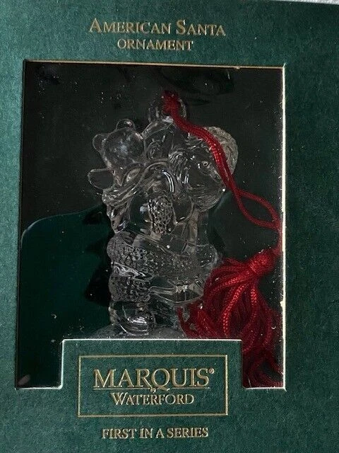 Elevate your holiday decor with the Marquis Waterford Crystal American Santa Ornament, the first in a series of collectibles that capture the spirit of Christmas. Crafted with the meticulous care Waterford is known for, this piece features a charming Santa Claus shape, etched with precision into high-quality crystal. Its clear color and delicate design showcase the craftsmanship from Germany, presenting a touch of elegance to any festive setting. This 3-inch tall ornament is complemented by a width of 2.5 inches, striking the perfect balance for display on your Christmas tree or mantel. As a vintage piece, model 122098 serves as a timeless treasure or a thoughtful gift for collectors and enthusiasts of Waterford crystal ornaments. Embrace the holiday season with this exquisite addition to your Christmas collection. New in Box (may have some shelf wear) No Waterford booklets are included Listing and template services provided by inkFrog
