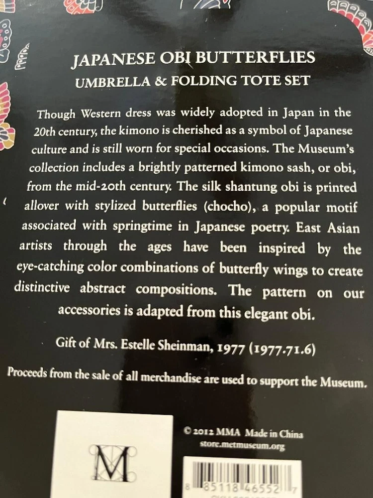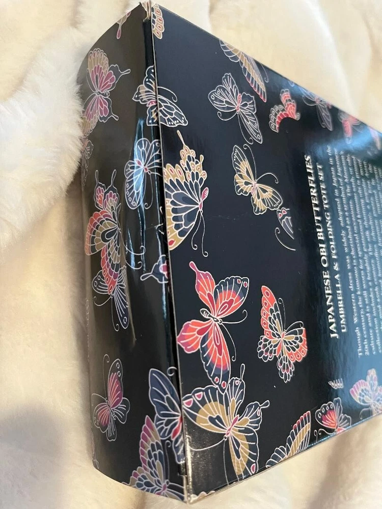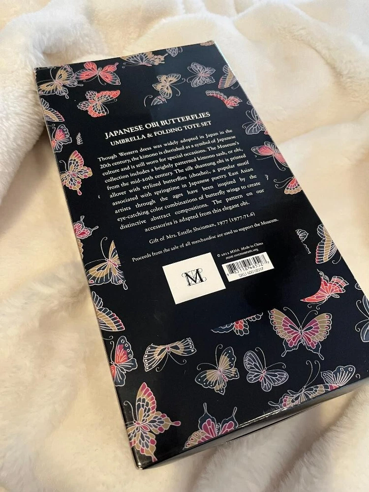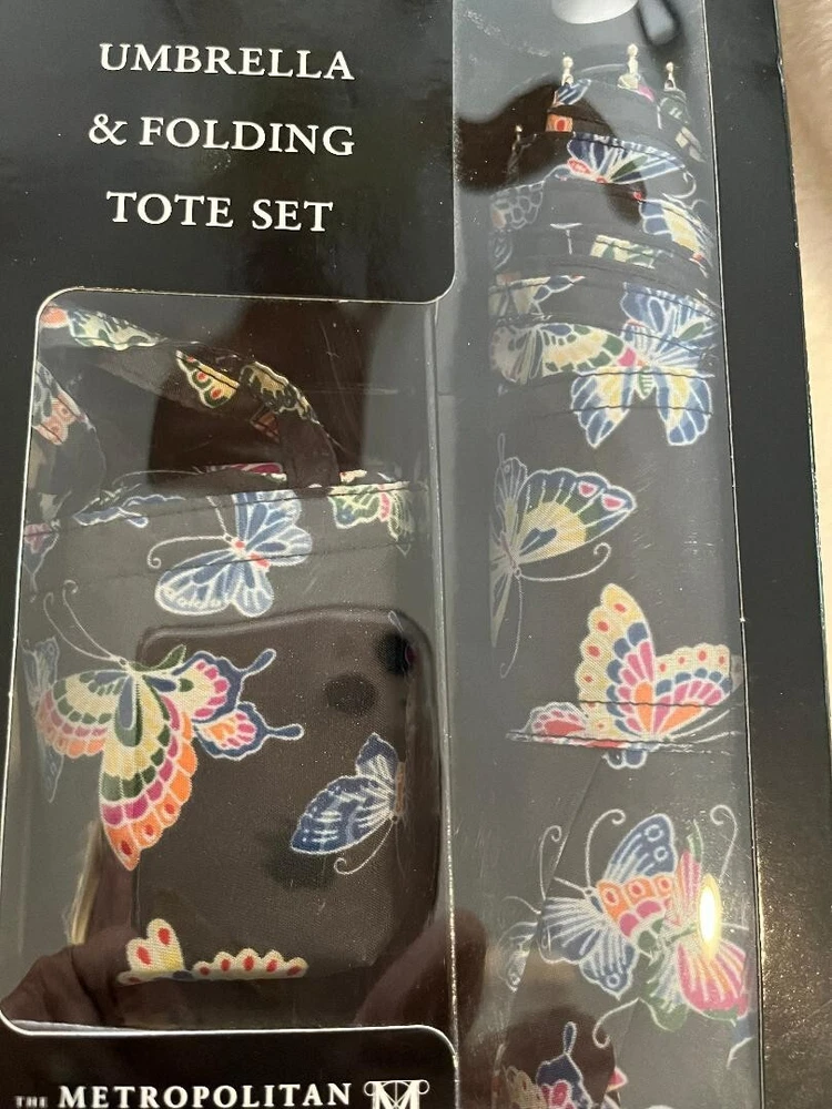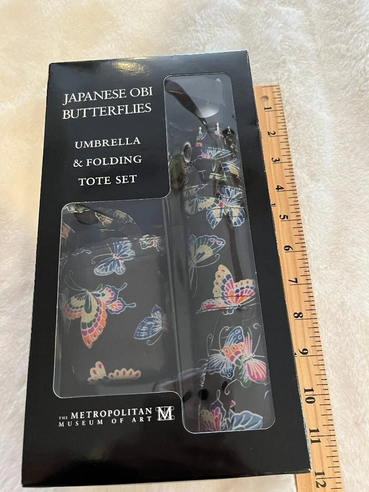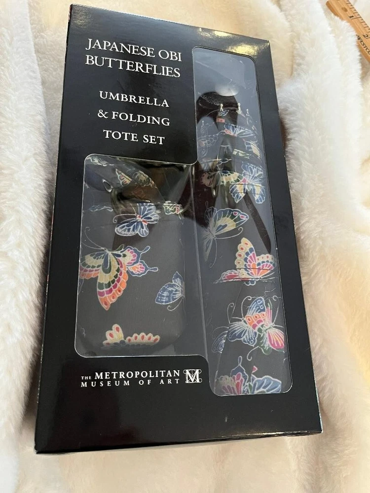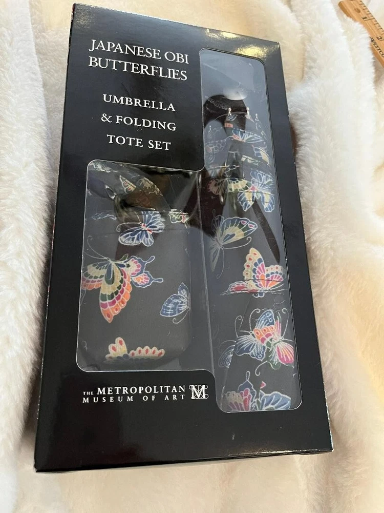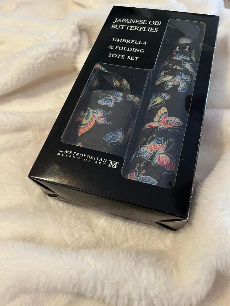 Stay stylish while keeping dry with this folding umbrella and tote from the NYC Metropolitan Museum of Art. Featuring a beautiful butterfly theme, this multicolor umbrella is perfect for any fashionable woman. Made for women, this umbrella is a must-have accessory for any rainy day.The Metropolitan Museum of Art umbrella is not only functional but also a great conversation starter. With its unique design and quality construction, it is sure to last for many rainy days to come. Don't miss out on this opportunity to add a touch of culture and style to your wardrobe. Please ask any questions and happy bidding!