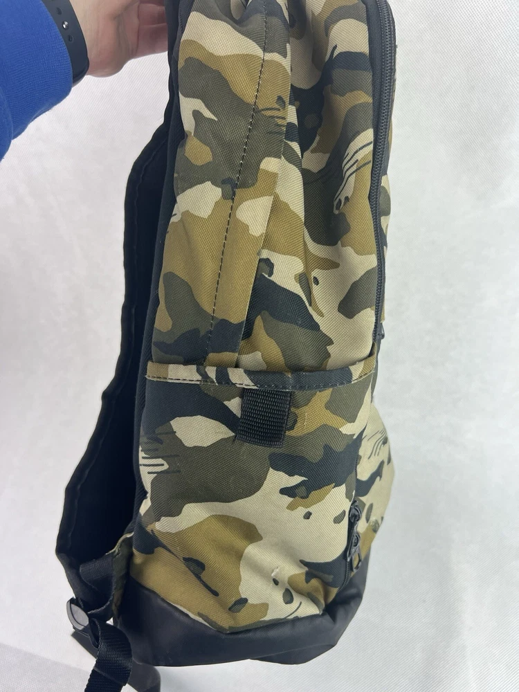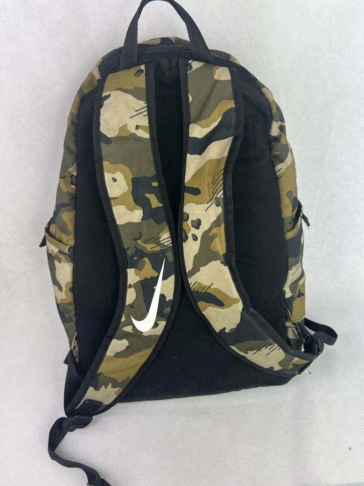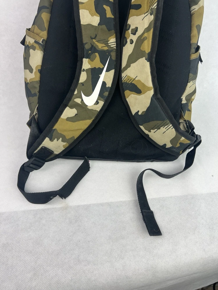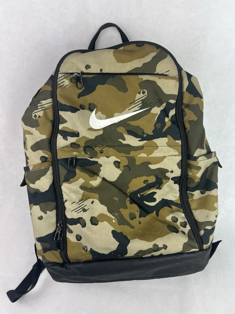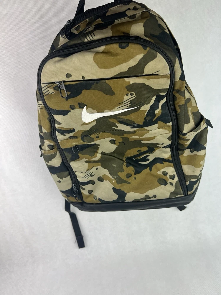 The product is a Nike Brasilia XL Camo Laptop Backpack in a khaki camouflage pattern. Designed for men, this colorful backpack is made of polyester material and features inner and outer pockets, inner dividers, a laptop sleeve for protection, adjustable straps, and a lightweight design. With a spacious interior and plenty of pockets, this backpack is ideal for carrying a laptop and other essentials while on the go.