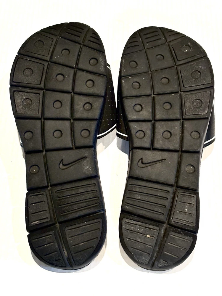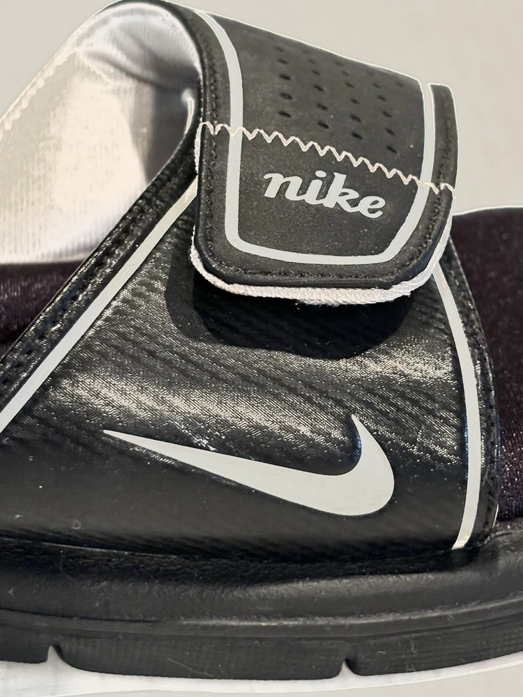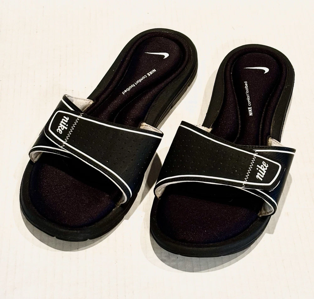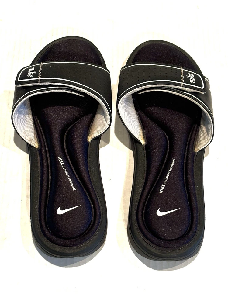 Elevate your casual look with these Nike Comfort Slide Footbed Sandals. These stylish flip flops have a super cushioned sole, come in size 11 and are perfect for any casual occasion. The solid black color and hook & loop closure make them easy to slip on and off. The cushioned and slip-resistant features along with the adjustable top strap ensure maximum comfort. The synthetic upper material adds to the durability. These sandals are a part of the Nike Comfort Slide product line, making them the perfect choice for those who want both style and comfort.