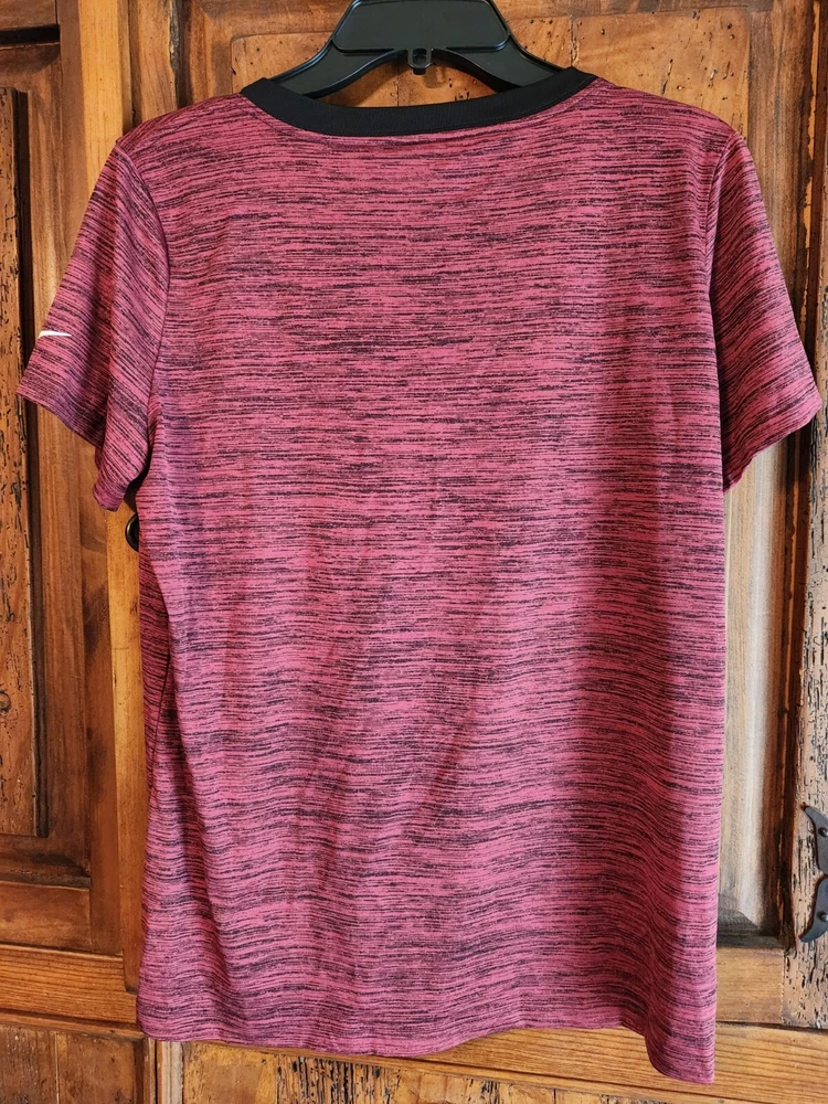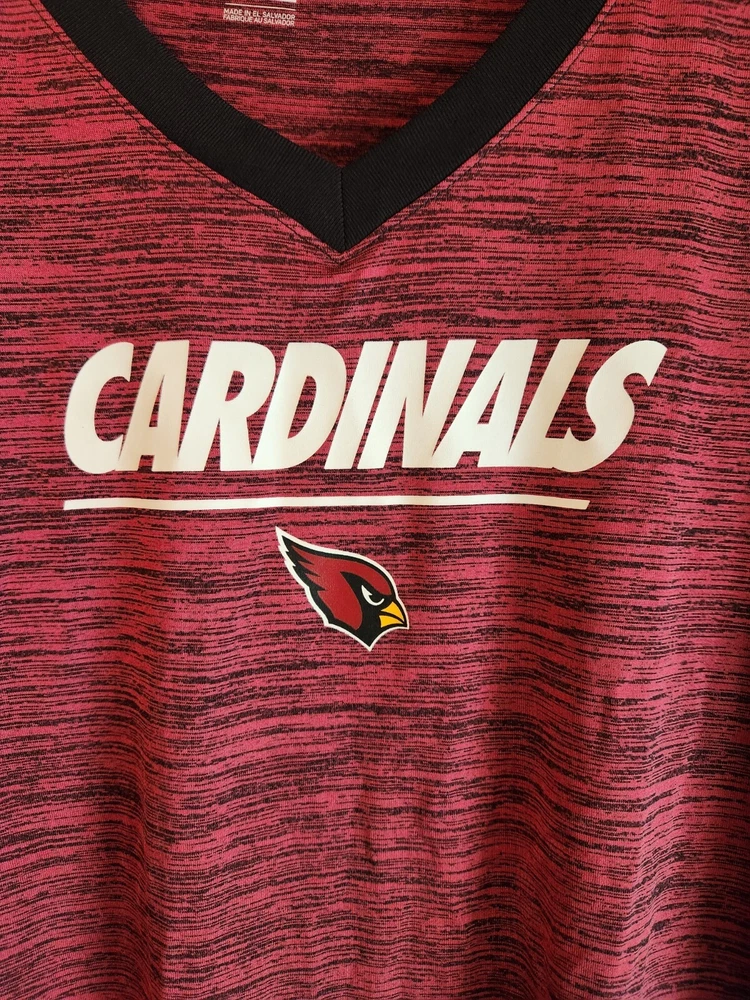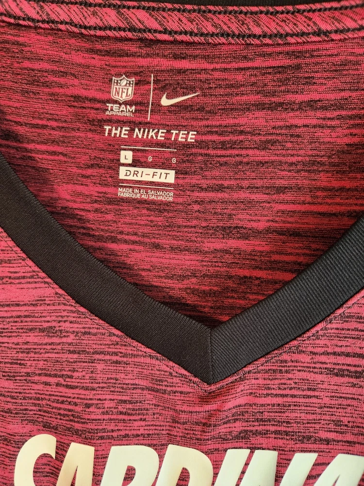 NIKE Dri-Fit NFL 'Arizona Cardinals' V-Neck Short Sleeve Polyester Red Spacedye T-Shirt Top, size Large. Lying flat and unstretched, this top measures 21.5" across the bust, 22" across the bottom and is 25" in length from the shoulder to the bottom edge. Brand new, never worn. Pristine condition. This has been stored in my smoke-free home. Feel free to email me with any questions you might have.