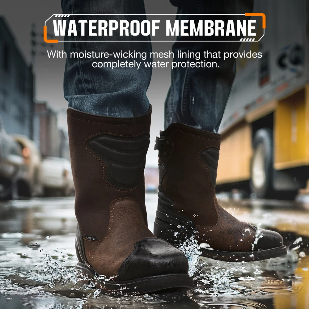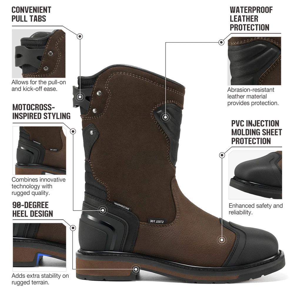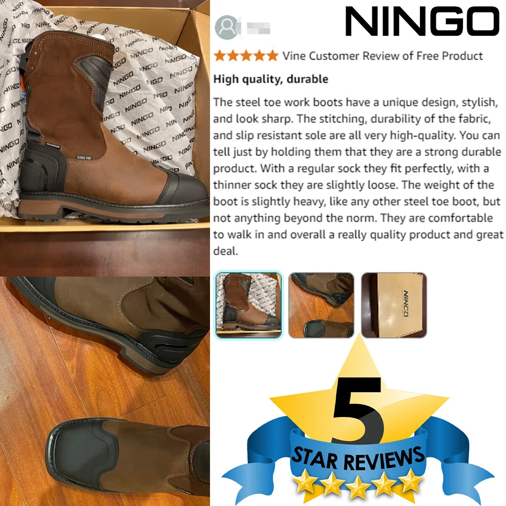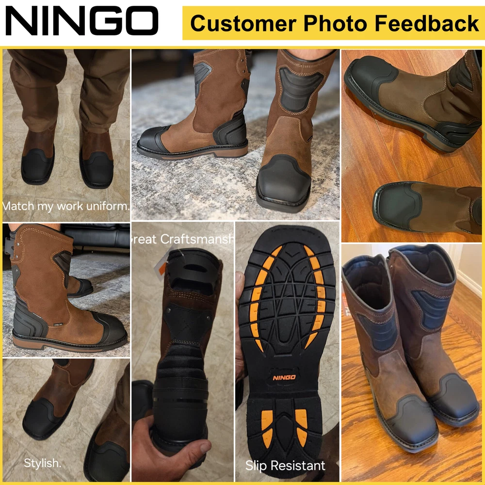 Search NINGO to surf entire catalog listing on eBay for additional great collections. Product Description: 1. [Motocross-Inspired Styling Work Boots] : When the job demands the toughest performance, NINGO work boots for men rise to the challenge. Inspired by motocross styling and packed with innovative performance features , these pull on boots combine rugged exterior design with our most advanced technology on the inside . Experience the ultimate in durability and comfort with square toe boots built to withstand the hardest work environments. 2. [Reliable Durability] : These Motocross-inspired boots are crafted using traditional Goodyear Welt Construction , renowned for its durability, solidity, water resistance, and longevity . Featuring a full-grain leather upper and an oil- and slip-resistant rubber lug outsole , these construction boots ensure secure footing in slippery conditions and provide exceptional abrasion resistance , making them ideal for demanding work environments. 3. [All-Around Protection] : Safety steel-toe meets or exceeds ASTM F2413-18 impact (I-75) and compression (C-75) , and the Electrical Hazard (EH) protection standards , giving you peace of mind while you tackle focused tasks. The steel toe boots for men equipped with waterproof membrane with moisture-wicking mesh lining that provides completely water protection , preventing moisture from penetrating into them, ensuring your feet stay comfortably dry when working in rainy or wet conditions. 4. [Comfortable & User-friendly] : The comfort footbed system of these safety boots features a lightweight EVA midsole , a rugged rubber outsole , and a removable, high-rebound insole with Gel padding in the heel , reducing muscle fatigue in your feet. The classic square-toe silhouette provides ample toe room and rugged pull tabs on back sides allow for easy on and off. U-Shape Entry System lets people with high arches easily slip on their boots and the protective shin guard for your extra protection. 5. [After-Sales Service] : These waterproof boots are commonly used in construction sites, factories, warehouses, and industrial settings where there are potential hazards. In addition to industrial settings, theses men's work & safety footwear are also suitable for outdoor activities like hiking, camping, and hunting, especially in rugged and unpredictable terrains. We love our buyers, One-year Quality Assurance backed by NINGO!