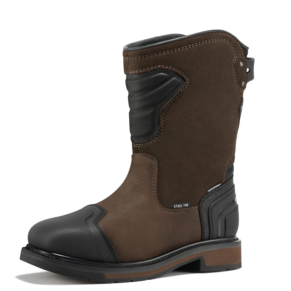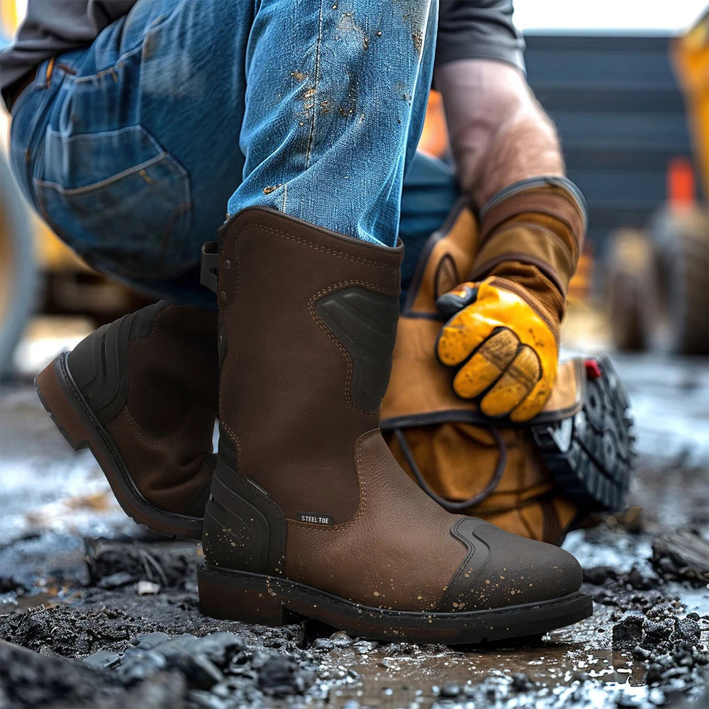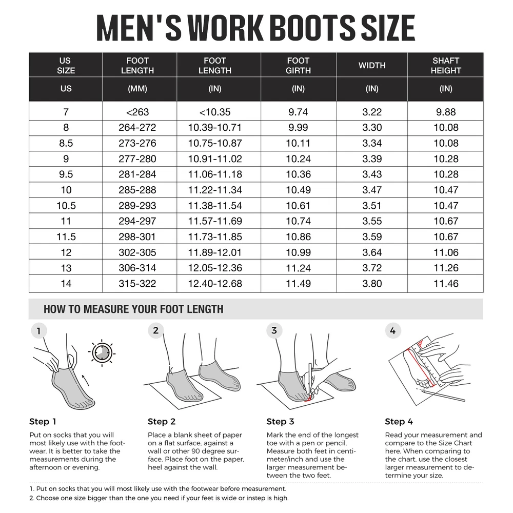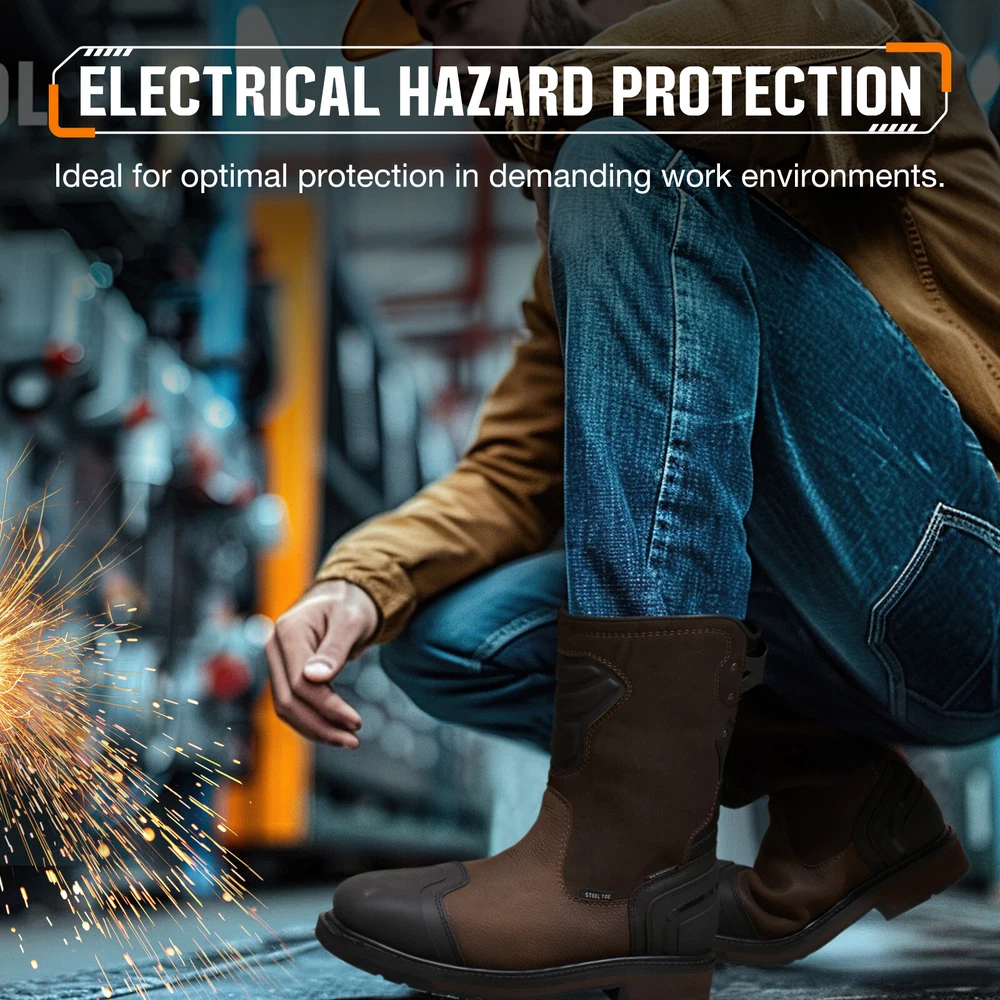 Search NINGO to surf entire catalog listing on eBay for additional great collections. Product Description: 1. [Motocross-Inspired Styling Work Boots] : When the job demands the toughest performance, NINGO work boots for men rise to the challenge. Inspired by motocross styling and packed with innovative performance features , these pull on boots combine rugged exterior design with our most advanced technology on the inside . Experience the ultimate in durability and comfort with square toe boots built to withstand the hardest work environments. 2. [Reliable Durability] : These Motocross-inspired boots are crafted using traditional Goodyear Welt Construction , renowned for its durability, solidity, water resistance, and longevity . Featuring a full-grain leather upper and an oil- and slip-resistant rubber lug outsole , these construction boots ensure secure footing in slippery conditions and provide exceptional abrasion resistance , making them ideal for demanding work environments. 3. [All-Around Protection] : Safety steel-toe meets or exceeds ASTM F2413-18 impact (I-75) and compression (C-75) , and the Electrical Hazard (EH) protection standards , giving you peace of mind while you tackle focused tasks. The steel toe boots for men equipped with waterproof membrane with moisture-wicking mesh lining that provides completely water protection , preventing moisture from penetrating into them, ensuring your feet stay comfortably dry when working in rainy or wet conditions. 4. [Comfortable & User-friendly] : The comfort footbed system of these safety boots features a lightweight EVA midsole , a rugged rubber outsole , and a removable, high-rebound insole with Gel padding in the heel , reducing muscle fatigue in your feet. The classic square-toe silhouette provides ample toe room and rugged pull tabs on back sides allow for easy on and off. U-Shape Entry System lets people with high arches easily slip on their boots and the protective shin guard for your extra protection. 5. [After-Sales Service] : These waterproof boots are commonly used in construction sites, factories, warehouses, and industrial settings where there are potential hazards. In addition to industrial settings, theses men's work & safety footwear are also suitable for outdoor activities like hiking, camping, and hunting, especially in rugged and unpredictable terrains. We love our buyers, One-year Quality Assurance backed by NINGO!