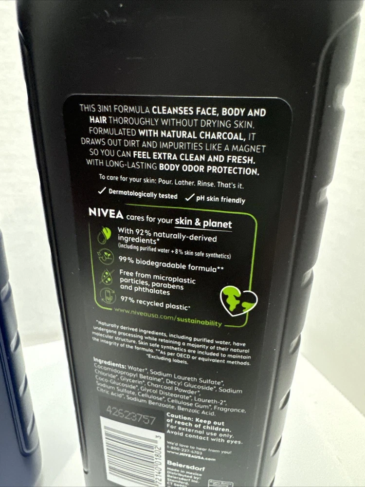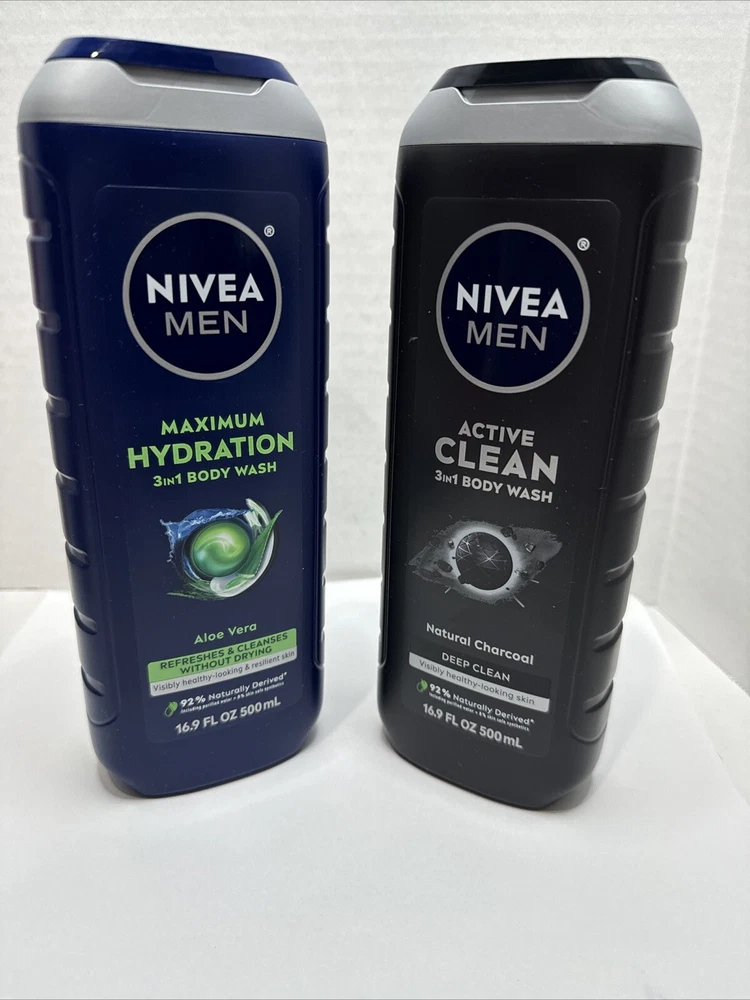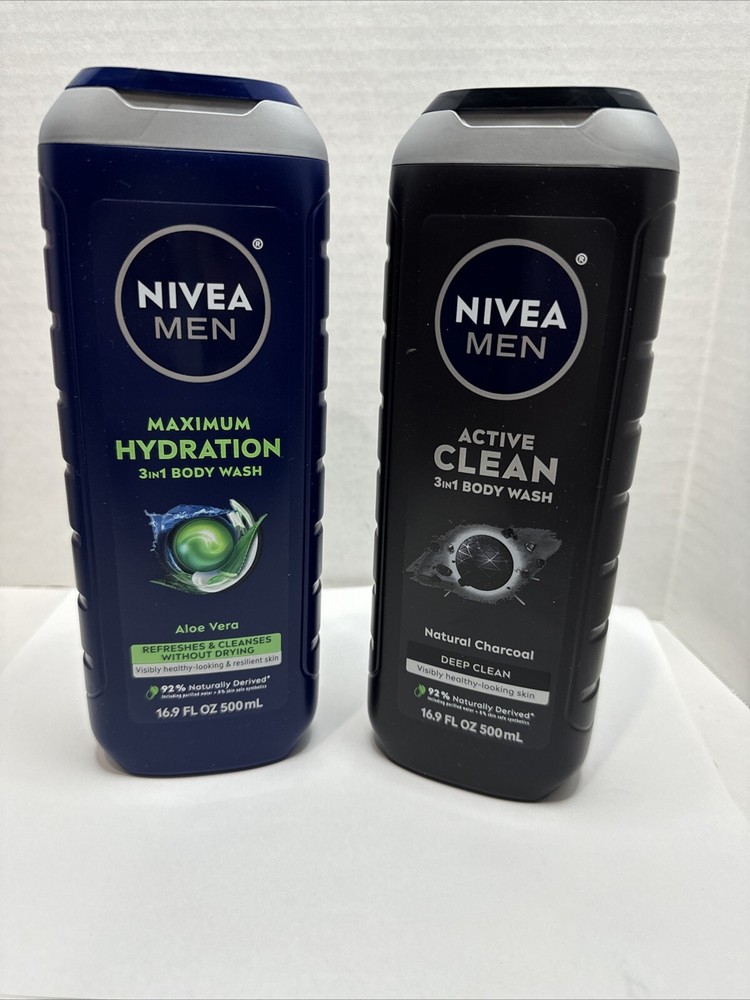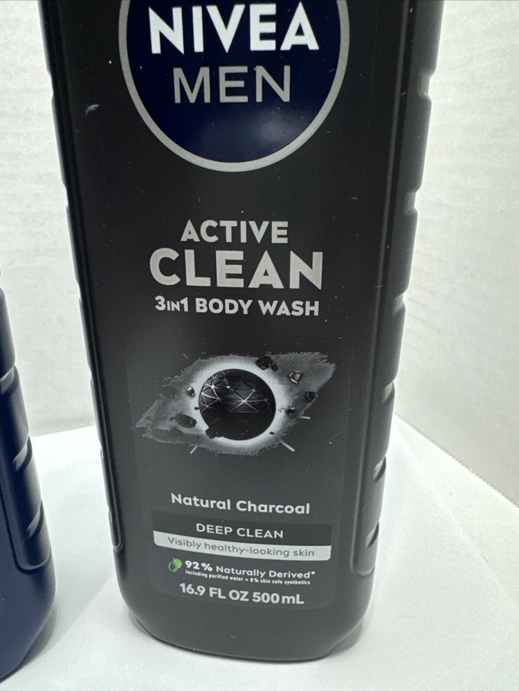 NIVEA Men Active Clean Body Wash With Charcoal & Aloe Vera 16.9 each Set 2. Hair, face & body wash ! New !