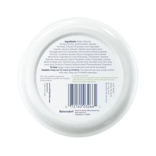 NIVEA Soft Refreshingly Moisturizing Cream, 16 Fl Oz (Pack of 1), White Product Details FACE, BODY AND HAND CREAM: An all-in-one face moisturizer, body cream and hand cream that delivers 48-hour hydration for softer skin NEW! MORE NATURALLY DERIVED FORMULA(1,2): This NIVEA moisturizing cream has a light, vegan(1) formula that is 95% Naturally Derived(3) including purified water and 5% skin safe synthetic ingredients(4) FAST-ABSORBING: NIVEA Soft is a fast-absorbing, lightweight moisturizer for dry skin with Vitamin E and Jojoba Oil that provides softer, smoother skin without a greasy feel ALL SKIN TYPES: This body moisturizer cream is suitable for all skin types BEST OF BEAUTY AWARDS: Allure Best of Beauty 2023 Award Winner INCLUDES: One (1) 16 ounce jar of NIVEA Soft Refreshingly Soft Moisturizing Cream For soft, beautiful skin count on NIVEA Soft Refreshingly Soft Moisturizing Cream. NIVEA Soft is an all-in-one refreshing face cream, body cream and hand cream that delivers 48-hour hydration for soft, supple skin. This body cream moisturizer is vegan(1) and the refreshingly light formula is enriched with Jojoba Oil and Vitamin E for softer, smoother skin without that greasy feel. This fast-absorbing body moisturizer is suitable for all skin types. NIVEA Soft cream gives dry skin on the body, face and hands the refreshing, hydrating skincare it deserves. To use, smooth this dry skin moisturizer onto your skin daily. For the best results, apply this dry skin cream after showering and on hands after washing them. NIVEA is proud to be one of the leading companies in the field of skin care products, with more than 130 years of expertise. (1)no animal derived ingredients (2)vs. previous formula (3)naturally derived ingredients have undergone processing while retaining the majority of their natural molecular structure (4)skin safe synthetic ingredients are included to maintain the integrity of the product (Myristyl Alcohol, Tocopheryl Acetate, Sodium Hydroxide, Phenoxyethanol, Fragrance)