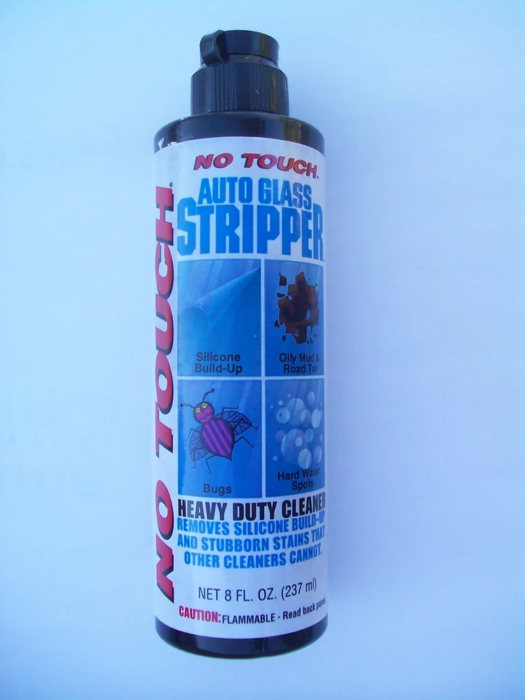 8 oz - NO TOUCH HEAVY DUTY AUTO GLASS CLEANER & STRIPPER Check videos courtesy of R. Arnold : https://www.youtube.com/watch?v=ANu3N6xNy-U https://www.youtube.com/watch?v=MVs9USVam6c Specially formulated for stubborn stains on AUTOMOTIVE WINDSHIELDS Strong cleaning agents and finely-ground abrasives eliminate stains that other glass cleaners cannot. Use it as a "Stripper' for that periodic removal of silicone film build-up, waxy grease. Removes Silicone, Hard Water Spots, Mud, Oil, Tar, Road Grime, Stains. Needs to be shaken well before using, It does separate into two liquids while stored MORE DISCOUNTS FOR LARGER QUANTITIES, JUST ASK FOR A QUOTE