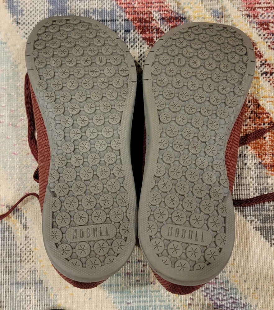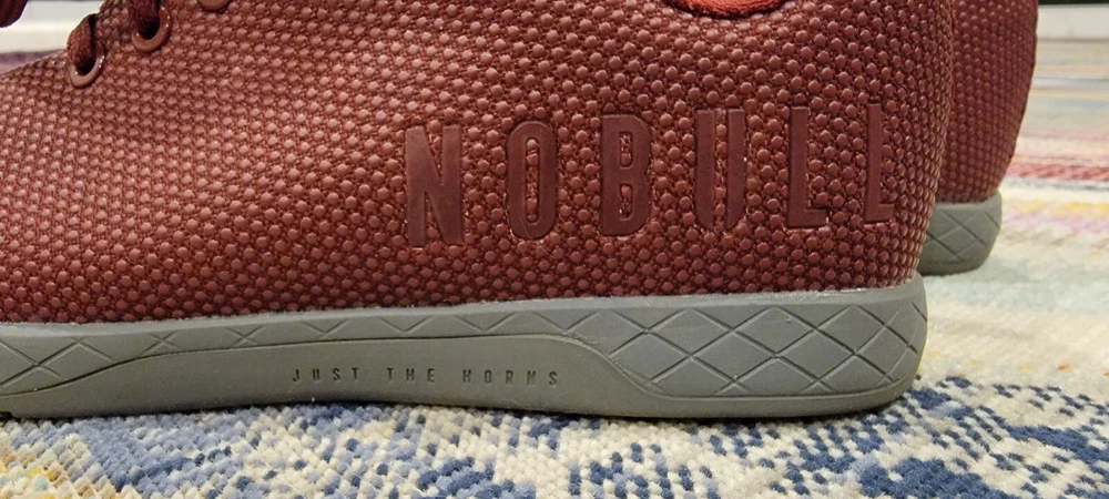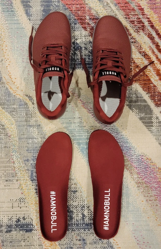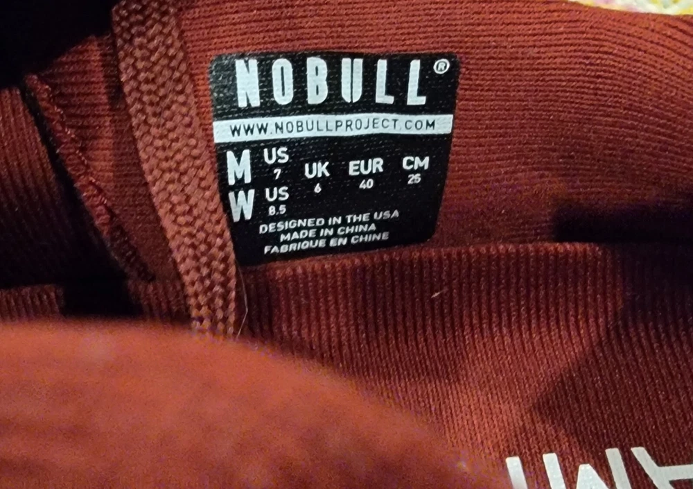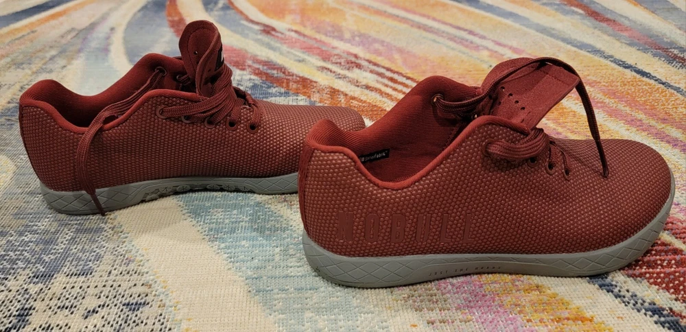Like-new pair of red womens size 8.5 U.S. NOBULL cross trainer shoes. Rubber soles, upper made of 'Superfabric(c)' with suede trim. Standard red laces. "NOBULL" logo on sides are also in red, logo is black & white on the tongue. Soles are marked with "JUST THE HORNS" on the exterior side of each shoe. Bottom of soles have *(asterisk) pattern. Removable insoles. Like-new condition. No damages, worn parts, tears or staining. Excepting the left shoe has its insole logo slightly worn. See photos.