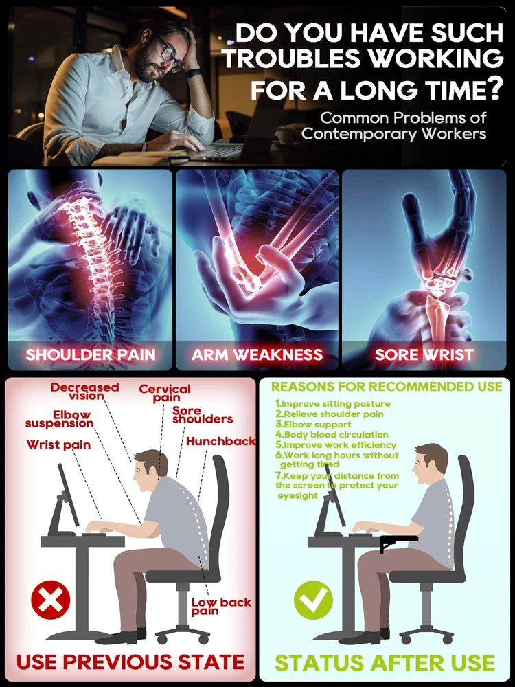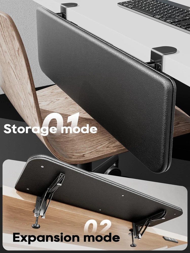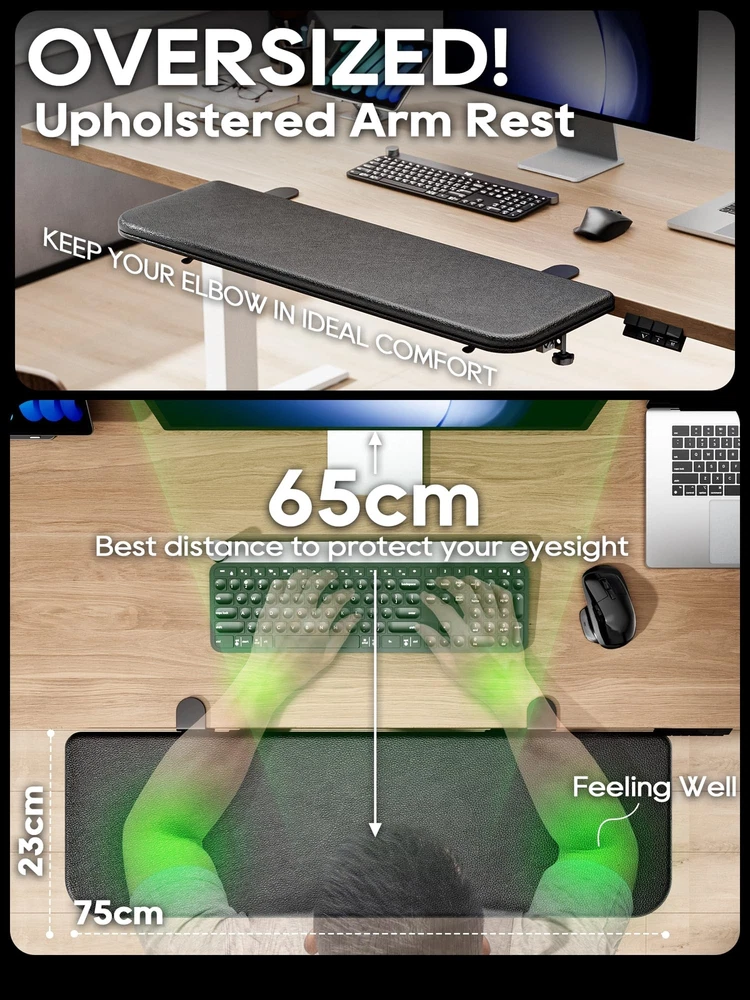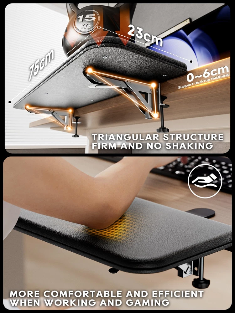 Arm Rest for Desk, Ergonomics Wrist Rest, Desk Extender, Soft Sponge Built-in, Comfortable Arm Support for Desk, Wrapped in Eco-Friendly Leather, Foldable Elbow Rest for Desk Ergonomic Design - Our computer armrest can effectively prevent your neck from leaning forward, relieve shoulder and neck fatigue, and help you maintain a certain distance between your eyes and the monitor, which can correct your working posture. Very Soft! - Compared with many similar armrests, we have made more ergonomic improvements to the material of our arm support. The Built-in 0.8-inch thick sponge and eco-friendly leather surface make the elbow rest very soft, relaxing your arms really. Super Bearing Capacity - 30''×9'', which can fully support your arms. Adopting triangular support structure that can bear a maximum load of 15KG. Punch-Free & Clamp on - Two desk clips are included in the package, and the elbow rest can be installed on desks up to 2 inches thick. Your Attention Plz: The effective length of the table edge must reach 5 cm/2 inches. Foldable - Foldable design can save your workspace. Folds up when not in use, no need to remove it from the desk. You also can place a notebook, mouse, or other items.