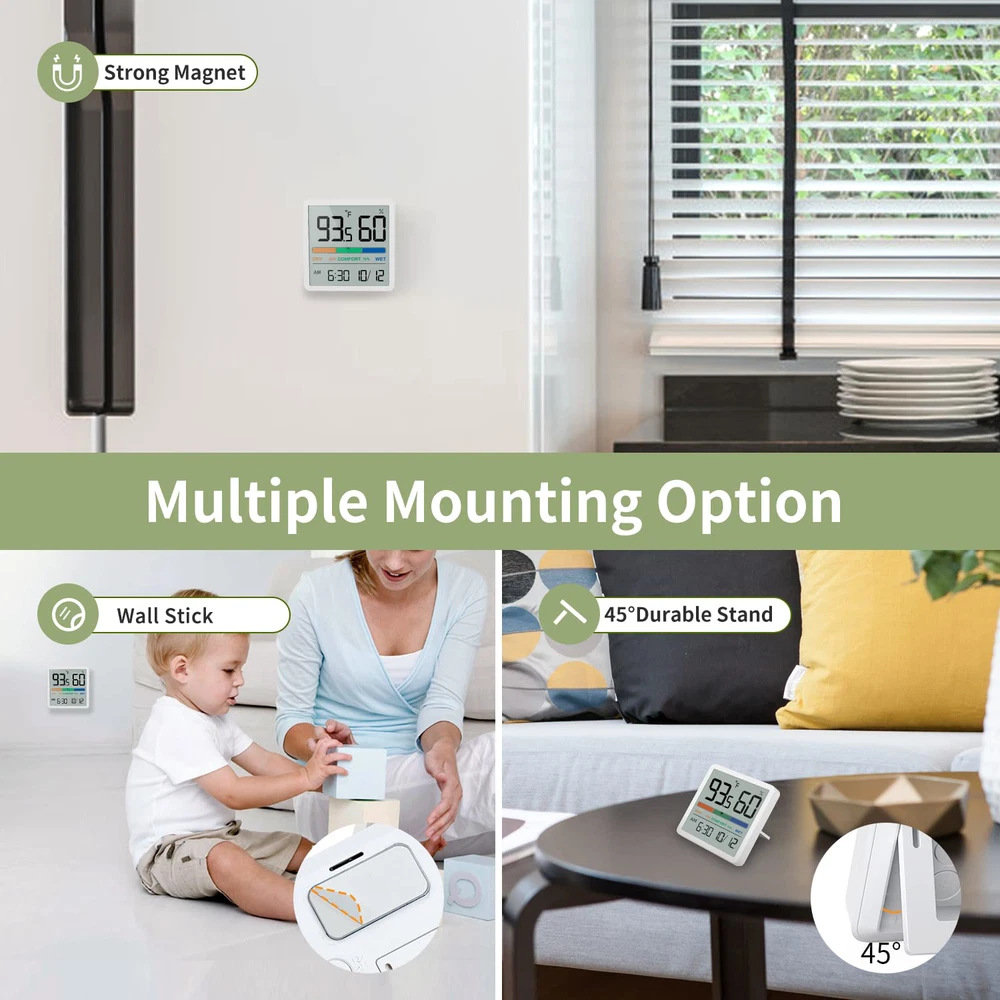 【Fast Refresh & High Accuracy】This digital indoor thermometer room hygrometer refreshes every 10s to provide updated and the latest accurate readings. Wide measuring range that measures temp from 14.2˚F-140˚F(-9.9˚C-60˚C ) and relative humidity from 10%-95%, temperature accuracy: +-2˚F(1˚C); relative humidity accuracy: +-3%RH 【Air Comfort Indicator】Digital moisture meter with humidity indicator bar quickly shows DRY/COMFORT/WET air conditions with a glance. Reminding you to adjust the humidifier or dehumidifier. It is perfect for monitoring your family's living conditions to create the right environmental state to effectively prevent colds, dry skin, asthma, allergies and more 【3.34in LCD Display & Easy to Read】Small humidity temperature monitor with clear bold numbers features neat and slim border, easier to read from any angle and distance. While it's portable and lightweight to carry around easily. Switch Celsius/Fahrenheit by pressing '+', 12h/24h selector by pressing '-'. NOTE: No backlight function 【Minimalist Design with 3 Mounting Options】The inside humidity gauge thermometer can be mounted in a variety of ways: desktop stand, magnet attaching, stick on the wall via the metal adhesive pad. You can stick or place it anywhere you like, such as fridge, counter, living room, greenhouse, baby room, nursery, kitchen, basement, office, conservatory, guitar room, office, garden, cellar, warehouse and more 【Battery Powered and Long Battery Life】Coming with 2 x CR2032 button cell batteries, each battery lasts 8-12 months. The NOKLEAD indoor hygrometer also display the time and month date. If you have any issues with the humidity reader instrument, please contact us and be willing to provide the best solution for you 【Upgraded Calibration Function】:When the product placement or environmental factors impact data accuracy,you can calibrate the sensor for the most-accurate humidity and temperature data. (Temp:Max +-5℃/+-41℉;Humidity:+-10%RH.)