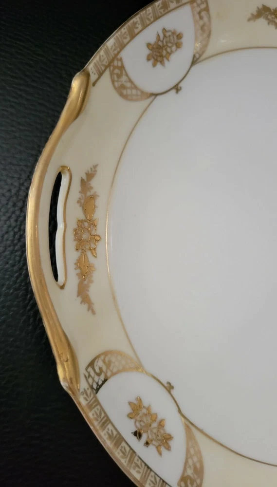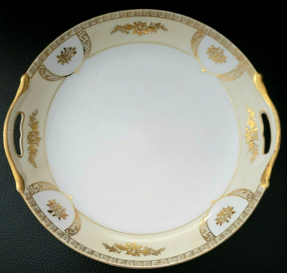 Noritake Cake plate is white with gold accents, gold trim and handles. Measures 9 3/4" in diameter. Circa 1920's Check out my other items, I combine shipping! Payment Payment is requested within 3 days. If no contact or payment is made within 3 days, a dispute will be filed and the item relisted. Shipping Your item(s) will be shipped within 1 business day of payment received. Delivery confirmation is included on packages shipped to a US destination. Insurance is included. For a quote, add items to the shopping cart. International Shipping All duties or tariffs, if any, are the responsibility of the buyer and seller does not have any control over these charges or delays due to custom's inspections. Returns Please contact me if you have any problems. Buyer to pay return shipping unless the item is not as described.