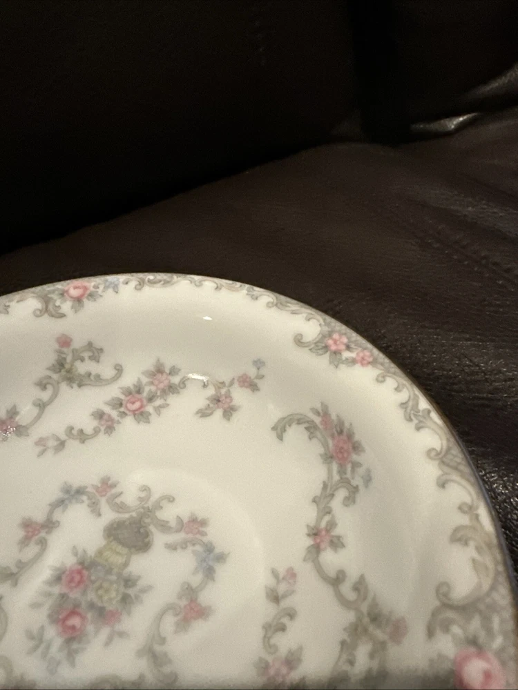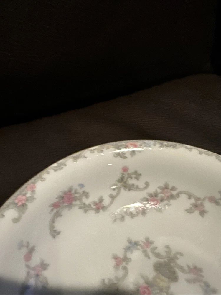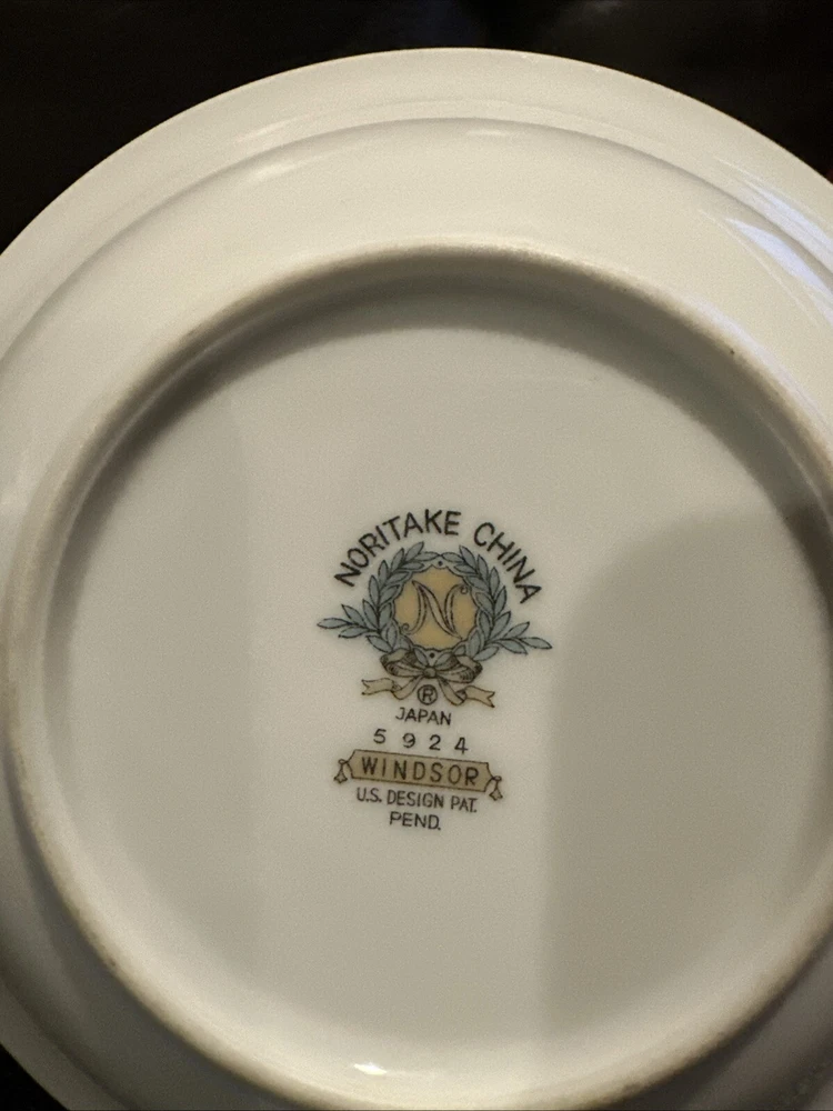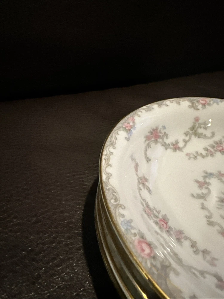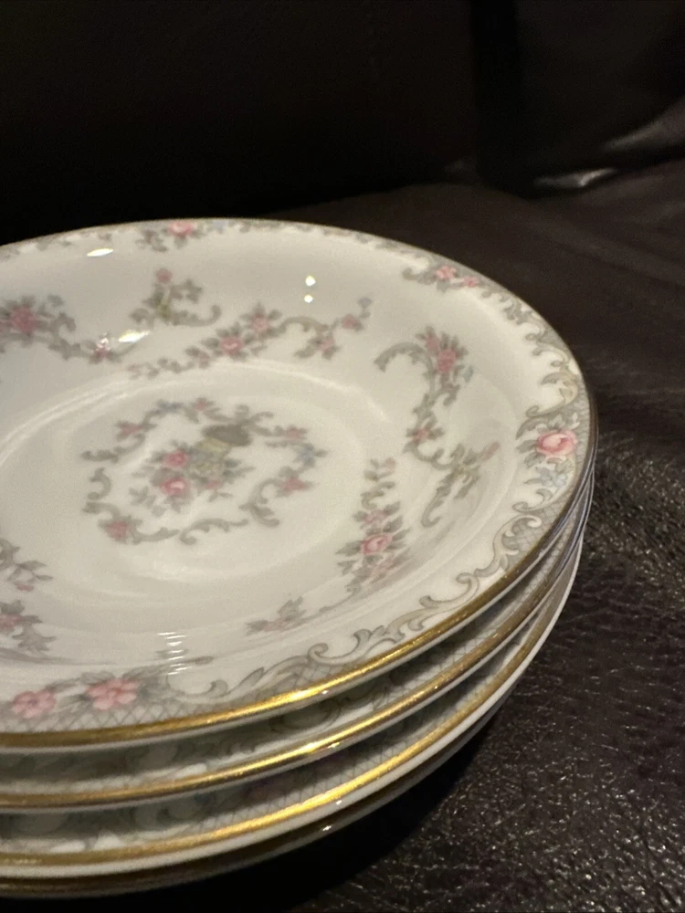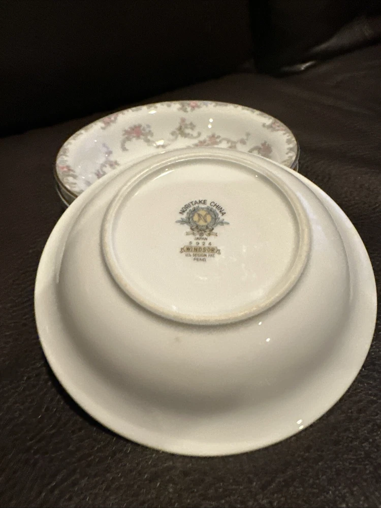 This elegant set of four dessert bowls by Noritake features a beautiful Windsor pattern with gray scrolls and pink and blue flowers. The bowls are made of high-quality porcelain and have a glossy finish. Each bowl is 5.5 inches in diameter and has a gold trim on the edge. This set is perfect for all occasions and is a great addition to any mid-20th century collection. The bowls were manufactured in Japan in the 1950s and are an original Noritake product.