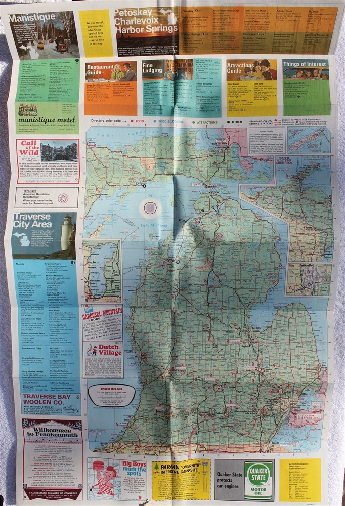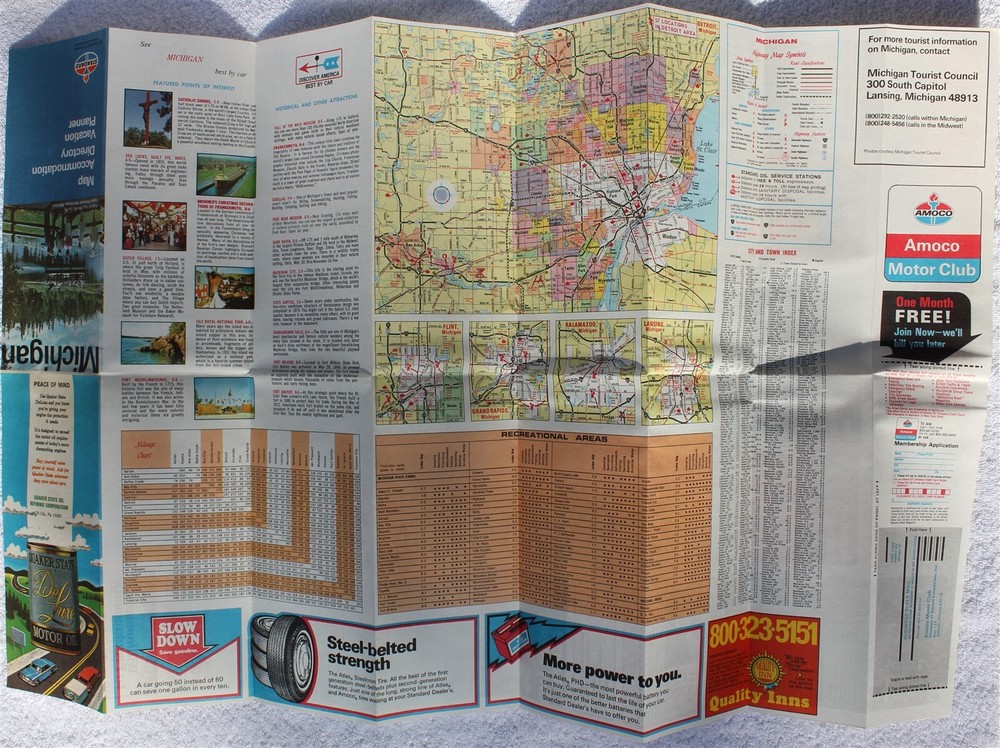 NOS 1976 Michigan Map Accommodation Directory Vacation Planner Standard Oil Co Great Addition to Collector Car of Similar Vintage Features: Double Sided On Front Michigan Map, Guides & Ads On Reverse is the Following: Featured Points of Interest Historical and Other Attractions Mileage Chart City Maps Recreational Areas Map Symbols City and Town Index © By Amoco Oil Company Published by Tempo Designs Inc. Printed in U.S.A. Some of the More Notable Ads Include: Quaker State Motor Oil Atlas Tires & Batteries Quality Inns Call of the Wild Museum Big Boy Parma "Overnite" Interstate Campsite Approximate Dimensions: 9" Tall Folded 4" Wide Folded 1/16" Thick 29" Tall Open 17 3/4" Wide Open Condition: New Old Stock Please See Photos Selling Policies Great care is taken to accurately describe items for sale. Please read descriptions and view photos carefully and ask questions if anything is unclear. Payment must be made within 7 days of auction end. Michigan residents must add 6% sales tax. International buyers please note: import duties, taxes and charges are not included in the item price or shipping cost and are buyer's responsibility. In no event will seller’s liability exceed purchase price plus shipping cost of items purchased. When you receive your item, if you are happy with your purchase please let me know by leaving positive feedback and the same will be done for you. It is important for me to earn five star ratings from my customers. If you feel I did not earn 5 star ratings please email me before you leave a rating so I can correct any problems. Thank you for looking at my item! Powered by SixBit's eCommerce Solution
