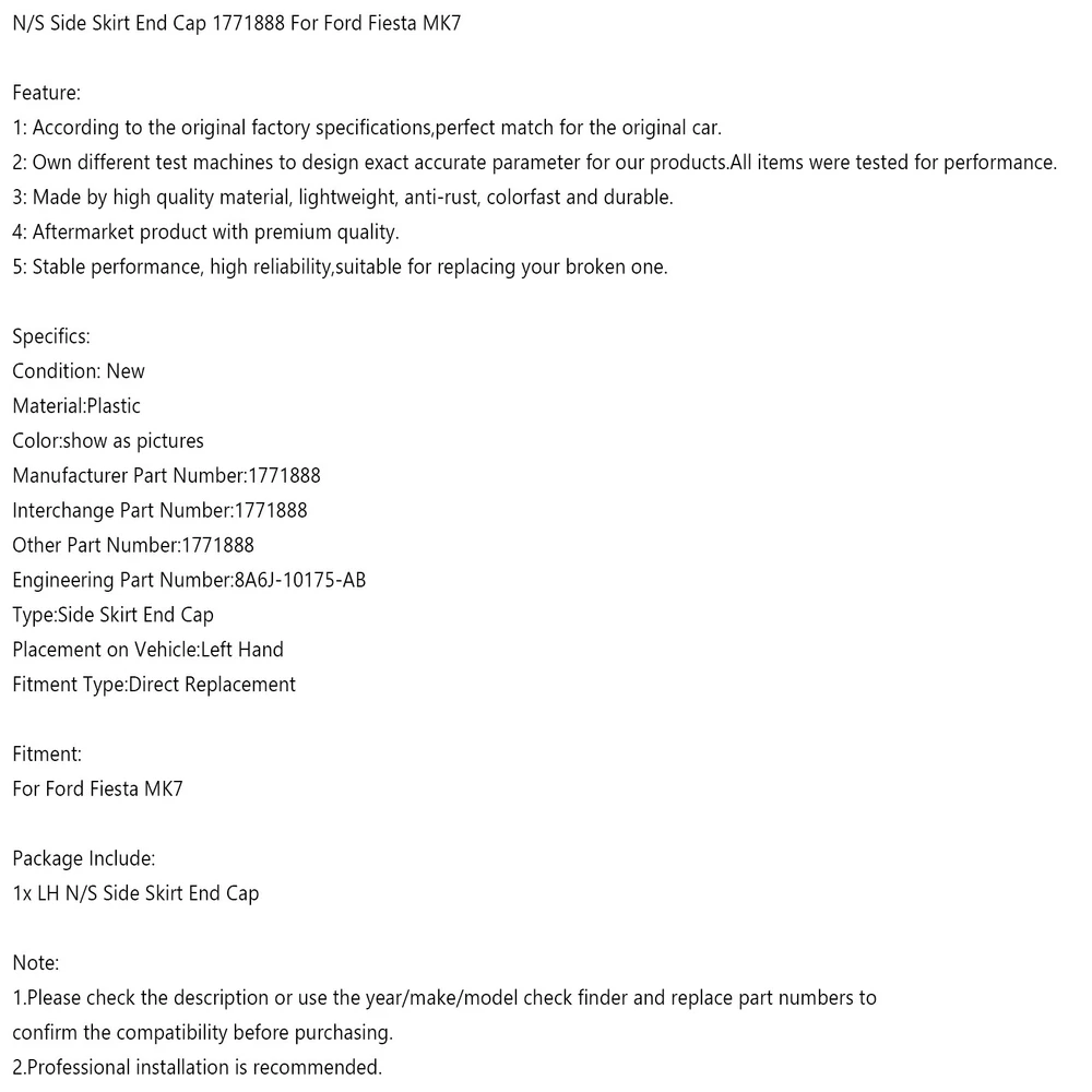 6L80 6L90 Transmission Rebuild 1-2-3-4 3-5-Reverse Clutch Seals Pack O-Rings 20.89 USD 21.99 USD Free shipping 5% off For Peterbilt Door Latch Striker R56-6017 16.57 USD Free shipping ABS Anti-Lock Brake Pump Assembly 57110-T2F-L22 for Honda Accord Sport 2.4L 2014 553.65 USD 582.79 USD Free shipping 5% off Clutch Cable For Honda CBR900 CBR954 Fireblade 2002-2003 CBR929 2000-2001 UE UE 16.27 USD Free shipping 158x Motorbike Purple Fastener Clip Screw Kit Windscreen Fairing Bolt YU 19.79 USD Free shipping Chrome Fairing Saddlebag Light Accents Fit Honda Goldwing GL1800 2001-2011 47.3 USD 49.79 USD Free shipping 5% off Oil Cooler Filter Housing Seal Gasket O-ring 21304-JA11A For Nissan Armada Titan 10.68 USD Free shipping Air Pressure Sensor for Multistrada 1200 Panigale 899 959 1199 Diavel 55241571A! 23.79 USD Free shipping Rear Bumper Reflectors Fog Light Lamp Pair For Bmw 5Series F10 F18 2014 2015 U9 24.79 USD Free shipping 2x Intake Manifold Boot Flange for Polaris Indy Trail 488 500 86-00 3085044 U.S 28.79 USD 30.31 USD Free shipping 5% off Cylinder Head Cover Gasket for Yamaha VMX12 V-Max1200 88-07 XVZ1200 26H-11193-00 24.73 USD 26.03 USD Free shipping 5% off Rectifier Regulator For Yamaha 40-70Hp Outboard 50hp 60hp 2000-17 6H2-81960-10 23.55 USD 24.79 USD Free shipping 5% off A Fantastic Shop Send us a message Our Store Seller Profile Feedbacks Save this seller Contact N/S Side Skirt End Cap 1771888 For Ford Fiesta MK7 N/S Side Skirt End Cap 1771888 For Ford Fiesta MK7 Feature: 1: According to the original factory specifications,perfect match for the original car. 2: Own different test machines to design exact accurate parameter for our products.All switches were tested for performance. 3: Made by high quality material, lightweight, anti-rust, colorfast and durable. 4: Aftermarket product with premium quality. 5: Stable performance, high reliability,suitable for replacing your broken one. Specifics: Condition: New Material:Plastic Color:show as pictures Manufacturer Part Number:1771888 Interchange Part Number:1771888 Other Part Number:1771888 Engineering Part Number:8A6J-10175-AB Type:Side Skirt End Cap Placement on Vehicle:Left Hand Fitment Type:Direct Replacement Fitment: For Ford Fiesta MK7 Package Include: 1x LH N/S Side Skirt End Cap Note: 1.Please check the description or use the year/make/model check finder and replace part numbers to confirm the compatibility before purchasing. 2.Professional installation is recommended. About US About Our Items We strive to describe all items accurately and thoroughly, with the utmost care and attention to detail. However, to ensure a mutually satisfactory transaction, we kindly ask for your assistance in thoroughly reviewing the item description and photos, and addressing any questions before placing a bid. Customer Satisfaction We stand behind our commitment with exceptional service, a 100% money-back guarantee, and a dedication to customer satisfaction. I am readily available to address any inquiries or concerns you may have, both before and after your purchase. Our aim is to ensure your shopping experience is enjoyable and that you're delighted with your purchase. Feedback Your feedback is crucial to our business's success. If you're satisfied with your purchase and the service you received, we would greatly appreciate your positive feedback, along with an overall Detailed Selling Rating (DSR) of 5. Please take a moment to leave us positive feedback. Our eBay account is set up to automatically reciprocate positive feedback once yours is received. If you're considering leaving neutral/negative feedback or opening an eBay/PayPal case, we encourage you to reach out to us immediately. We're committed to resolving any issues to the best of our ability. Shipping Parcel will be shipped using Standard shipping method. For security purposes, items will be shipped exclusively to the confirmed address on Paypal. Please ensure your Shipping address is up to date before proceeding with payment. Estimated delivery time within the United States ranges from 3 to 10 business days, depending on your location. Returns We accept returns within 60 days from the date the buyer receives the item. If the item is found to be defective upon receipt, the customer has up to 30 days from the date of receipt to request an exchange for a new item or a refund. For returns due to a change of mind, we accept items in their original selling condition. However, if the package has been opened due to a mistaken order, it does not qualify for our return policy. Please note that the buyer is responsible for covering the cost of return postage. If you encounter any issues, please reach out to us via eBay message, and we'll respond within 24 hours. L+R Door Window Weather Molding 72410-S03-003 For HONDA CIVIC EK 1996-2000 44.87 USD Free shipping NEW 2pcs Front Door Window Belt Weatherstrip Fits for Toyota Tundra 04-06 65.79 USD Free shipping Headlight Fillers Primed For BMW 3-Series 2000-2003 M3 E46 Coupe 2001-06 37.66 USD Free shipping Car Mount For Phone Stand Holder Perfect For Bmw Mini Cooper F54 F55 F56 F57 F60 18.59 USD 19.57 USD Free shipping 5% off 2x Front M Sport Bumper Moulding Trims For BMW 7 Series F01 F02 2009-2015 55.65 USD 58.58 USD Free shipping 5% off Rear Trunk Lid Weatherstrip Rubber Seal 64461-06060 For Toyota Camry 2007-2011 35.87 USD Free shipping 4PCS Weatherstrip Window Seal Belt 72410-SCA-E01 For Honda CR-V CRV 2002-2006 36.78 USD Free shipping Weatherstrip Door Belt Set 5727A005 5727A006 For MITSUBISHI LANCER 2008-2017 55.87 USD Free shipping Wheel Housing Arch Lining Cover Bulb Change Flap For BMW F22 F23 F32 F33 13.51 USD Free shipping 2x Door Speaker Cover For Mercedes For Benz C Class W203 Coupe /CLC 2008-2011 56.87 USD Free shipping 2x Chrome C Pillar Rear Door Cover Exterior Molding Trim For KIA Sportage 11-16 32.79 USD Free shipping 4pcs Weatherstrip Outer Lower Window For Toyota Tundra 2000-2006 Double Cab 99.87 USD Free shipping