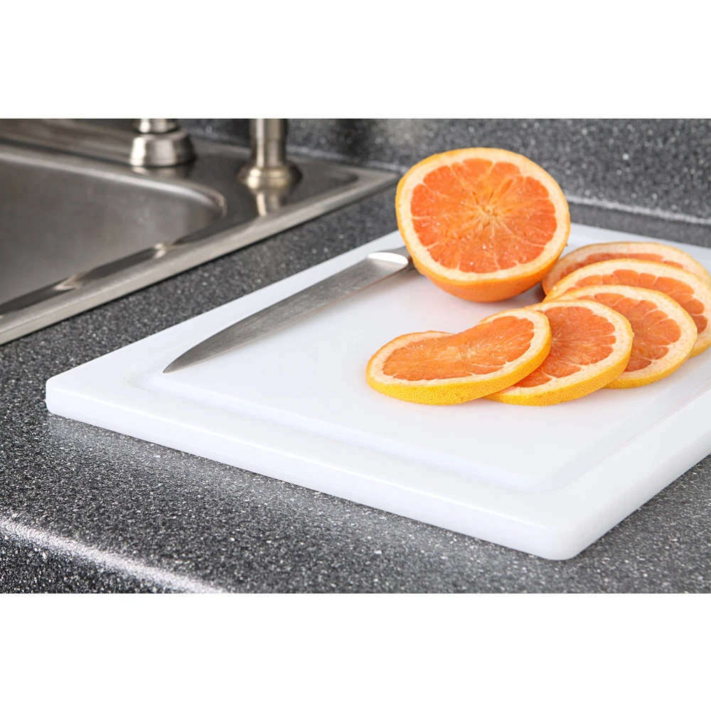This all-purpose, durable cutting board is designed for use in either commercial or residential settings. The cutting board is made from high-density poly that is non-absorbent and non-porous. This cutting board is reversible- side is completely flat, the reverse features an integrated juice well to collect juices while carving and cutting fruits, meats, vegetables and more. This cutting board is approved by the NSF, the National sanitation foundation and is dishwasher safe. This cutting board is proudly made in the USA. Perfect size: this cutting board measures 12 by 16 by 5/8 inches and is ideal for a variety of tasks Quality construction: cutting board is made from high-density poly and is non-absorbent and non-porous NSF approved: this cutting board has been approved by the NSF, (National sanitation Foundation) Integrated juice well: this cutting board is reversible- side features an integrated juice well for collecting fruit or meat juices in use Made in the USA: this cutting board is proudly made in the United States of America Simple care: this cutting board is dishwasher safe