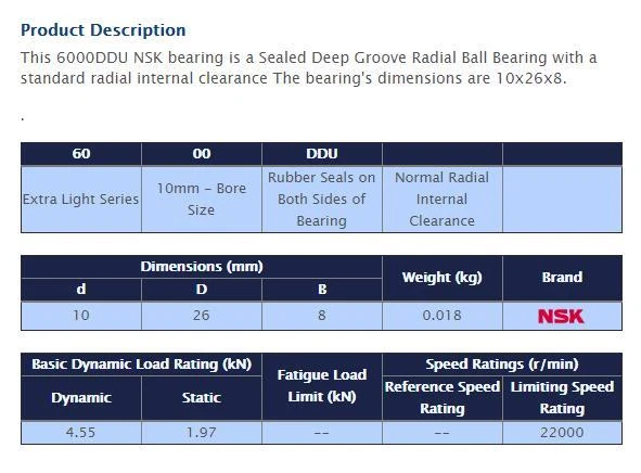 Description: Product characteristics Category:Deep groove ball bearings Ball rows:Single row bearing Material:Standard bearing steel Outer ring:Without flange/groove Seal:Contact seals on both sides Clearance:Normal radial clearance Cage:Sheet steel cage Temperature range:-20 to +120 °C Tolerance class:Tolerance class P0/PN2 / ABEC 1 Current insulation:No current insulation Bore:Cylindrical bore Material of rolling elements:Standard bearing steel Weight:0,017 kg ProductID:10105487 Country of origin: Indonesia Customs tariff number:8482 1010 EAN:not available Dimensions Inner dimension: 10,000 mm Outer dimension: 26,000 mm Width: 8,000 mm Package Includes : One (1) 6000 DDU NSK bearing On Oct 24, 2024 at 02:44:44 PDT, seller added the following information: On Nov 19, 2024 at 01:33:39 PST, seller added the following information: On Dec 10, 2024 at 23:21:58 PST, seller added the following information: