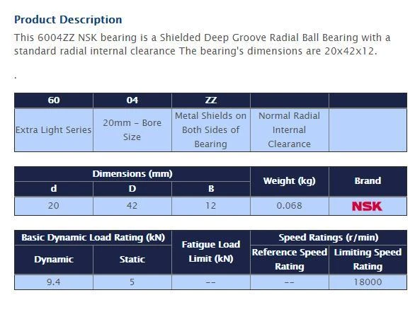 Specifications Clearance C0 (Normal) Bore Size d 20 mm Features Shields Bearing Type Standard DGBB Weight 0.070 Kg Dimensions Outside Diameter D 42.000 mm Outside Ring Width B 12.000 mm Radius Rs min 0.600 mm Basic Load Ratings Cr - Dynamic Load Rating 9.4 kN C0r - Static Load Rating 5 kN Factors Grease Reference Speed 17000 rpm Oil Reference Speed 25000 rpm On Dec 11, 2024 at 20:58:23 PST, seller added the following information: