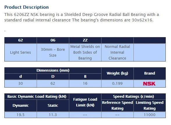 Description: NSK 6206 ZZ DEEP GROOVE BALL BEARING, METAL SHIELDED 30x62x16 mm Product characteristics Category: Deep groove ball bearings Ball rows: Single row bearing Material: Standard bearing steel Outer ring: Without flange/groove Seal: Cover on both sides Clearance: Normal radial clearance Cage: Sheet steel cage Temperature range: -20 to +120 °C Tolerance class: Tolerance class P0/PN2 / ABEC 1 Current insulation: No current insulation Bore: Cylindrical bore Material of rolling elements: Standard bearing steel Weight: 0,199 kg Product ID: 10105815 Country of origin: Poland Customs tariff number: 8482 1090 EAN: not available Dimensions Inner dimension: 30,000 mm Outer dimension: 62,000 mm Width: 16,000 mm Package Includes: ONE (1) NSK BEARING 6206 ZZ