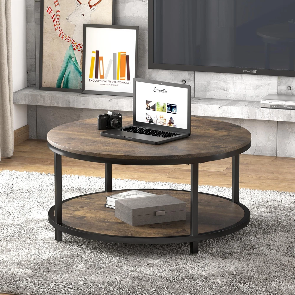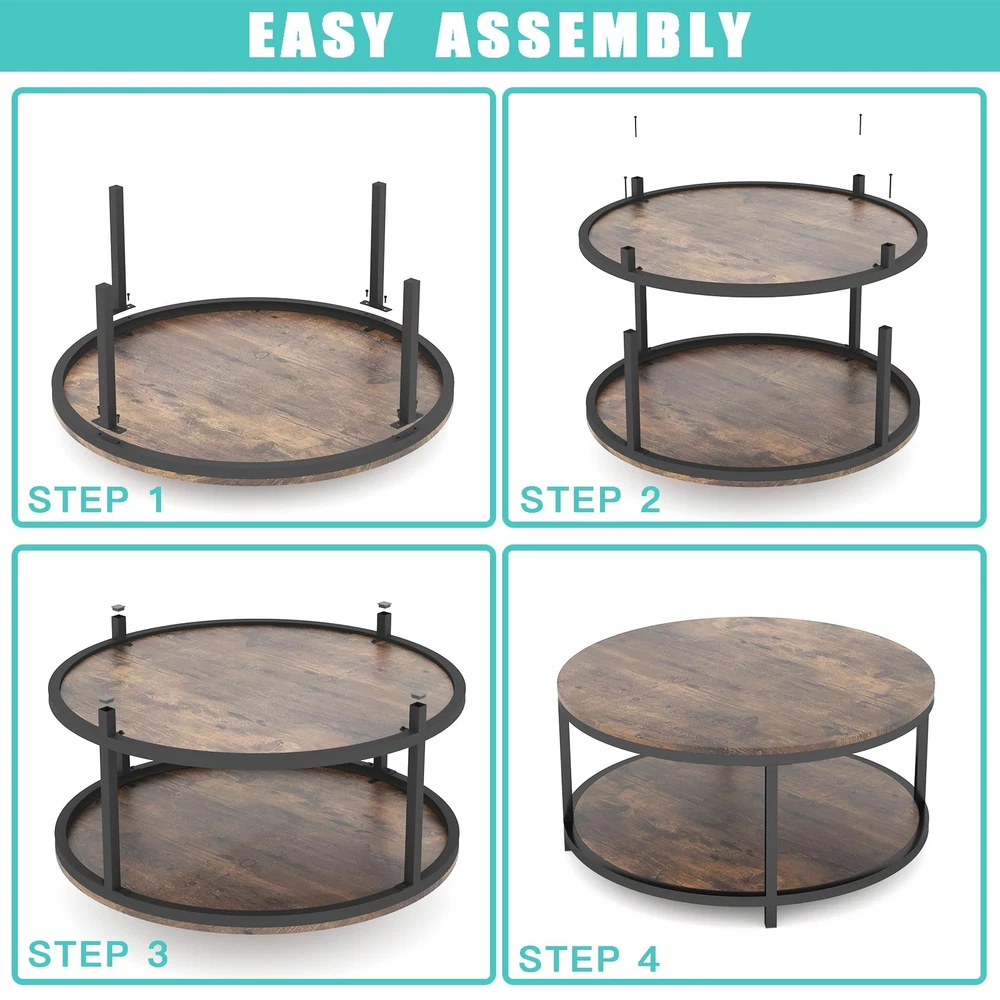 NSdirect 36 inches Round Coffee Table, Rustic Wooden Surface Top & Sturdy Metal Legs Industrial Sofa Table for Living Room Modern Design Home Furniture with Storage Open Shelf (Brown) [2-Tier Coffee Table]The round table top is 36 inch, which provides spacious space for living room supplies and keep your daily essentials nearby. The bottom shelf is 33.5", gives you extra space to store magazines and toys, and make your room tidy and neat. [Sturdy Wood Coffee Table] The top of our round coffee table is made of MDF material which is Eco-friendly P2 particle board, waterproof and wear-resistant, Multi-step finish process achieves both good looks and superior durability. Thick matte alloy legs sturdy enough to support the coffee table. [Round Classical vintage Coffee Table] High quality imitation wood grain finish that enhances the natural beauty of the table. Simple construction to create an attractive look and feeling. Fits well with your personal taste and interior decor. It can match with any style of living room, no matter your living room has a simple decoration or luxury style. [Easy to Assemble] Easy assembly in 15-30 minutes. Wipe with soft dry cloth. The packaging contains all needed tools and instructions. [We Promise] 3 years warranty. And you can always contact us by using Amazon email. Product Description NSdirect products are designed to make your home comfortable, convenient and safe. NSdirect brings comfort to every home. We offer you furniture that lasts, and we only work with trusted crafters and designers to meet the wants and needs of our customers. The 2-tier coffee table is 36 inch, which provides spacious space for living room supplies, to keep your daily essentials nearby. Specifications: -Material: Wood, environmental P2 MDF, powder coated metal, -Surface of Wood: PVC coated, -STEEL TUBE:25*25*0.8mm, -MDF: 15MM, -Rustic walnut color, Rugged materials for long-term use,waterproof and wear-resistant, Multi-step finish process achieves both good looks and superior durability. fits well with your personal taste and interior decor, match with any style of living room, no matter if it is simple decoration or luxury style. Package contents: - 39*38.1*5.1 inch - 1PC/PACKAGE - 1 x user manual Easy assembly in 15-30 minutes We Promise: Free returns for 30 days. 3 years warranty. Shipping We offer FREE shipping on all orders! We ship within Three business days of payment, usually sooner. We use a selection of shipping services such as UPS, FedEx, USPS etc. We only ship to the lower 48 states, no APO/FPO addresses or PO Boxes allowed. Local pickups and combined shipping options are not provided at this time. Return You can return a product for up to 30 days from the date you purchased it. Any product you return must be in the same condition you received it and in the original packaging. Please keep the receipt. Payment We accept payment by any of the following methods: PayPal Please pay as soon as possible after winning an auction, as that will allow us to post your item to you sooner! Feedback Customer satisfaction is very important to us. If you have any problem with your order, please contact us and we will do our best to make you satisfied. Contact Us If you have any queries, please contact us via ebay. We usually respond within 24 hours on weekdays. Please visit our eBay store to check out other items for sale! Thank you for shopping at our store.