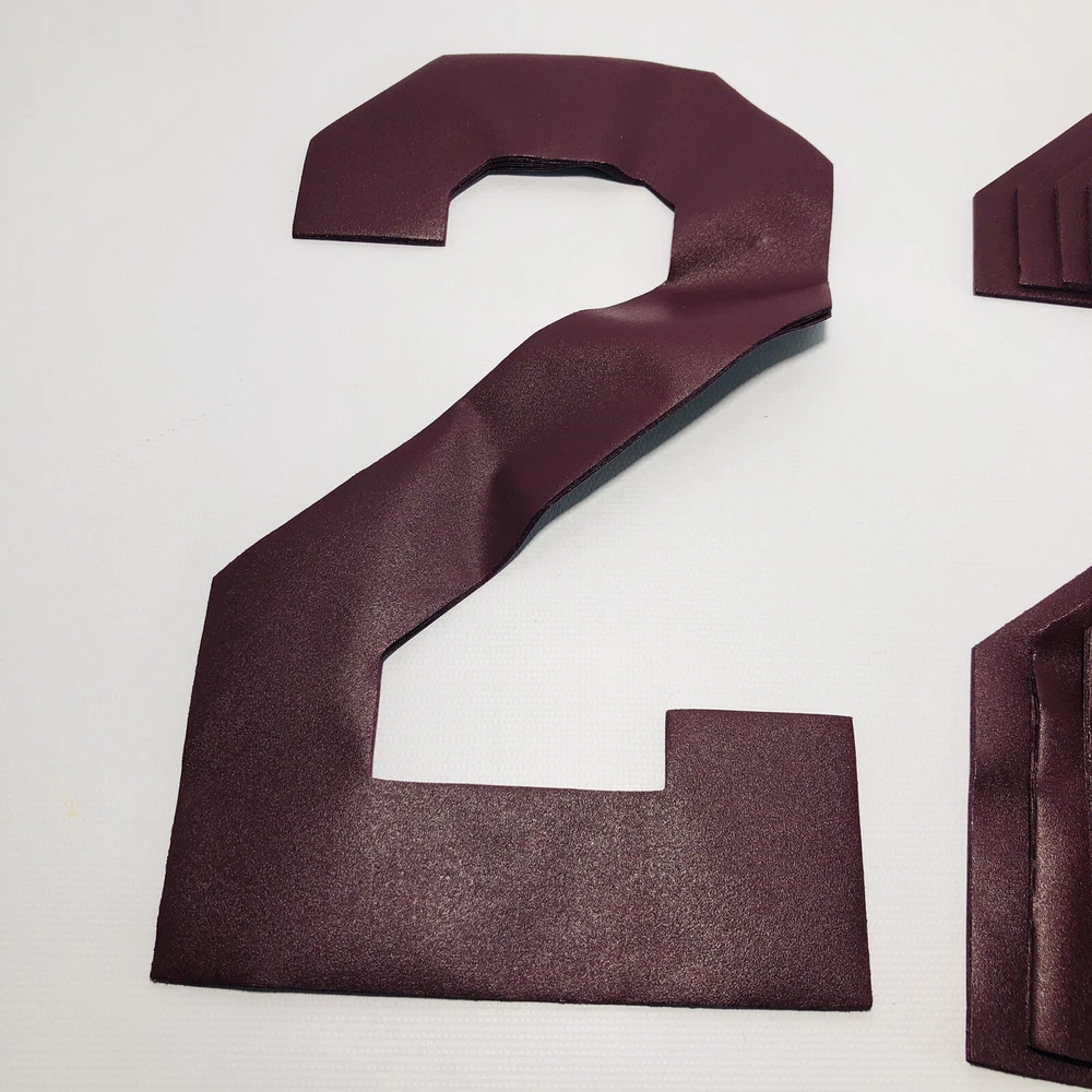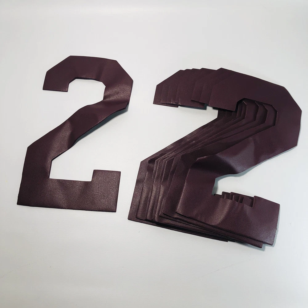 NWD x100 Custom Jersey Number Iron On Appliques Sports Burgundy #2 9"x 6" Vinyl Condition : This item is new with defects! This item shows some wrinkles due to prior storage that should iron out during application. Please see the images for details! Includes x100 #2 Burgundy Iron-On Numbers (x10 bundles of 10) Numbers measure approx. 9.75" Tall x 6" Wide 30 Day Returns
