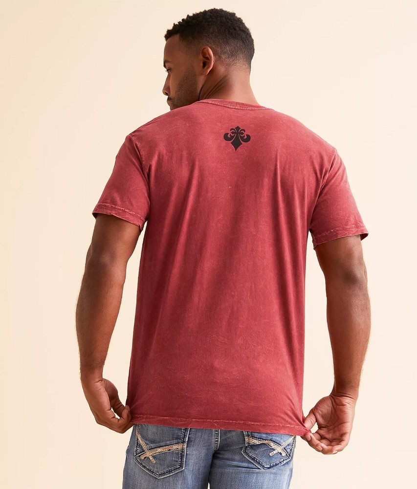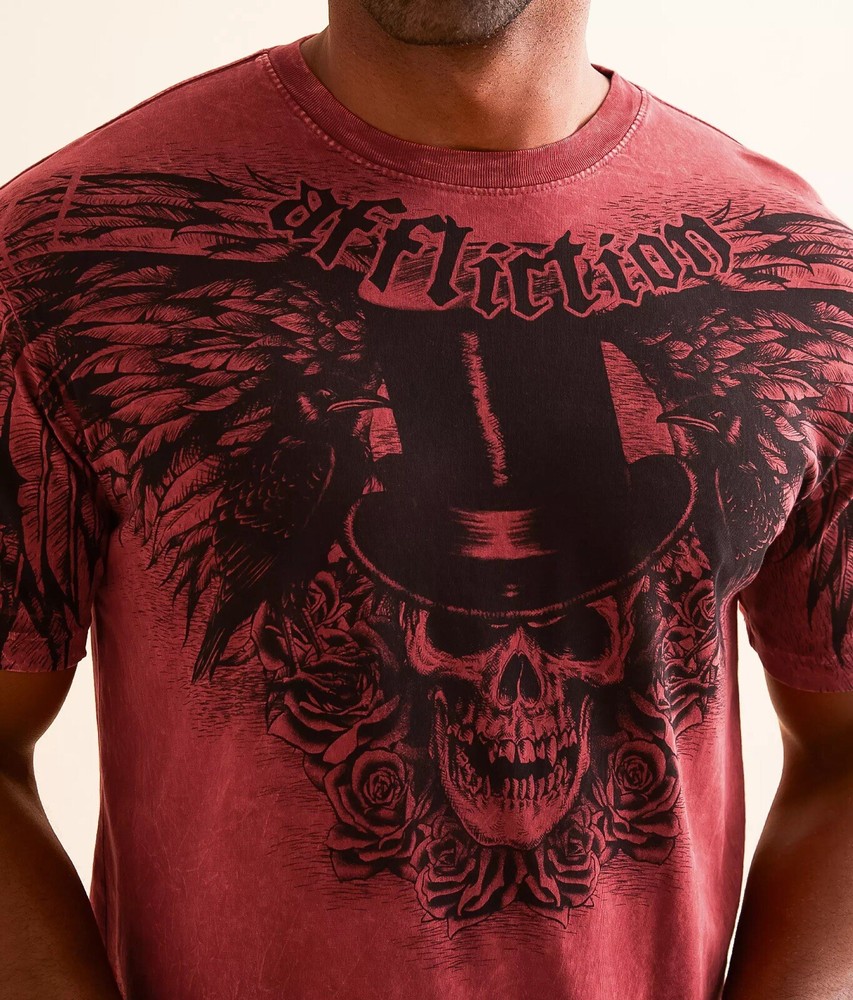 This NWOT Affliction Men's Red Absinthe T-shirt in size S features a graphic print showcasing roses, wings, skulls, and a clown motif. The shirt has short sleeves, a crew neck, and is made of cotton. It has a regular fit and is suitable for all seasons. The design is bold and edgy, making it a stylish choice for men who appreciate unique and eye-catching fashion. No defects such as tears, holes, rips or stains. No refunds, returns, or exchanges If you have any questions regarding this item or any of the other items listed please message me. Thank You!