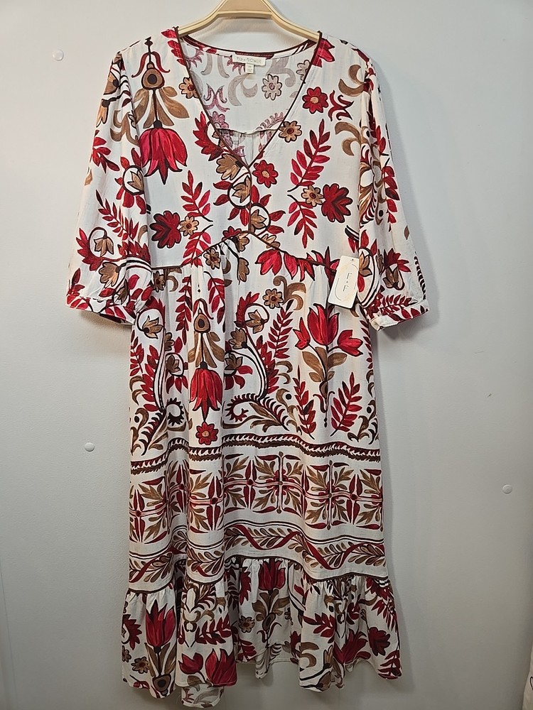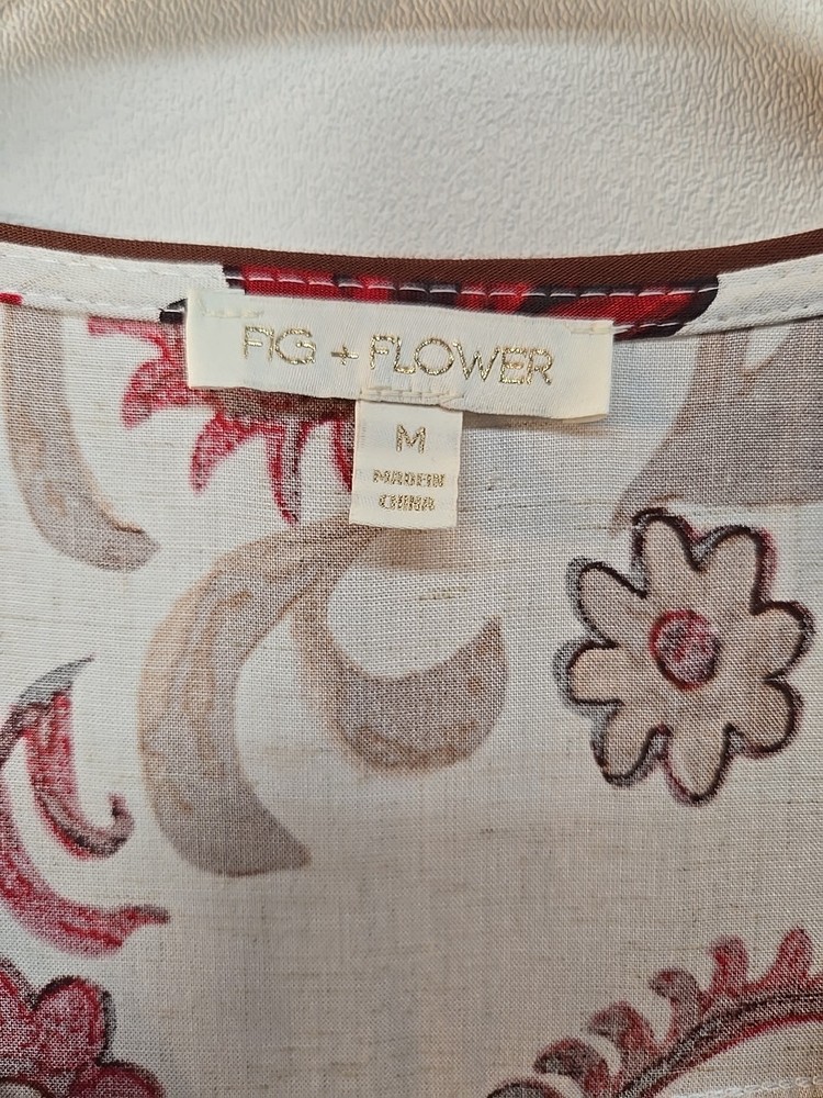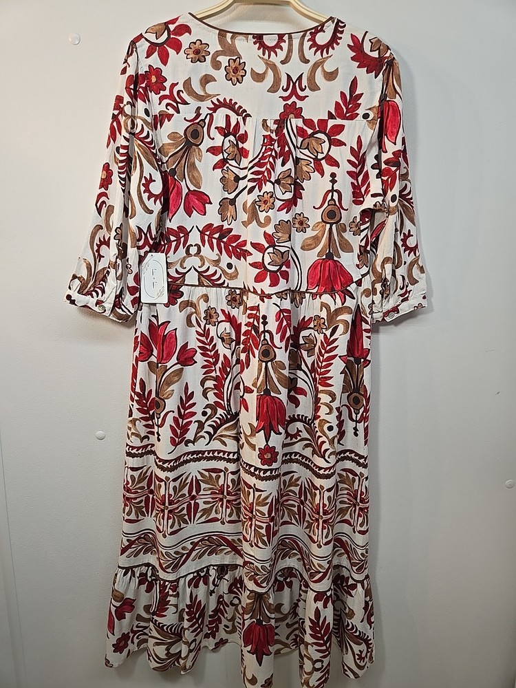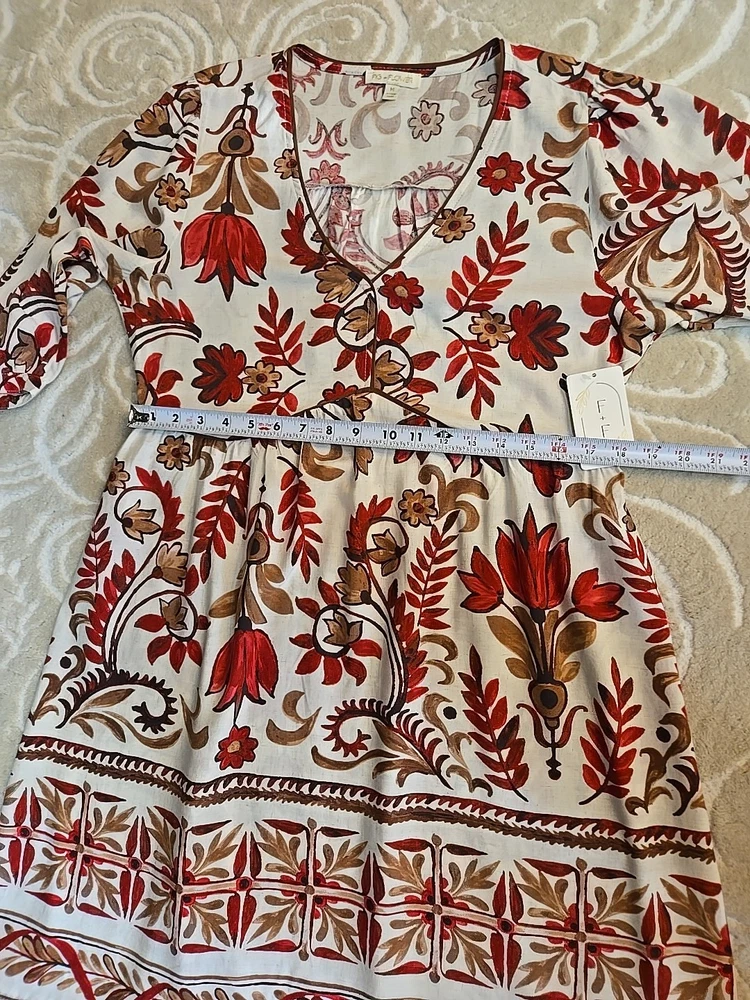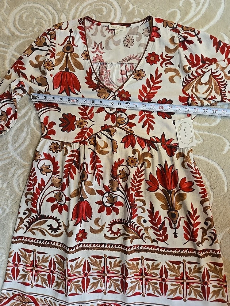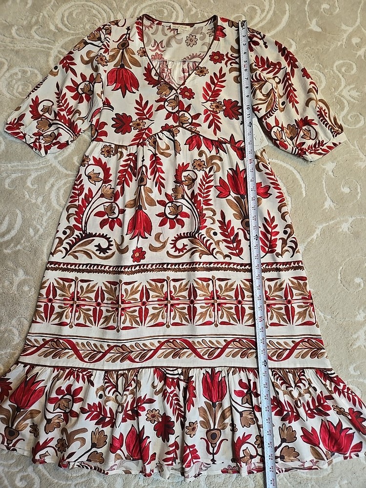 The NWT Anthropologie Fig And Flower Rayon Linen Floral Midi Dress in size M features a charming floral pattern, puff sleeves, and a V-neckline. This stylish dress is perfect for various occasions such as travel, parties, or casual wear. Made from a blend of 80% Rayon and 20% Linen, it is lightweight and machine washable for easy care. The dress also has a belted waist and features ruffle accents, making it a trendy choice for the warmer seasons of summer, fall, and spring. Designed by the brand Fig And Flower, this midi dress is a lovely addition to any woman's wardrobe. 80% Rayon, 20% Linen Machine Wash Cold Super cute and elegant Please see photos for measurements and details :)