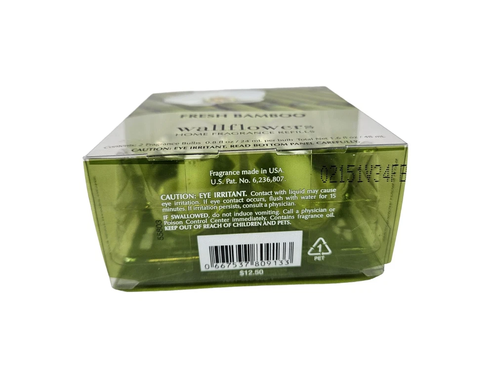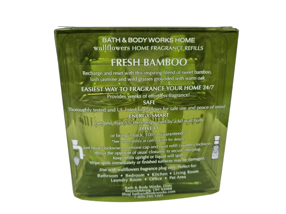 NWT Bath & Body Works Wallflowers Home Fragrance Refills Fresh Bamboo 2 Pack I51 New with tags NWT Bath & Body Works Wallflowers Home Fragrance Refills Fresh Bamboo 2 Pack. Recharge and reset with this inspiring blend of sweet bamboo, lush jasmine, and wild grasses grounded with warm oak Bath & Body Works Fresh Bamboo Wallflowers Home Fragrance Refills, 2-Pack (1.6 fl oz total) FRAGRANCE: Sweet Bamboo, Lush Jasmine, Wild Grasses grounded with Warm Oak. OVERVIEW: Fragrance that welcomes you home! Combine with your favorite Wallflowers Fragrance Plug, sold separately, to scent any room with noticeable fragrance for weeks and weeks. This item is new with tags, no defects. Only removed from box for pictures.