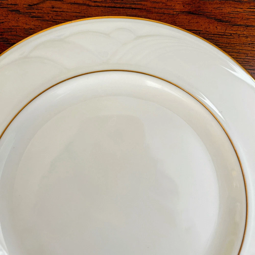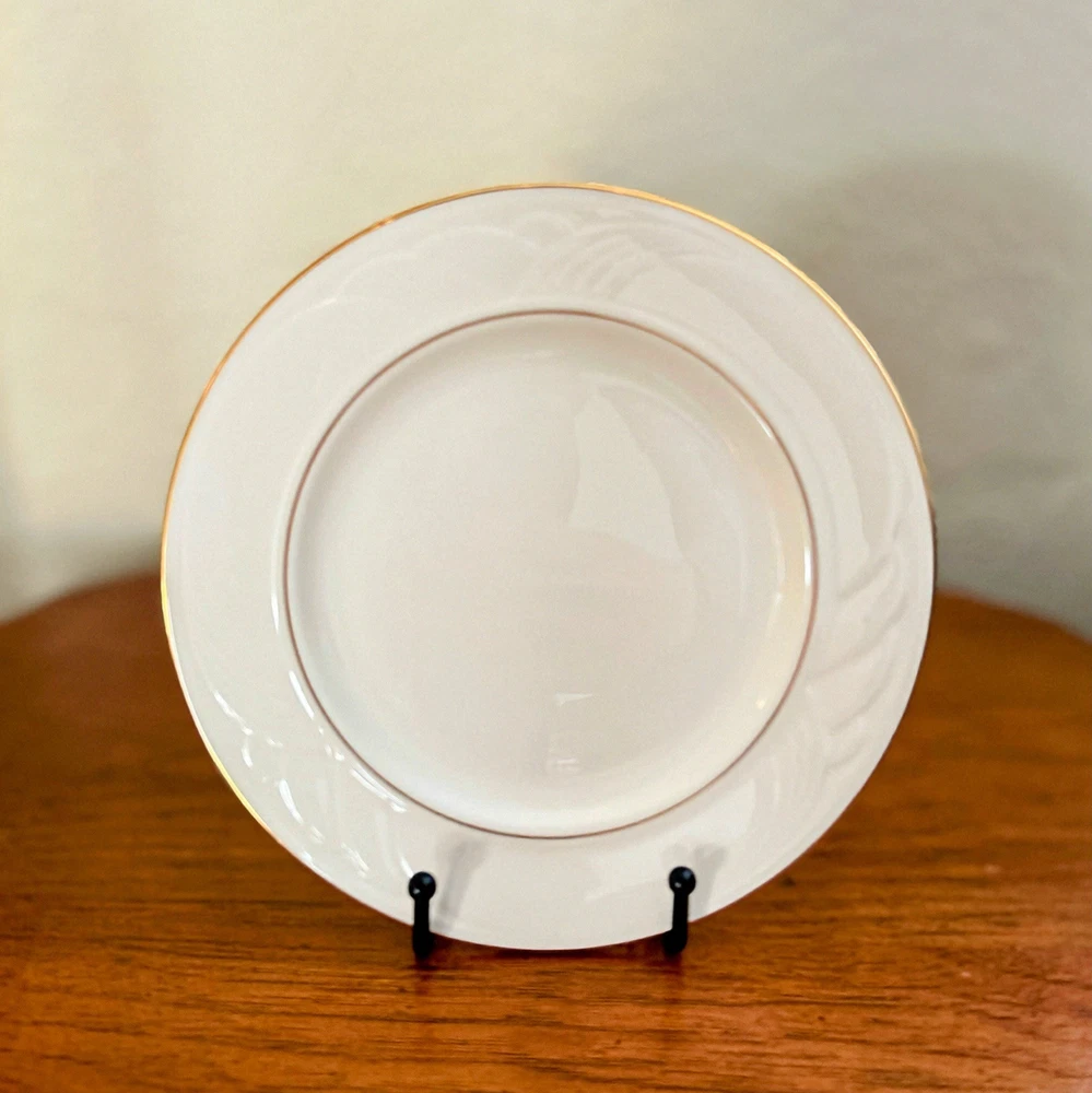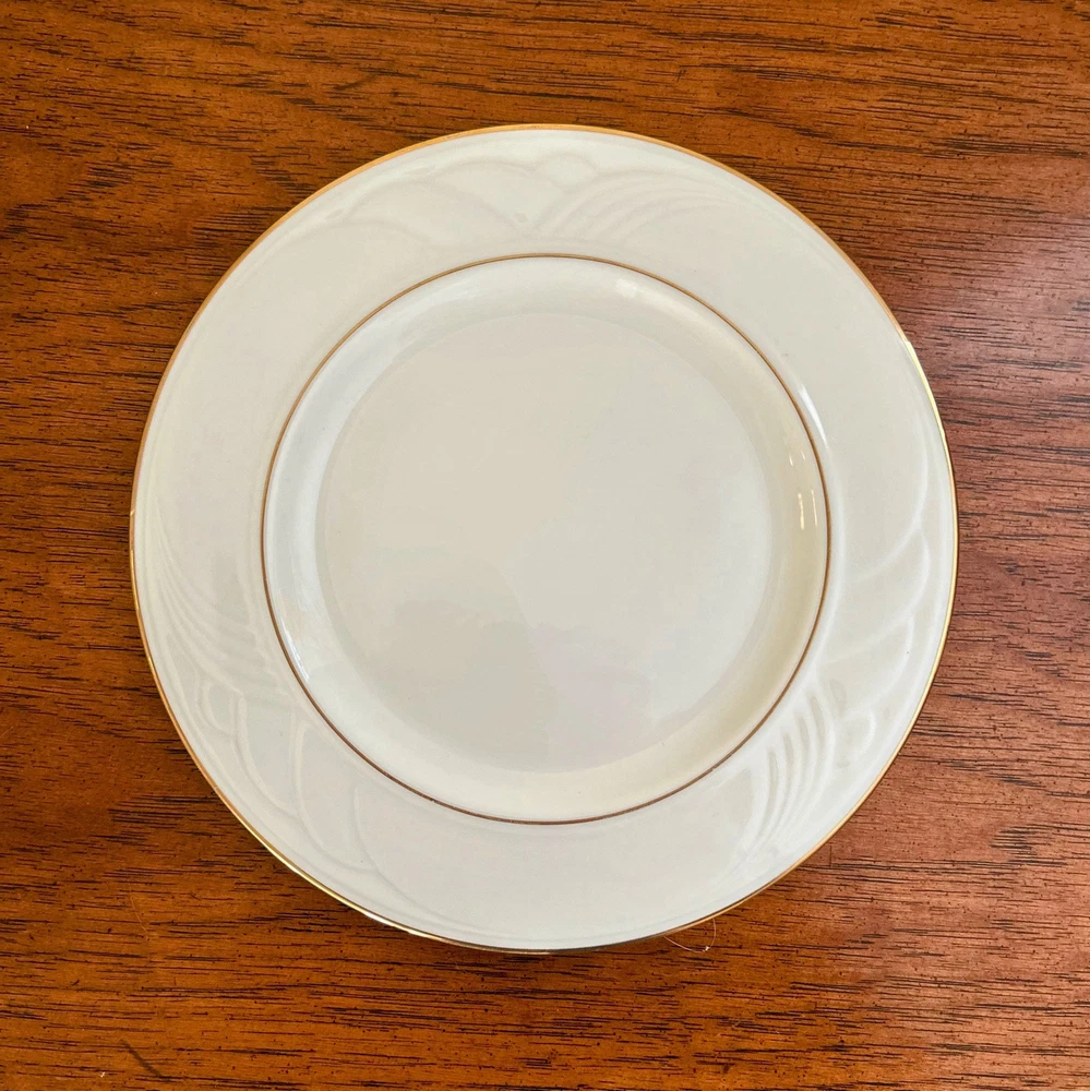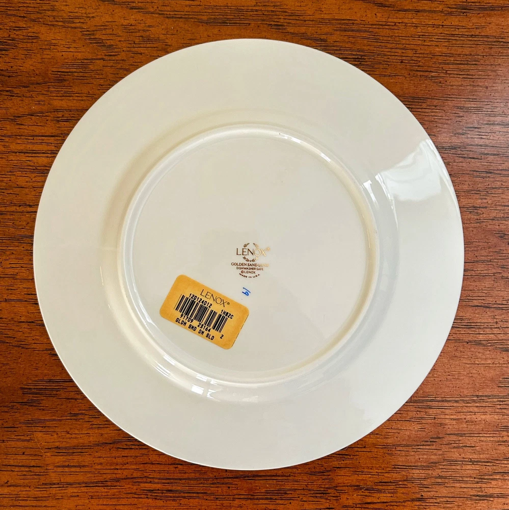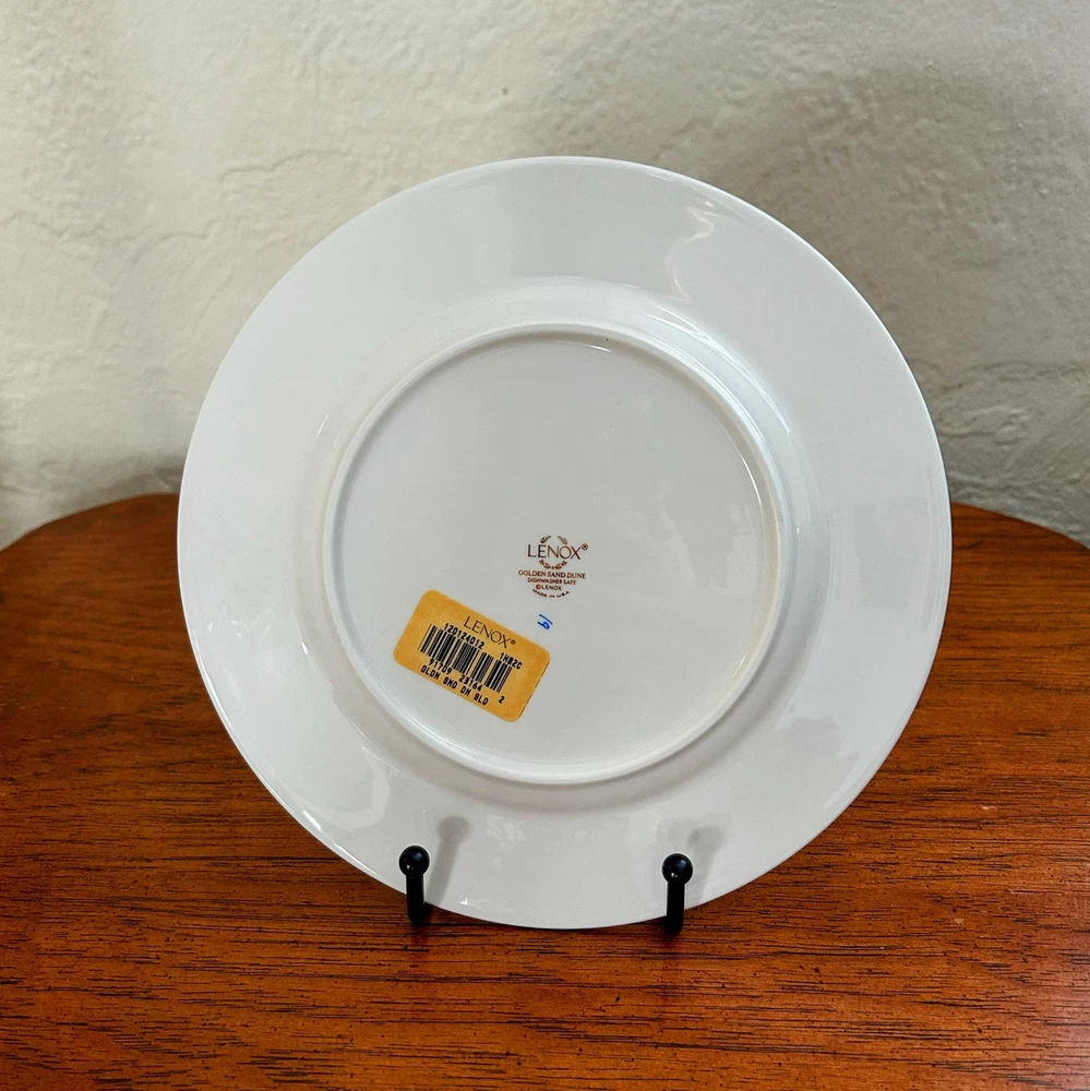 New and unused Lenox 'Golden Sand Dune' salad plate. It still has the sticker on the back. Ivory with embossed geometric design and gold accents on cream colored glossy porcelain. A lovely replacement piece if you've broken a plate or need to complete your set! Currently selling for $19.99 on Replacements.com. Measurements: 8.25" Diameter Condition: New with tag, completely flawless with no damage.