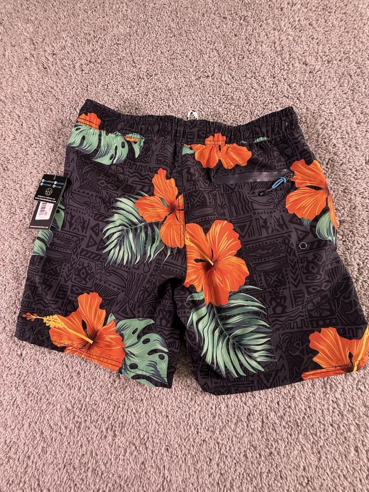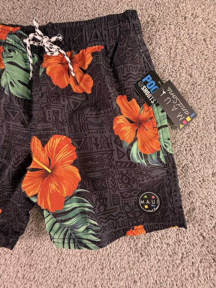 The NWT Maui and Sons Swim Trunks in Men’s Size Small are stylish swim bottoms featuring a floral pattern in various vibrant colors. Made of polyester material, these trunks are machine washable for easy care and maintenance. With a regular fit and a comfortable polyester lining, these swim trunks are perfect for men looking for a trendy and practical piece of swimwear for their next beach or pool outing. The Maui and Sons brand is known for its quality and attention to detail, making these swim trunks a great choice for any man's swimwear collection. 5000