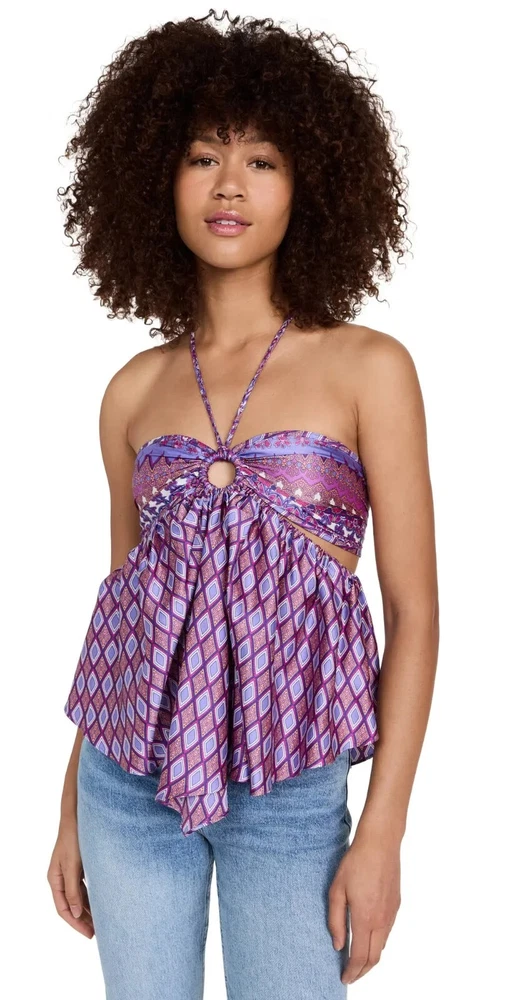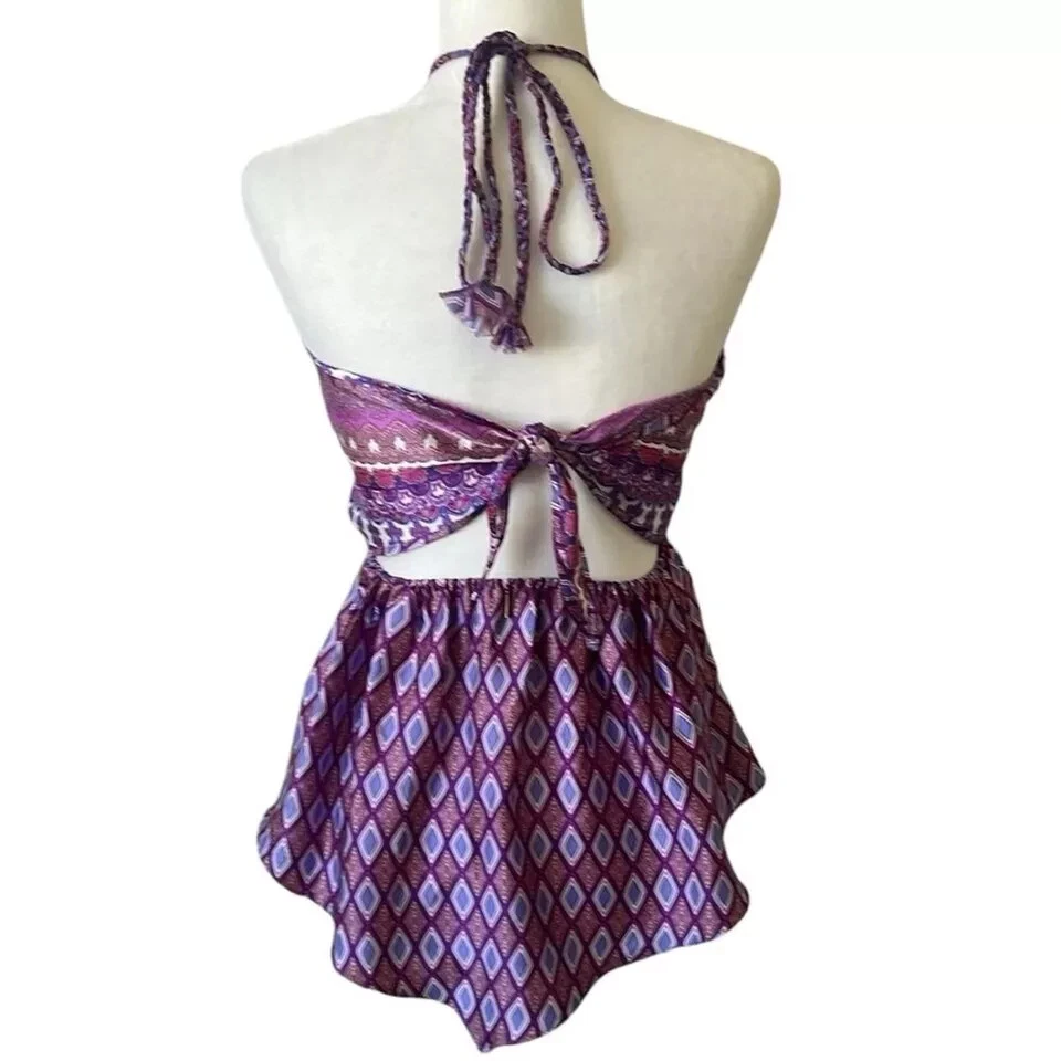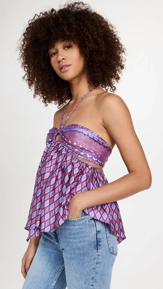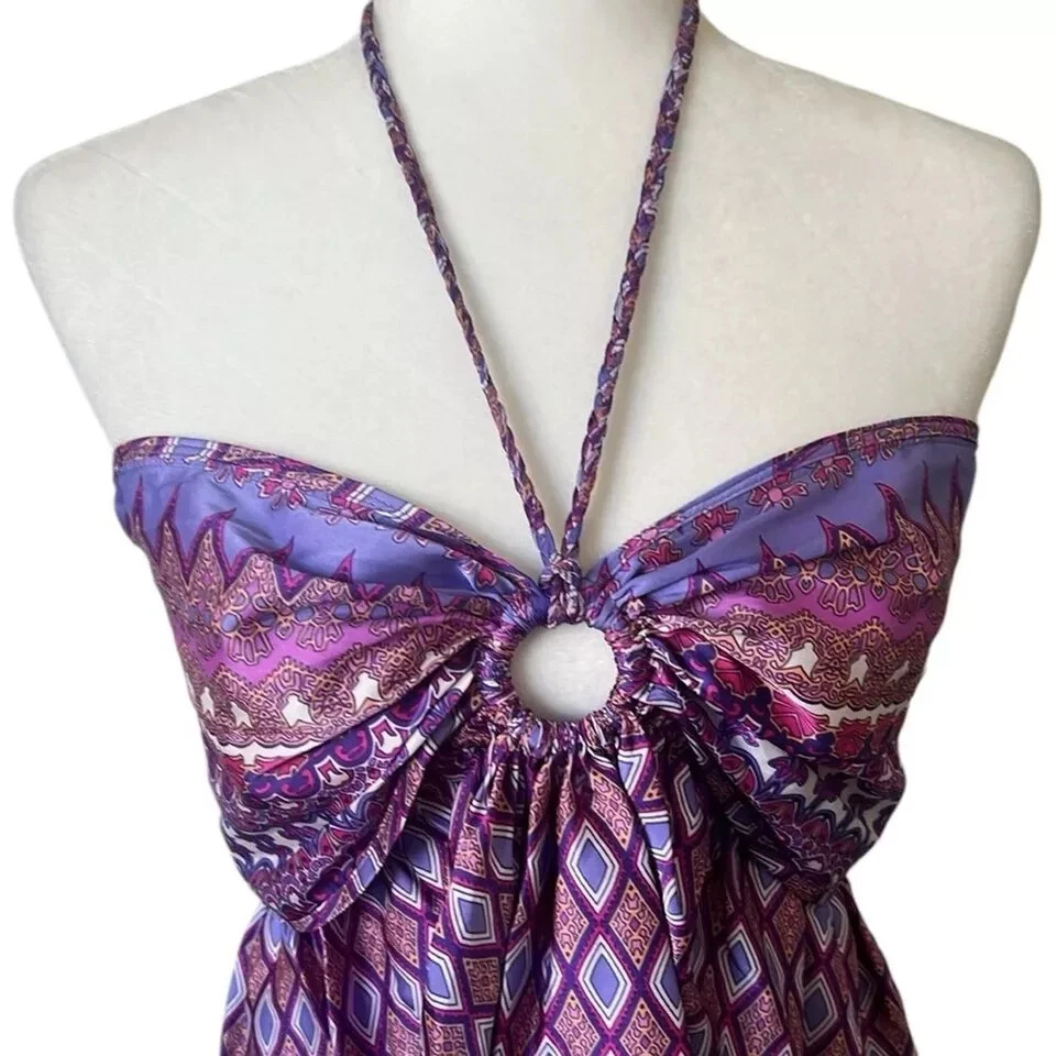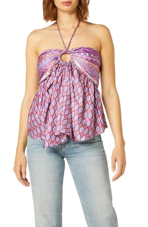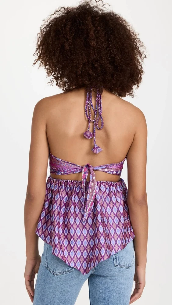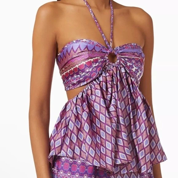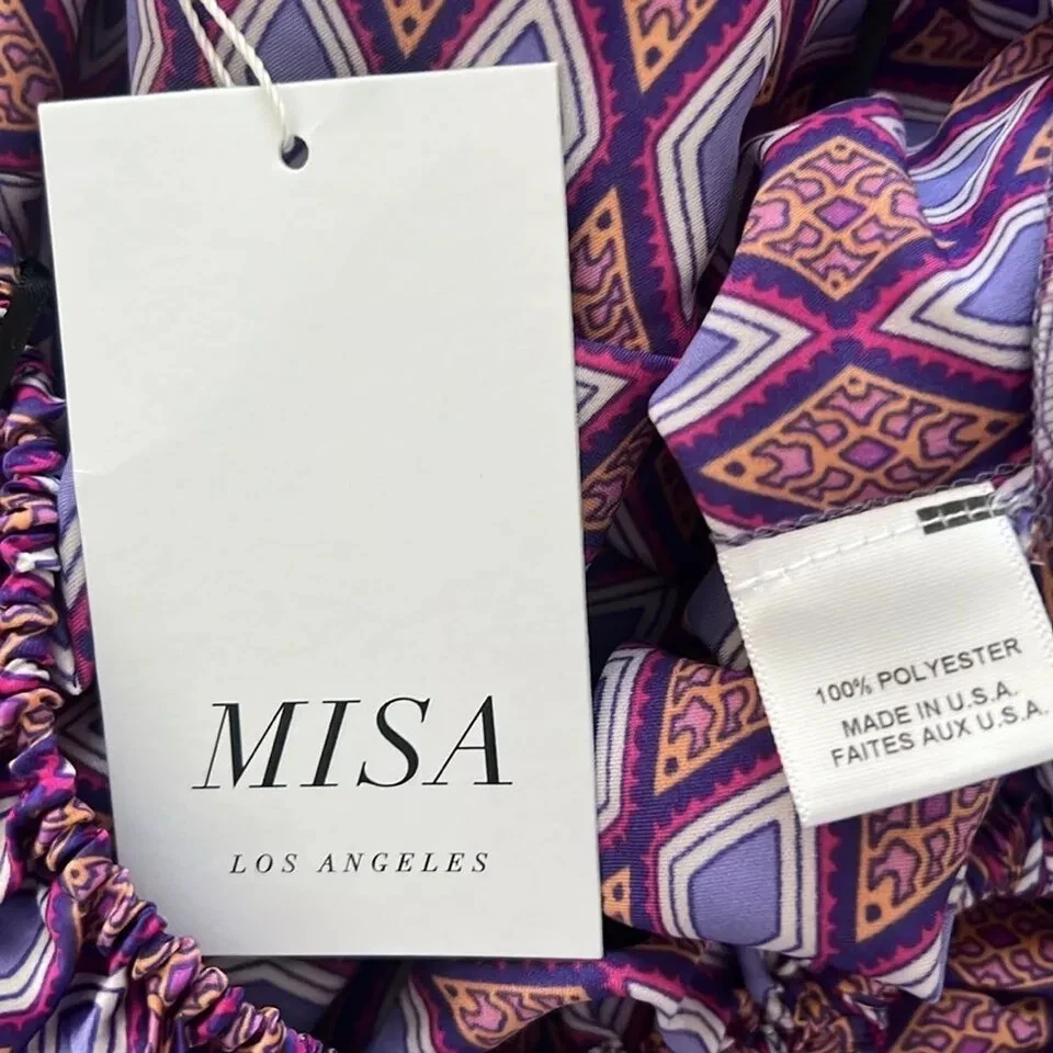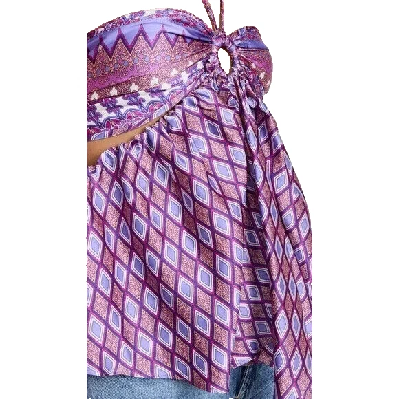 NWT Misa Los Angeles Violeta Scarf Halter Top Size Medium Reg. $320 Brand New with Tags • Sweetheart neckline and braided halter straps • Non-slip rubber binding at top hem • Open back with adjustable self-ties • Keyhole cutout at front • Geometric print • 100% polyester • Lightweight, non-stretch satin • Dry clean