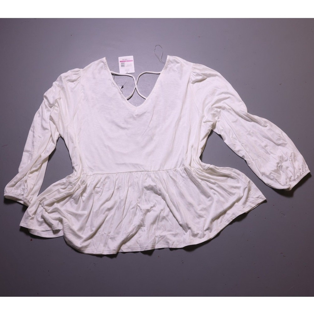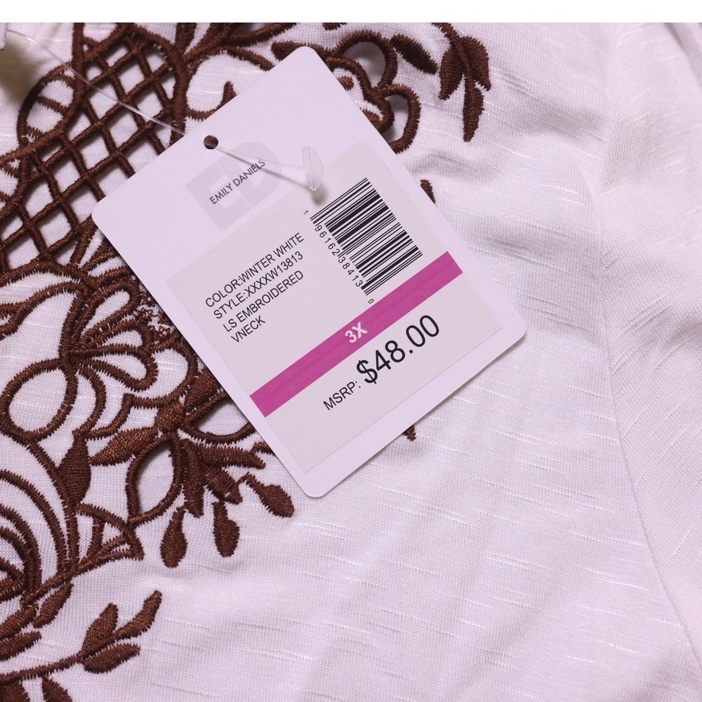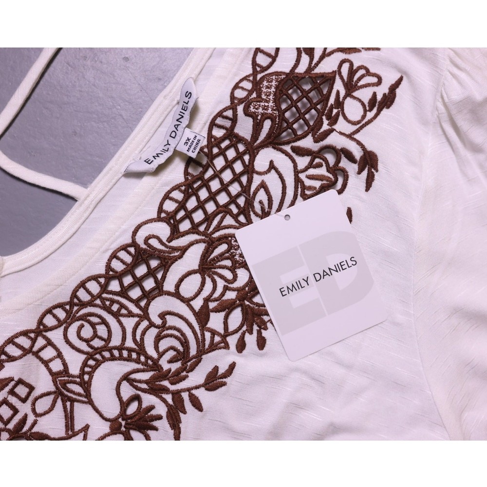 Brand new with tags white peplum v neck blouse with back strappy detail, brown floral embroidered design on the front, long sleeve. Women's plus size 3X. original price: $48 style code: XXXXW13813 color: winter white boho, bohemian, peasant top, tunic, blouse, crisscross detail, festival style, westerm, 2000s boutique, free people dupe, cottagecore, folk, embroidered, flowy, spring, plus size fashion, coastal cowgirl
