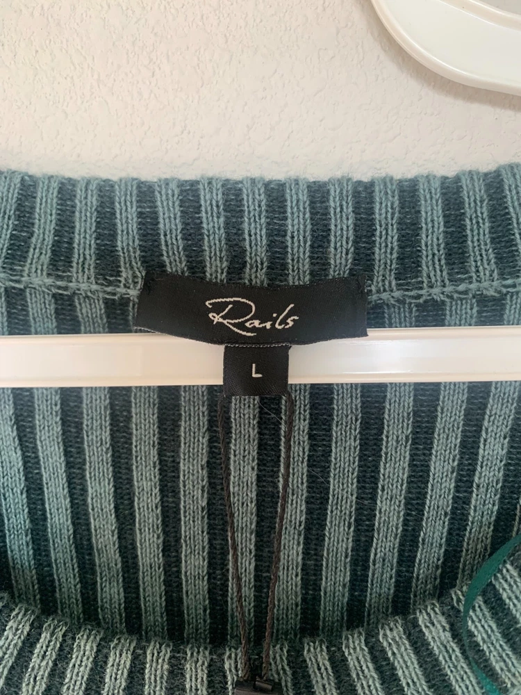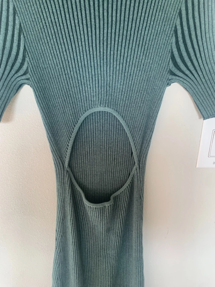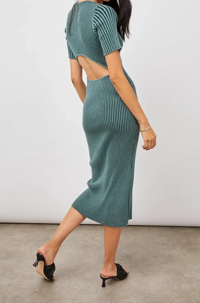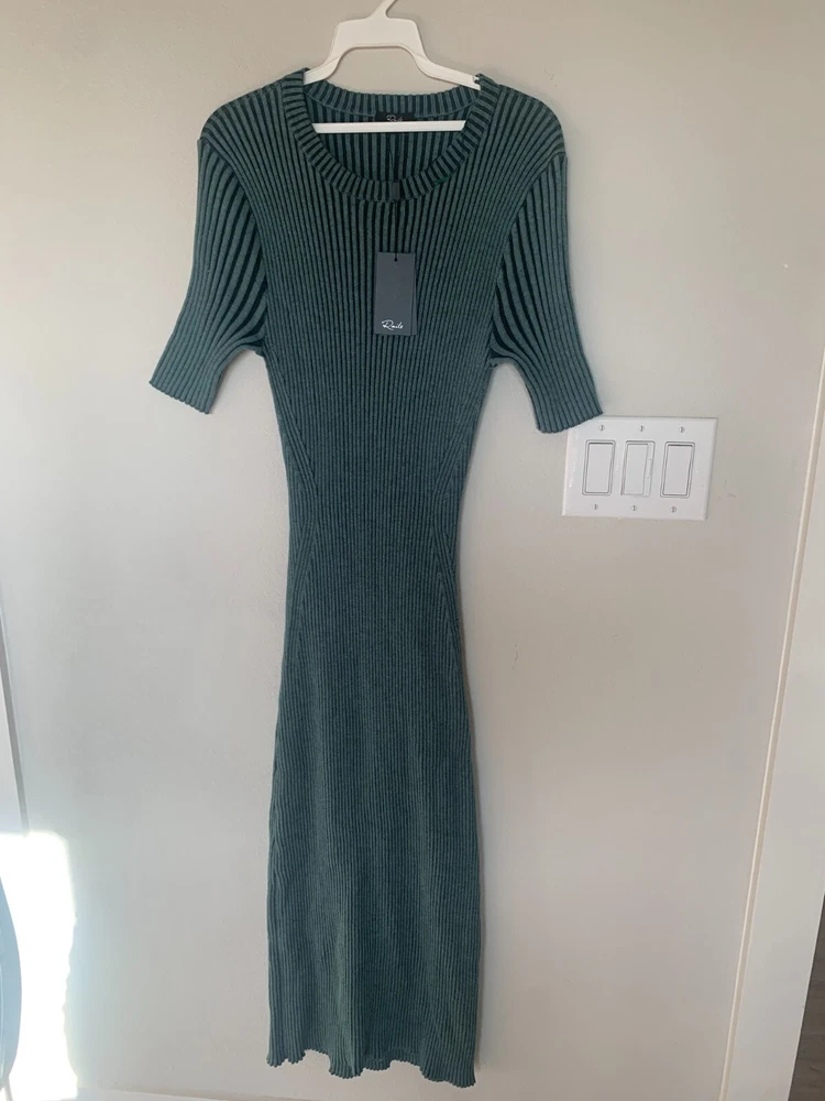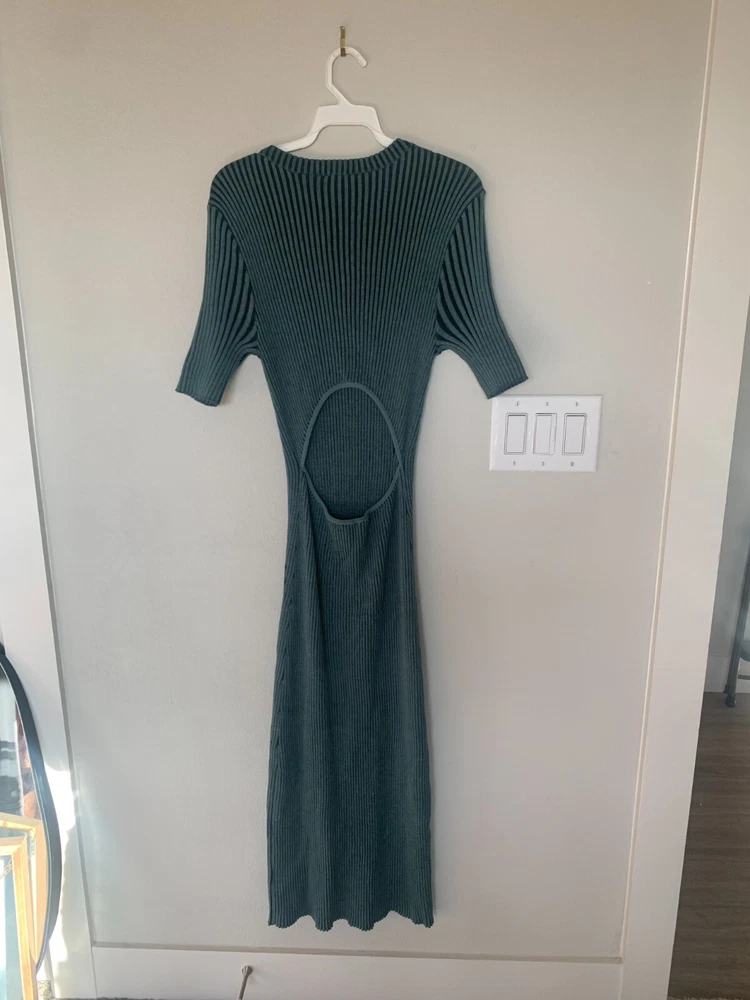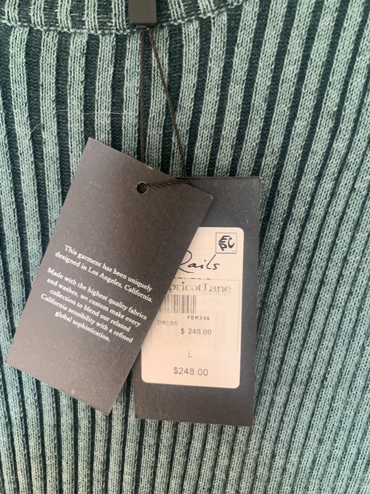NWT! This flattering pullover dress is the perfect elevated take on comfortable, effortless dressing. A super soft, two tone ribbed knit crewneck midi-length dress featuring a low cut-out detail at back.95% BCI Cotton | 5% Cashmere. Body Length: 46 1/2"Dry Clean. Cool Iron If Needed. Do Not Bleach.