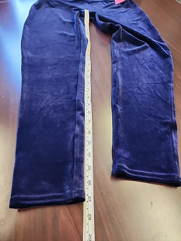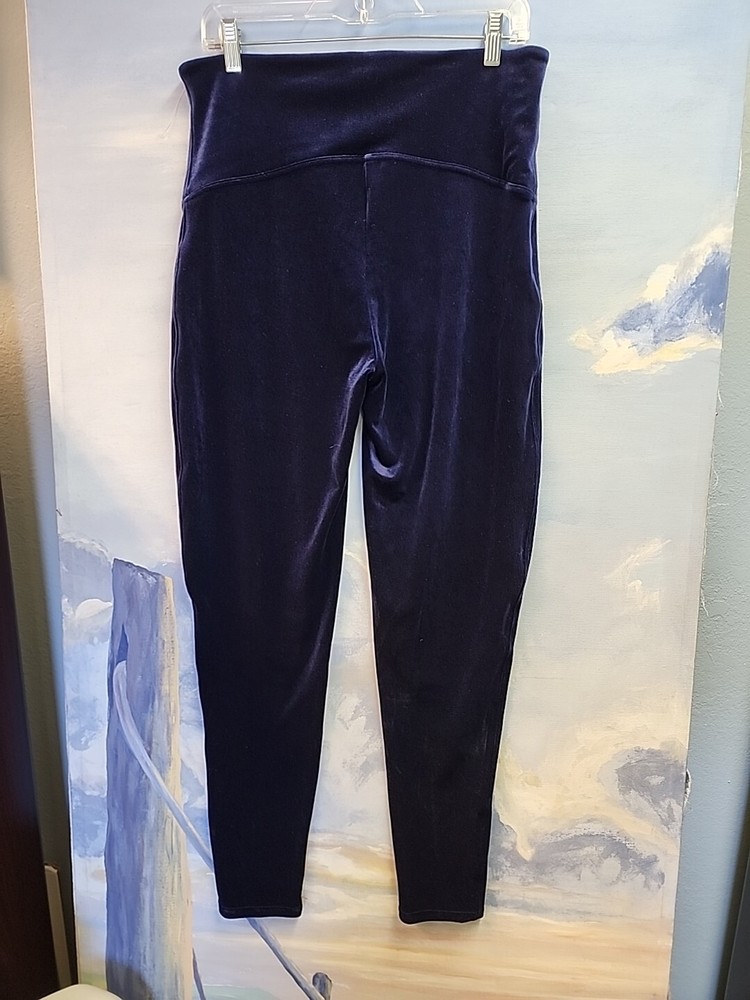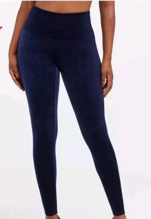This NWT Spanx leggings in size 2XL are crafted in a luxurious navy blue velvet fabric, featuring a high rise waist with a 32-inch (un-stretched) waist size. The leggings offer a slimming and shaping fit with stretch capabilities, perfect for various occasions such as travel, parties, or casual outings. Ideal for winter, fall, or spring, these ankle-length leggings from the Spanx by Sara Blakely collection are designed for comfort and style, suitable for activities like walking, dancing, or yoga.