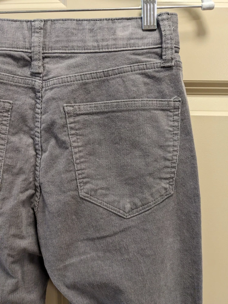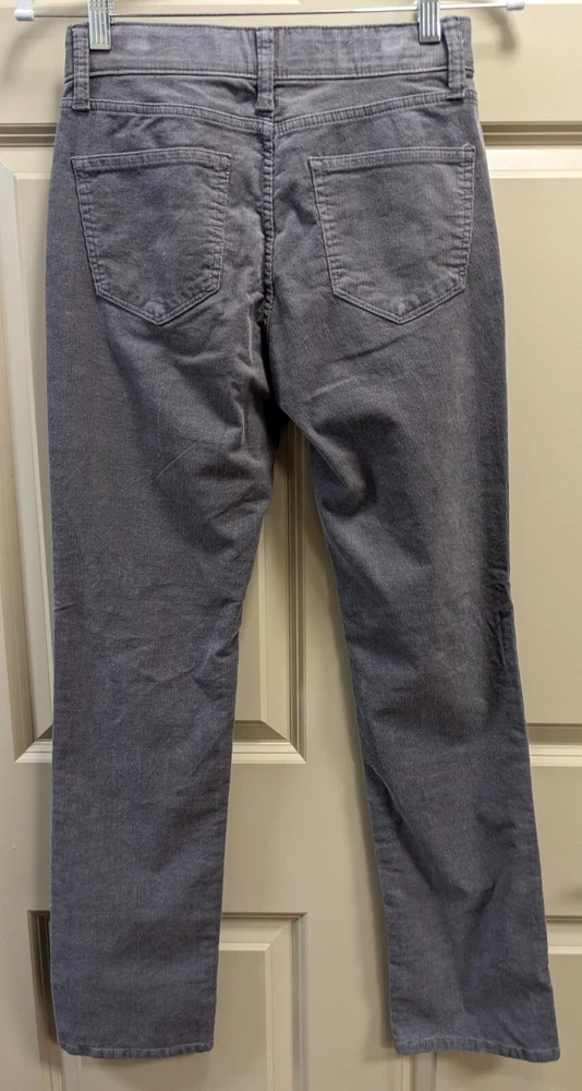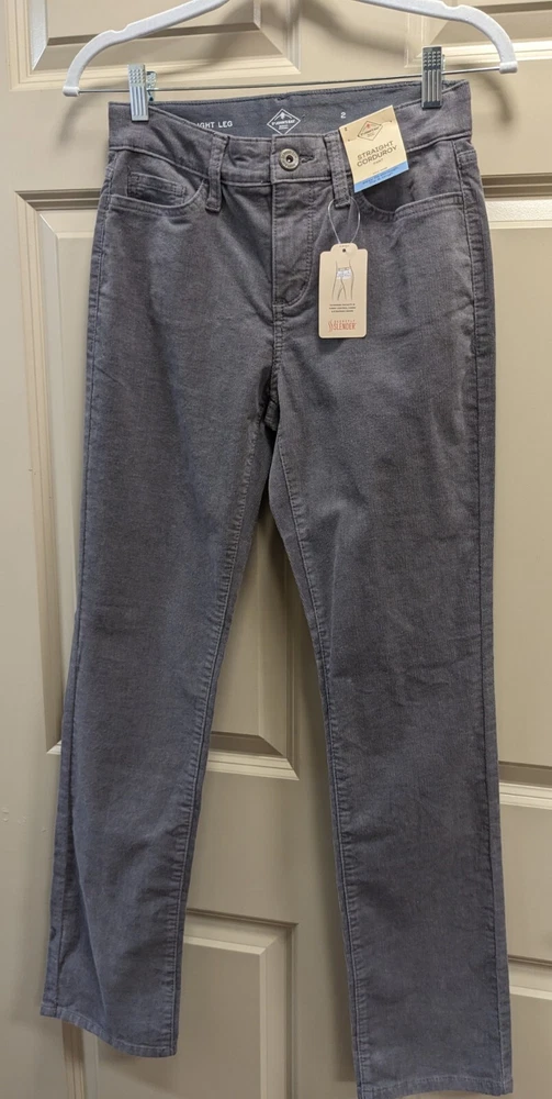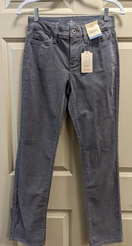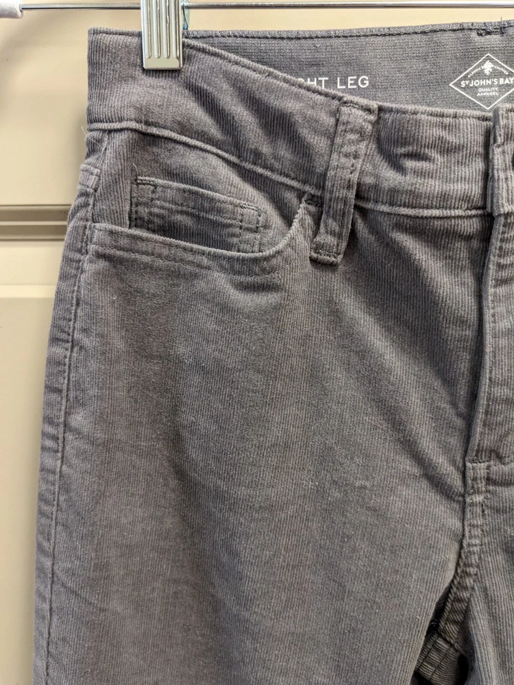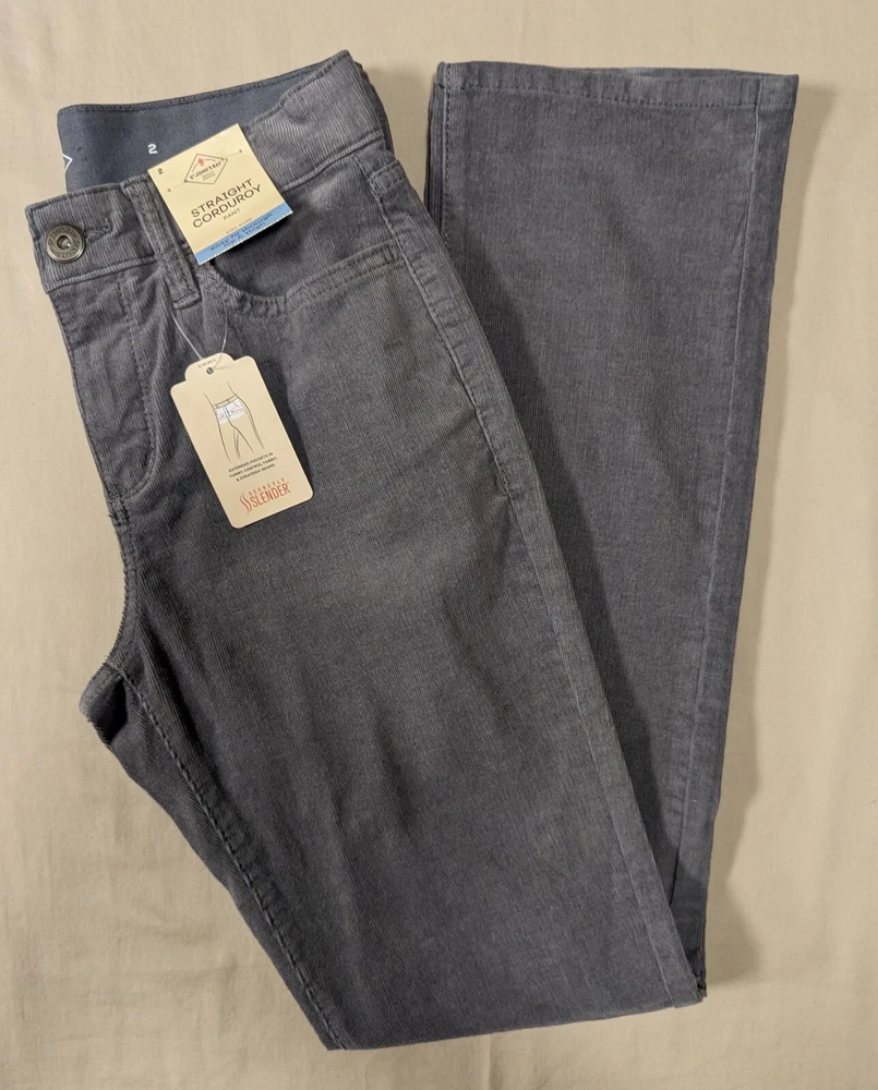 NWT: St. John's Bay Gray Straight Leg Corduroy Pants - Size 2, midrise, easy fit through hip and thigh wide comfortable waistband, hidden elastic waistband in back adds extra comfort with no gap, extended pockets and tummy control fabric and strategic seams are slimming, soft fine wale corduroy, five pocket design, button / zipper front closure. 75% cotton, 23% polyester, 2% spandex. MSRP $46 Measurements: Waist laid flat - 14 in Length-41 in Inseam - 31 in **Please note I have several other pairs of the same pants in different colors for sale. Message me if interested in combining for a discount on price and combined shipping.