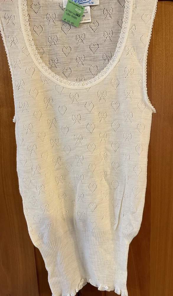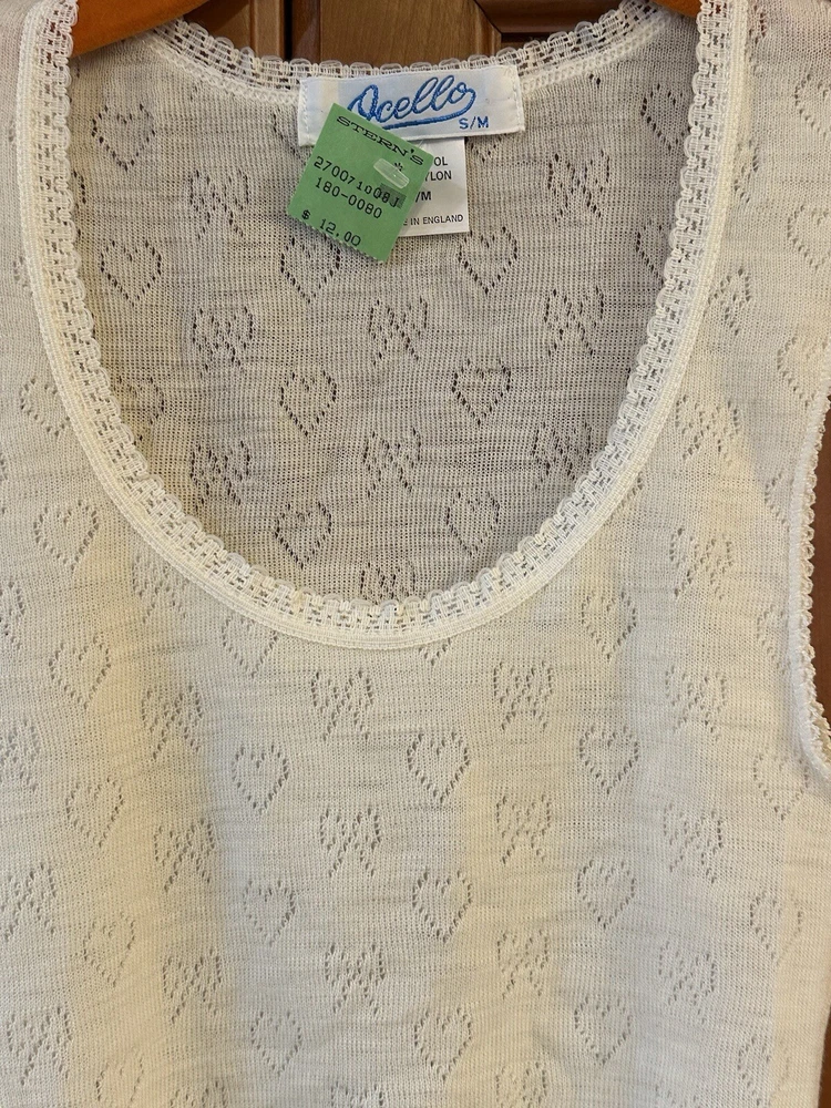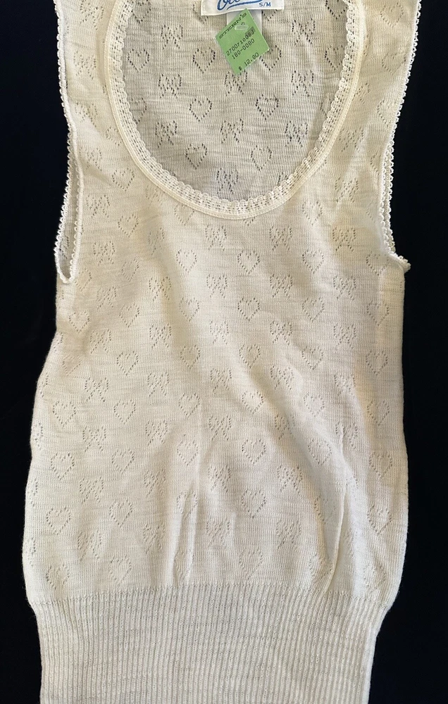 Add a touch of vintage charm to your wardrobe with this fine Ocello 80s women's undershirt. Featuring a heart knit design and a ribbed waistline, this knit tank top is perfect for casual occasions in fall, winter, or spring. The soft warm fabric and casual sleeve type provide comfort and ease of wear, while the pullover closure and round neckline add a classic touch. Made of a combination of wool and nylon, this tank top is machine washable and easy to care for. The ivory color and Sleeveless design make it a versatile addition to any outfit. This 70s and 80s themed top is perfect for women who want to add a touch of retro style to their wardrobe.